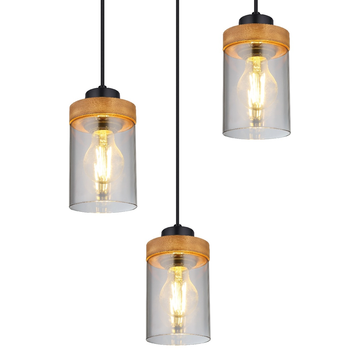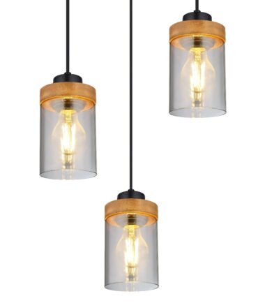 Ova prelepa visilica inspiriše sjajnim dizajnom. Tri E27 grla vise na crnim kablovima do 1,5 metara od plafona i završavaju se okruglom crnom mat bazom (Ø39cm). Na E27 grlima se nalazi cilindrični abažur u boji dima i ukrasima od drveta. Grla E27 vam omogućavaju da koristite sijalice po vašem izboru, do maksimalne snage od 60 vati.
