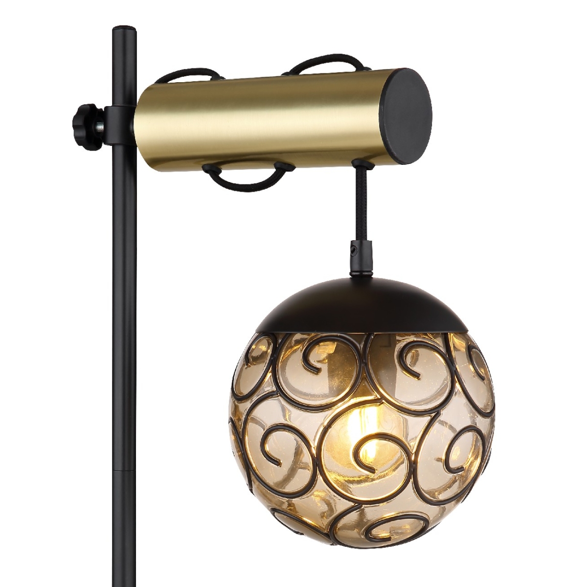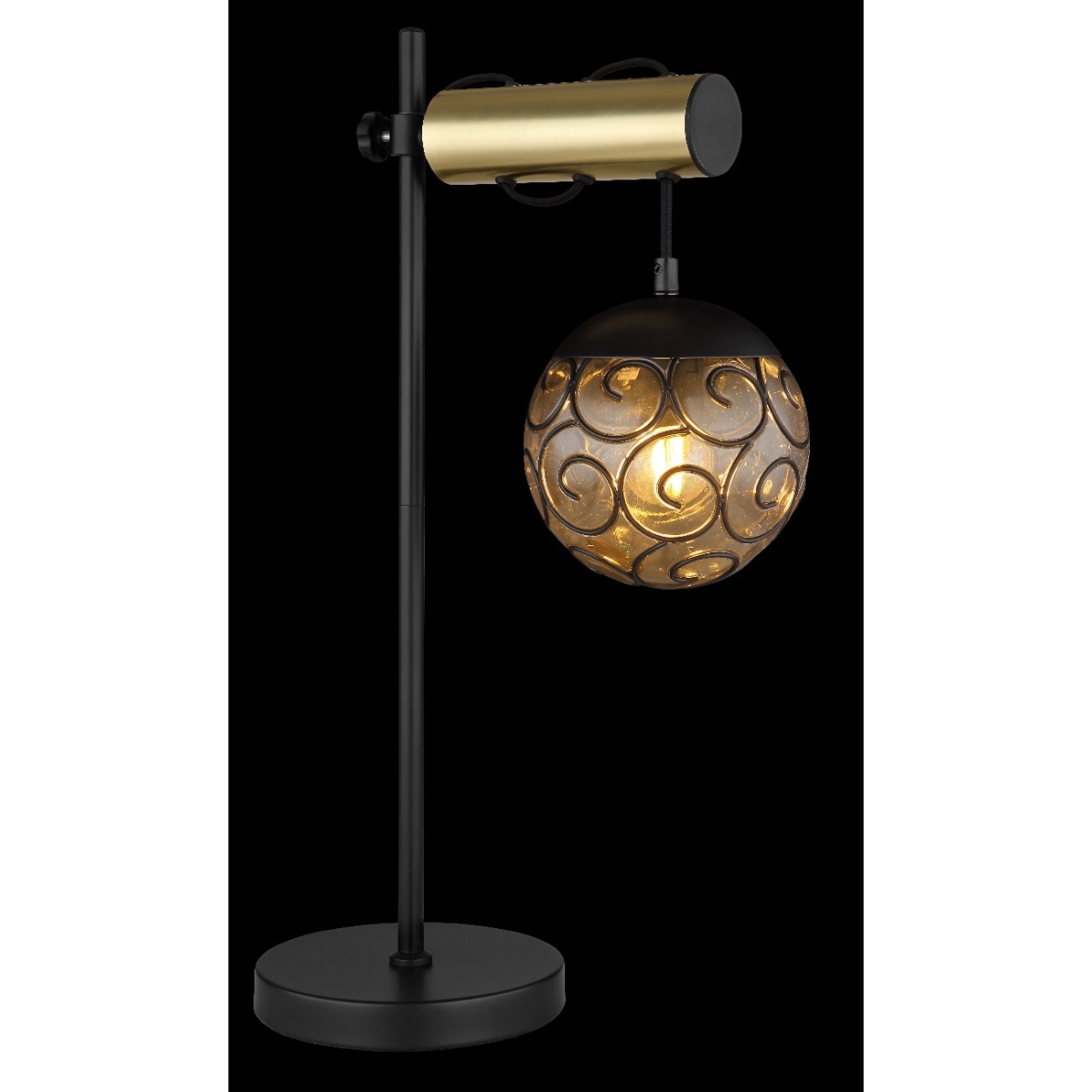 Ova prelepa stona lampa inspiriše sjajnim dizajnom. 55cm dugačka crna mat metalna šipka prodire iz okrugle baze, na kojoj postoji visinski podesiva grana boje zlata. Na ovoj grani visi E27 LED grlo čija visina može da se podesi pomoću kabla i obavijeno je oblikovanim ukrasnim staklenim abažurom. Grlo E27 vam pruža mogućnost da se odlučite za boju svetla i jačinu do maksimalnog izlaza od 9 vati.