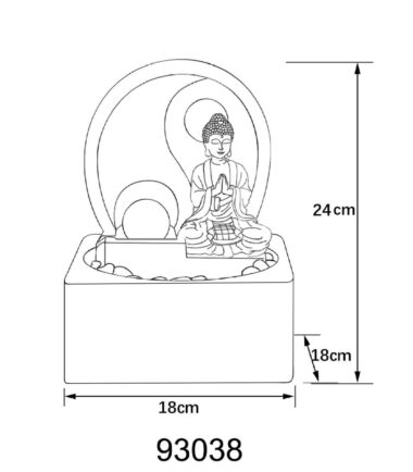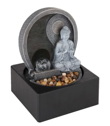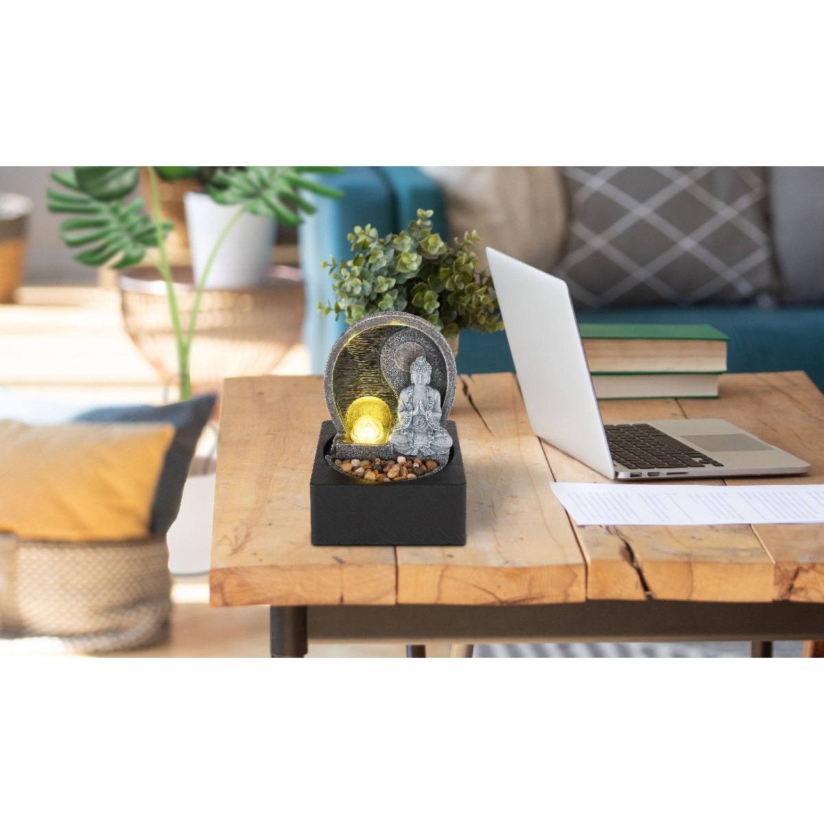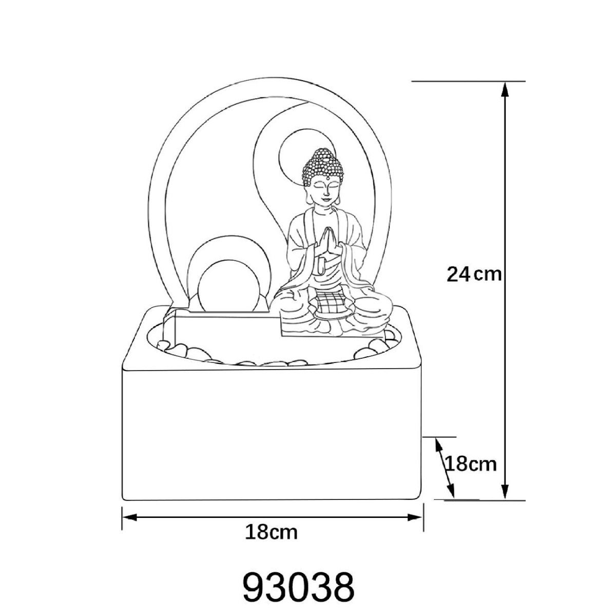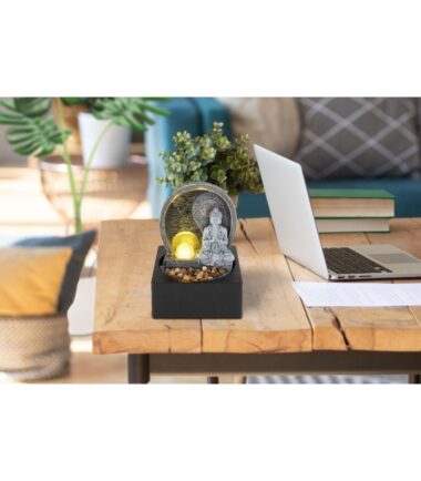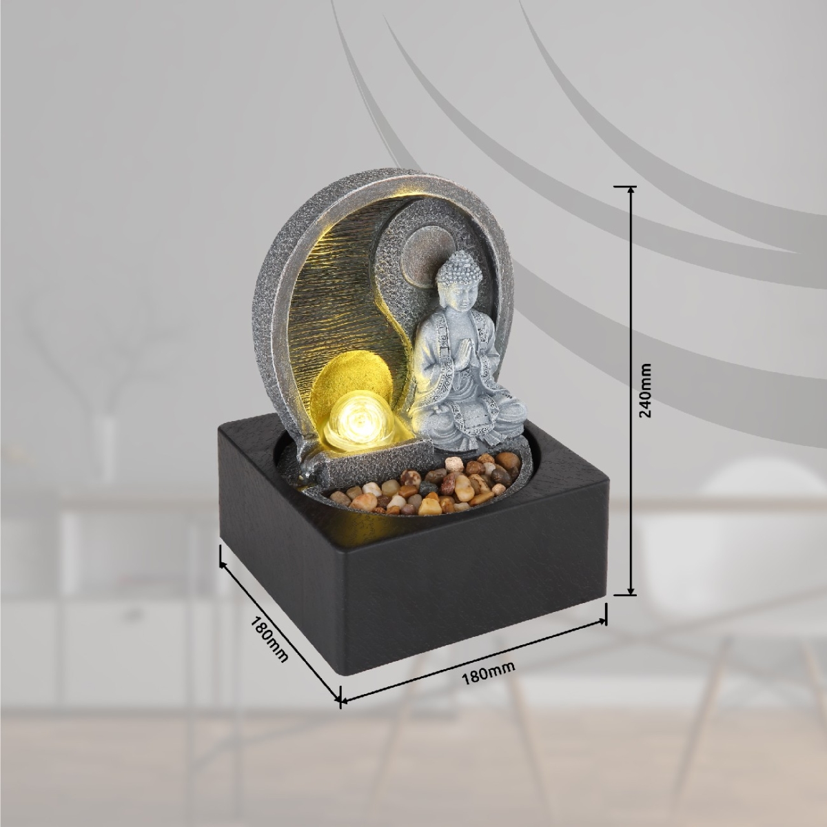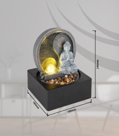 Ova ukrasna stona lampa serije FONTANA stvara smirujuću atmosferu prskanjem vode i znakom Jin i Jang pored Budine statue. Iz male lopte pored Budine statue emituje se prijatno toplo belo LED svetlo (3000 Kelvin) i dodatno je ukrašeno kamenim krevetom.