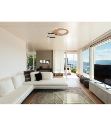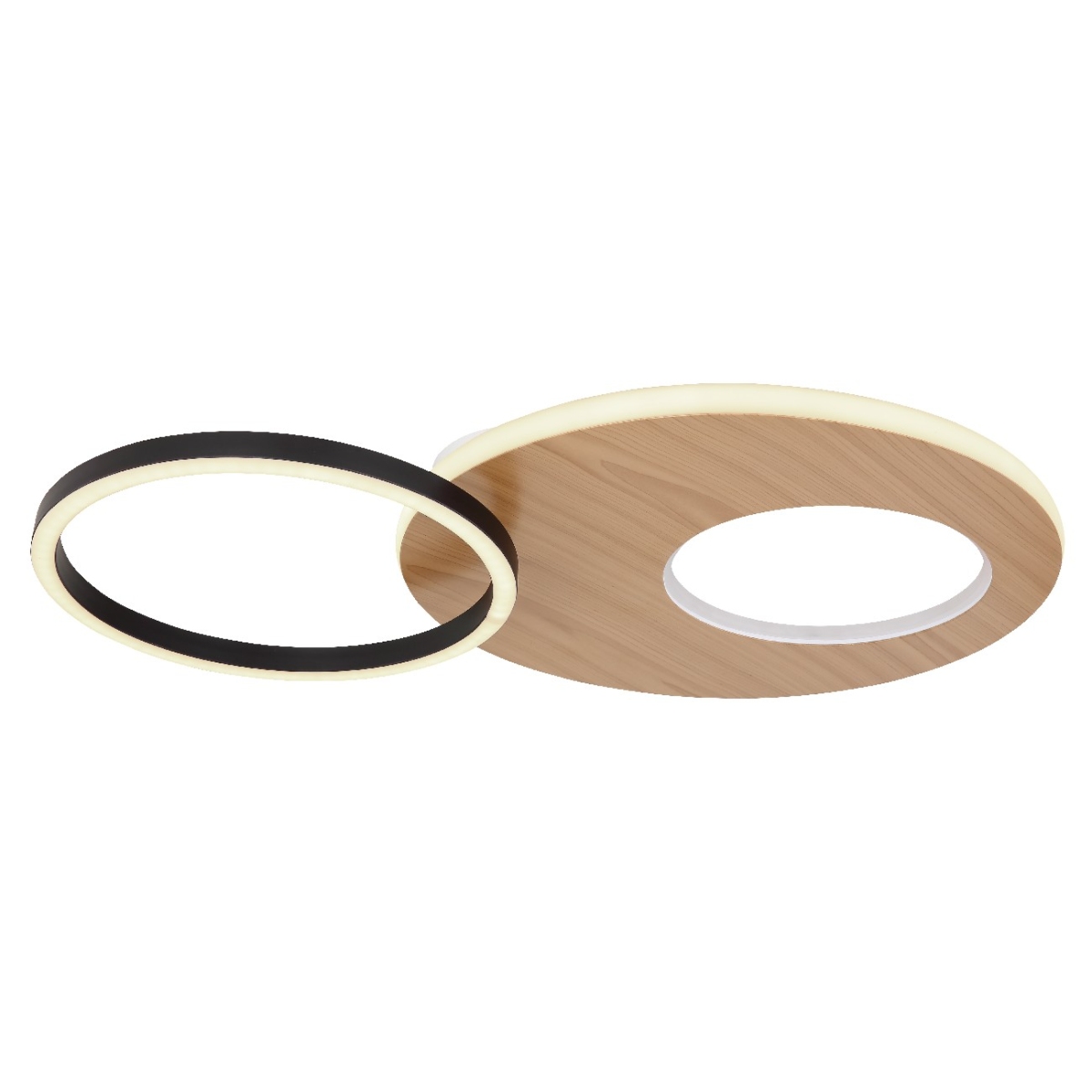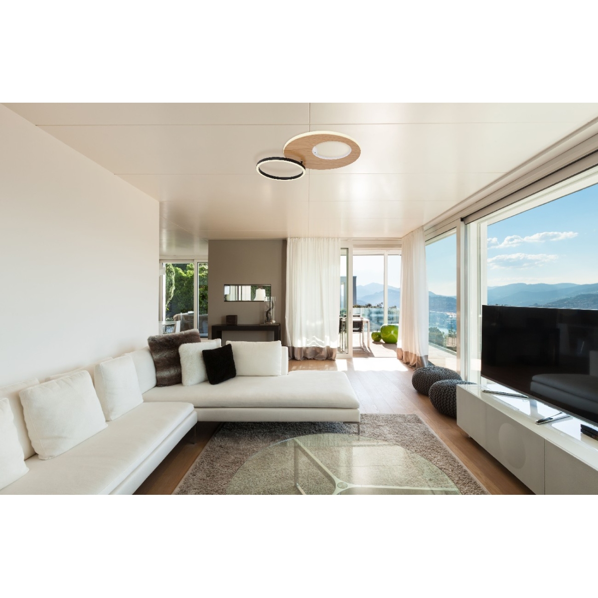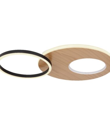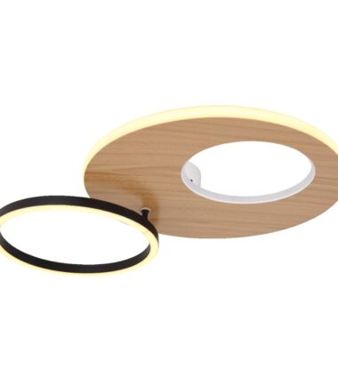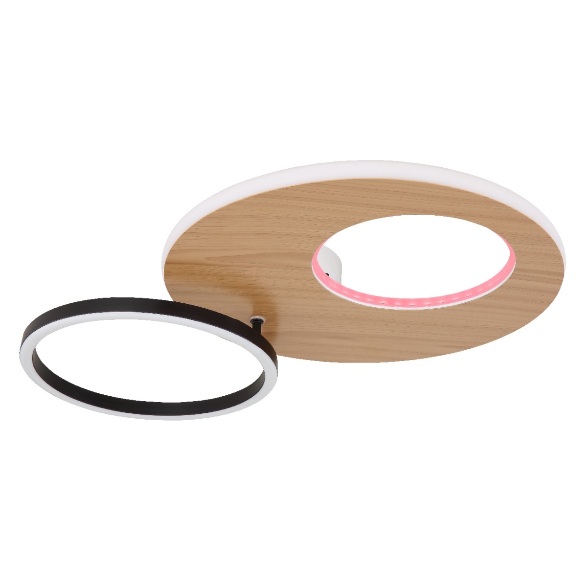 Ova moderna plafonska lampa FORSI serije kombinuje belo mat metalno kućište sa tamnim drvenim izgledom i crnim metalnim elementima. Svetlo se može zatamniti i može se regulisati osvetljenost u nekoliko nivoa preko zidnog prekidača. Boje se mogu fiksirati, a dostupni su i RGB menjač boja koji fiksira boje i efekat duge. Funkcija memorije se može koristiti za čuvanje poslednjeg podešavanja. Lampa se može rotirati i okrenuti i dolazi sa daljinskim upravljačem i baterijama. Dimenzije 612x400x105mm i dva prstena (prečnika 28 i 40 cm), lampa je pogodna za raznovrsne sobe. Integrisani LED-i imaju snagu od 21W i proizvode jačinu od 280-2800 lumena (u zavisnosti od postavke) i temperaturu boje od 3000-6500K. Takođe je integrisan dodatni RGB LED sa 3W.