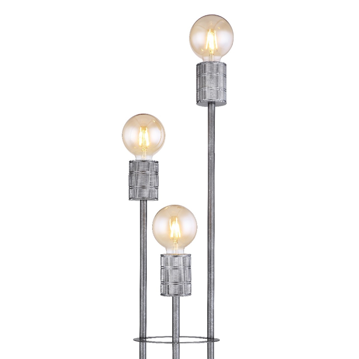 Ova podna lampa serije FREDDY (ø 25 cm) je divan dodatak vašem enterijeru. Metalna podloga srebrne boje daje podnoj lampi (visina 143 cm) savršenu stabilnost i opremljena je sa tri metalne grane srebrne boje različitih veličina, koje se drže zajedno iznad prstena. Podna lampa ima tri E27 grla uokvirena srebrno-metalik zatamnjenim aluminijumom, koja možete opremiti odgovarajućim sijalicama po vašem izboru. To vam daje mogućnost da u skladu sa svojim idejama odredite boju svetla i jačinu. Sa ostalim modelima iste serije možete upotpuniti celokupnu sliku u svom domu i obezbedite elegantan ambijent.