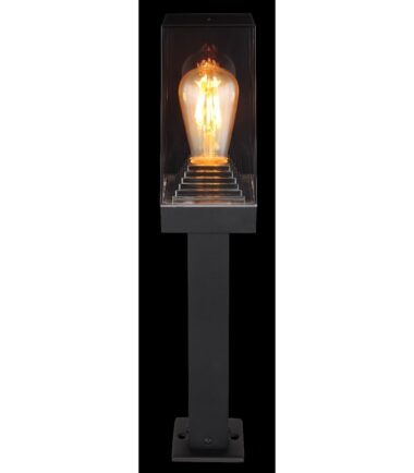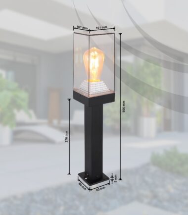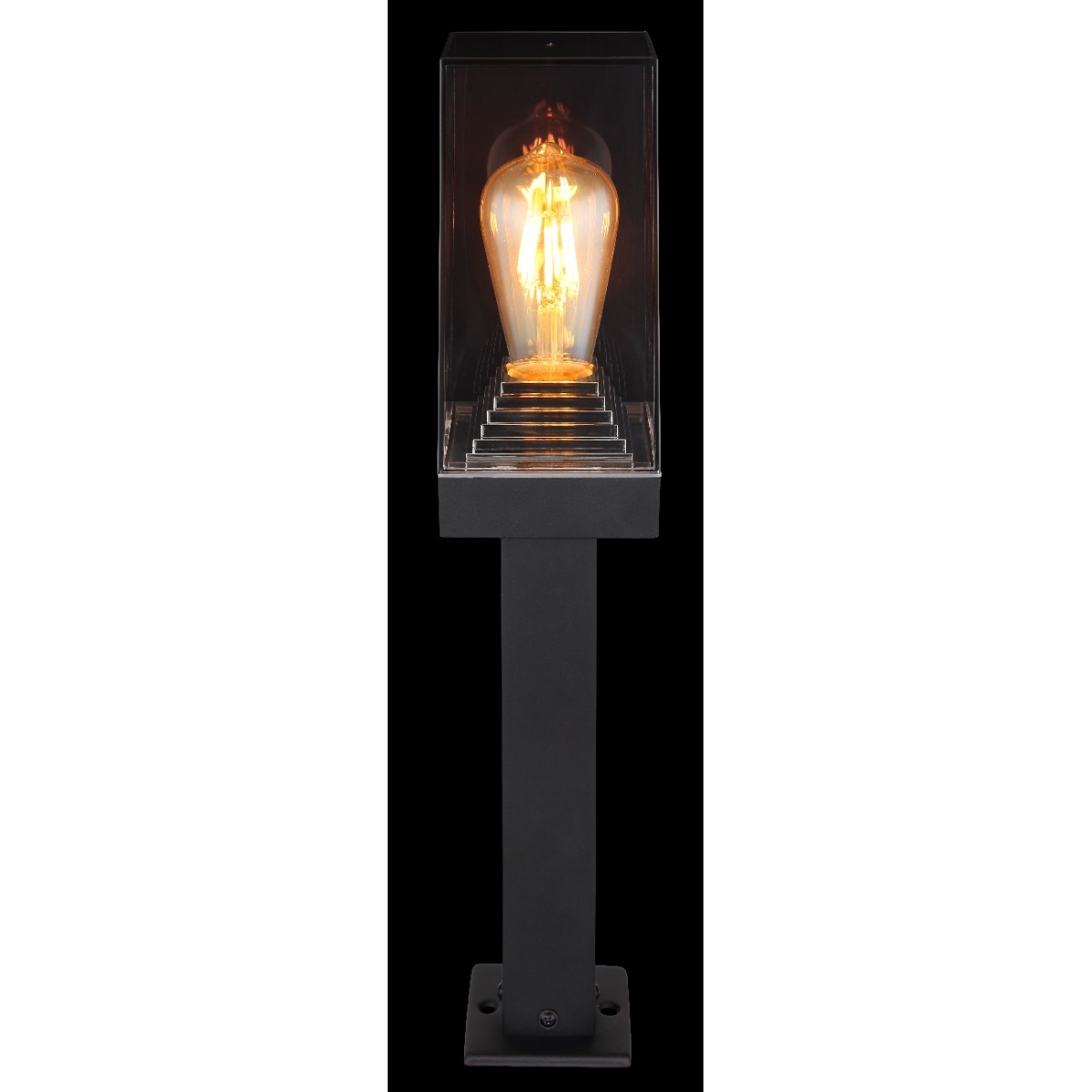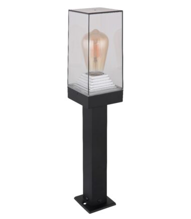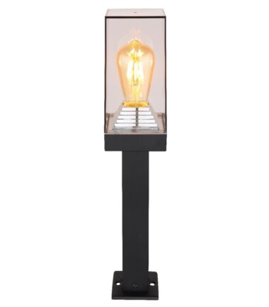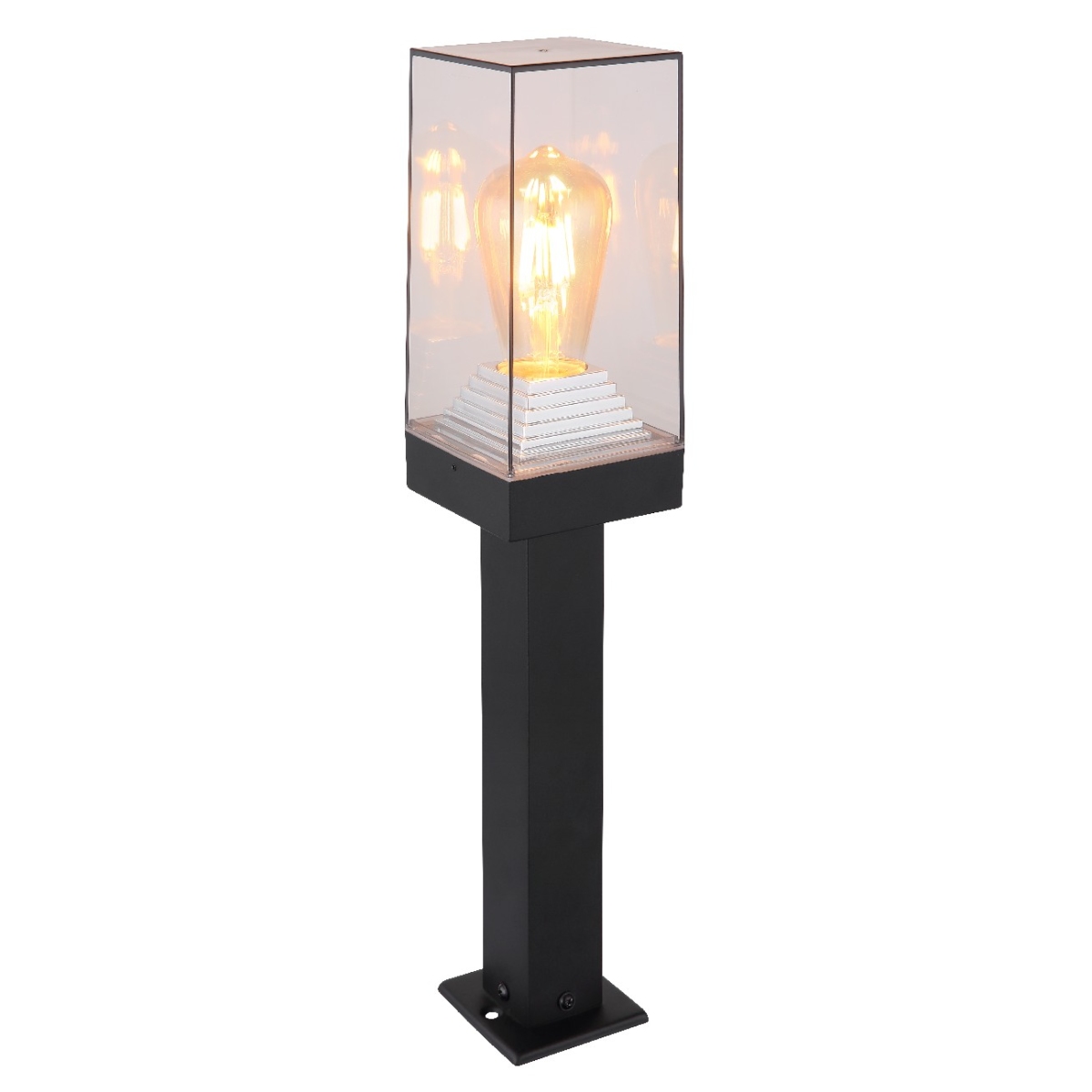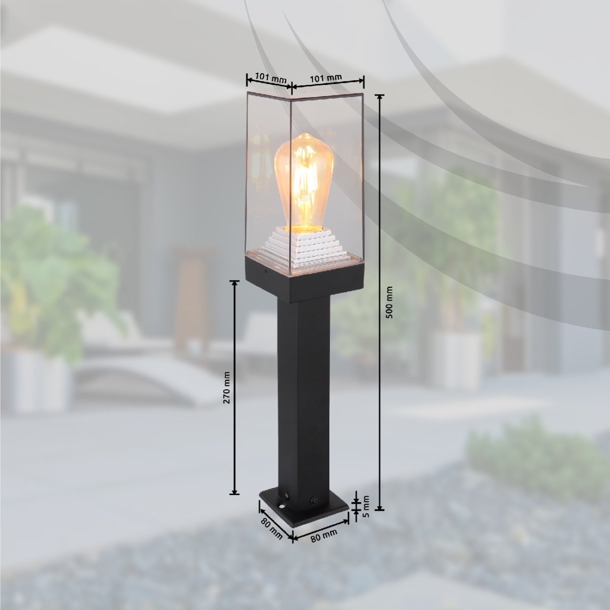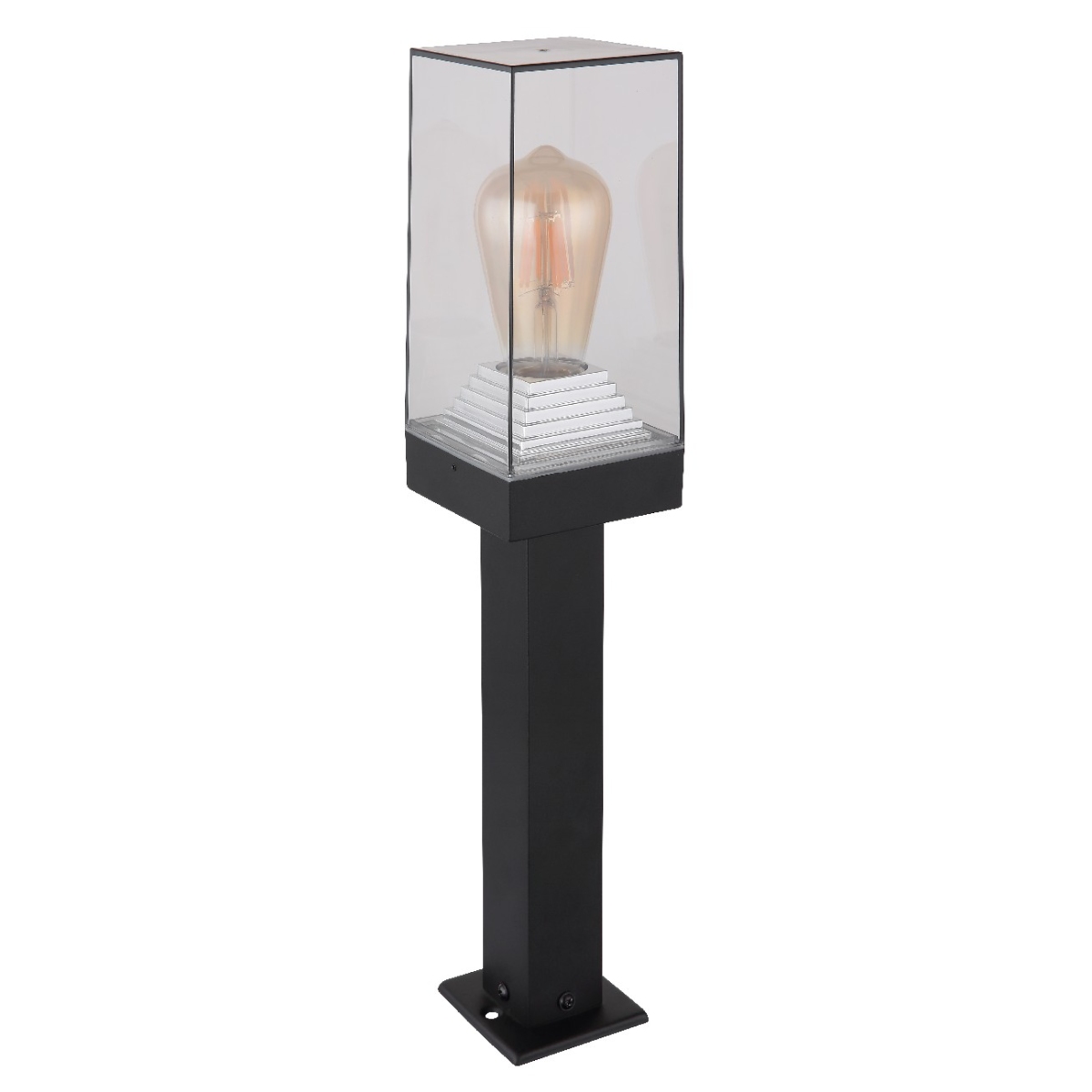 Ova lepa podna lampa za upotrebu na otvorenom ubeđuje svojim sjajnim dizajnom. Ova pravougaona livena spoljašnja lampa u mat crnoj boji (10x10cm) je otporna na prskanje i ima E27 grlo koje vam omogućava da koristite sijalice po vašem izboru, do maksimalne snage od 40 vati. Providni pravougaoni okvir pokriva grrlo E27 i ima visinu od 50cm.