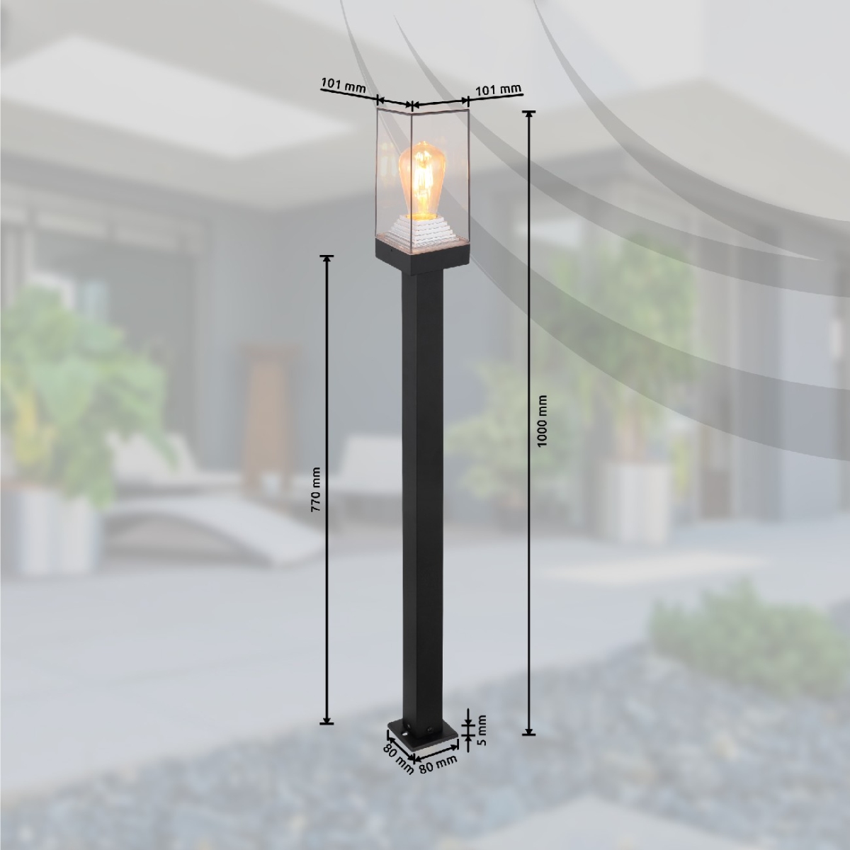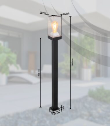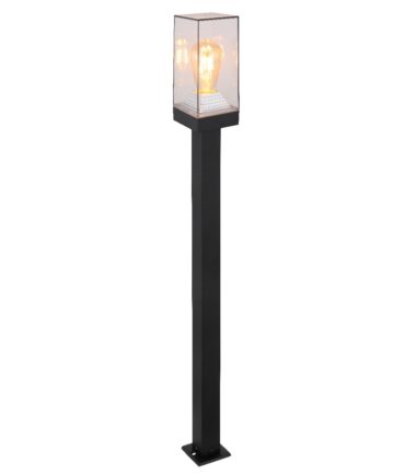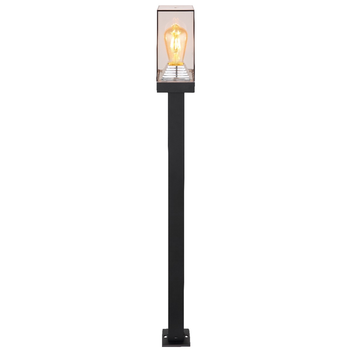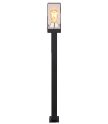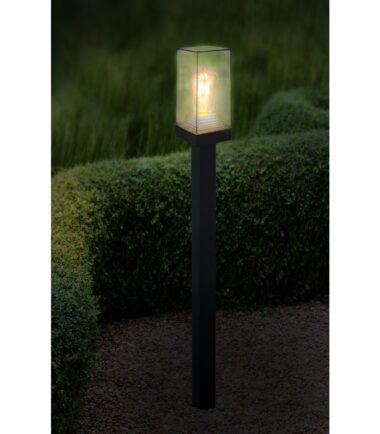 Ova lepa podna lampa za upotrebu na otvorenom ubeđuje svojim sjajnim dizajnom. Ova pravougaona livena spoljašnja lampa u mat crnoj boji (10x10cm) je otporna na prskanje i ima E27 grlo koje vam omogućava da koristite sijalice po vašem izboru, do maksimalne snage od 40 vati. Providni pravougaoni okvir pokriva grlo E27 i ima visinu od jednog metra.