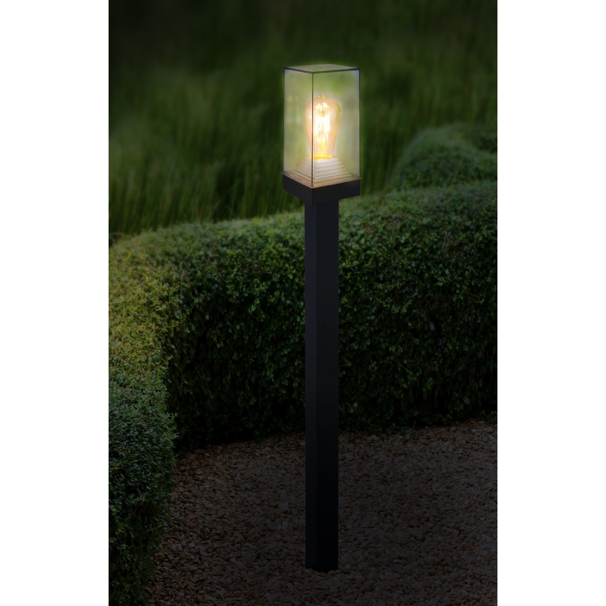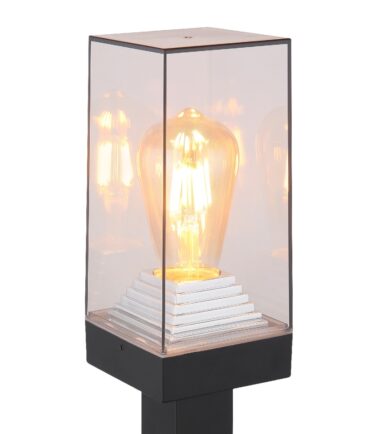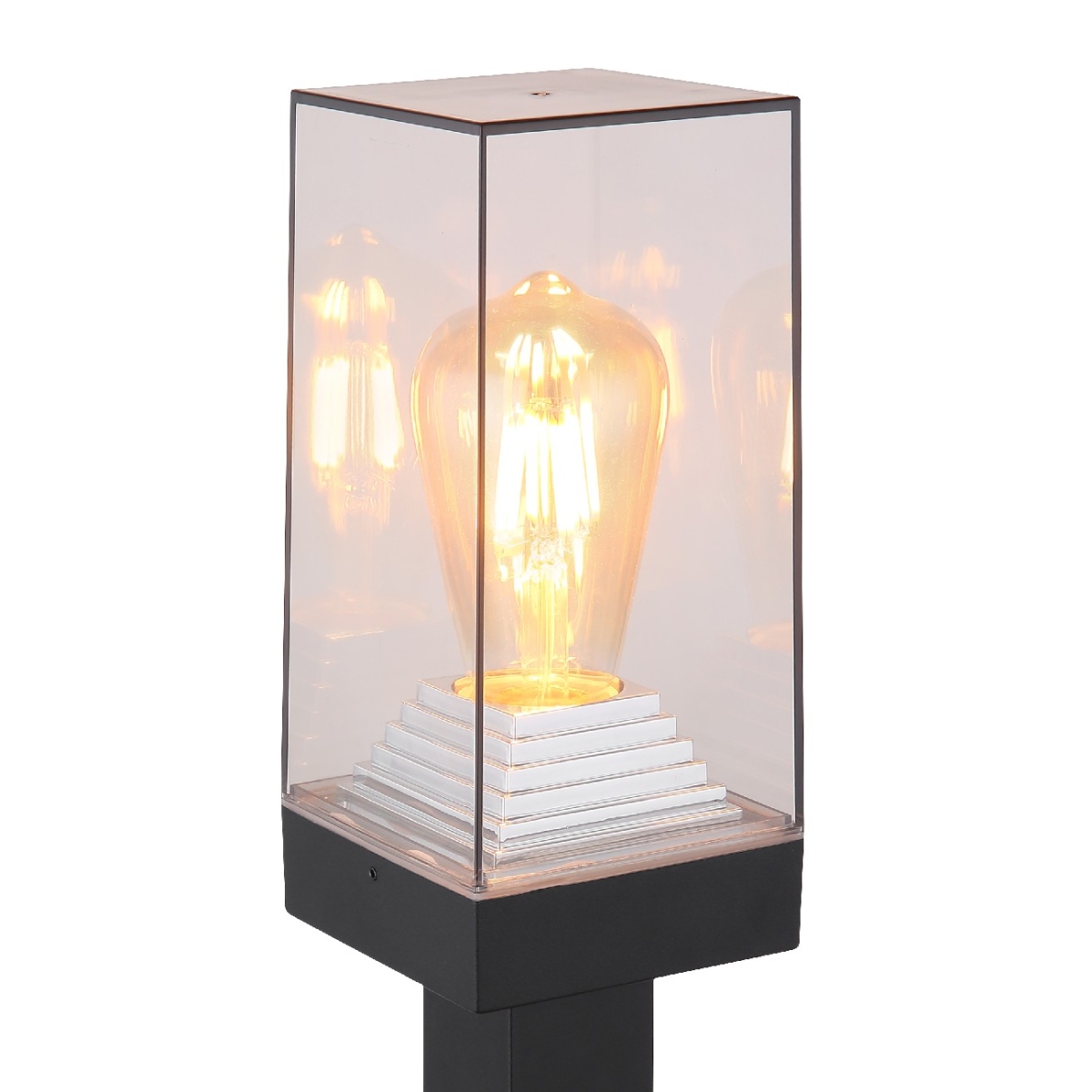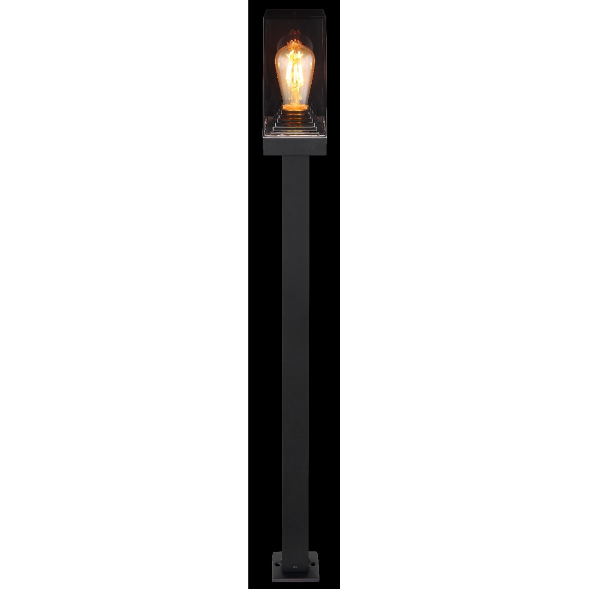 Ova lepa podna lampa za upotrebu na otvorenom ubeđuje svojim sjajnim dizajnom. Ova pravougaona livena spoljašnja lampa u mat crnoj boji (10x10cm) je otporna na prskanje i ima E27 grlo koje vam omogućava da koristite sijalice po vašem izboru, do maksimalne snage od 40 vati. Providni pravougaoni okvir pokriva grlo E27 i ima visinu od jednog metra.
