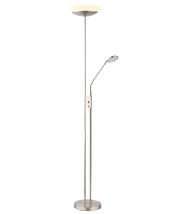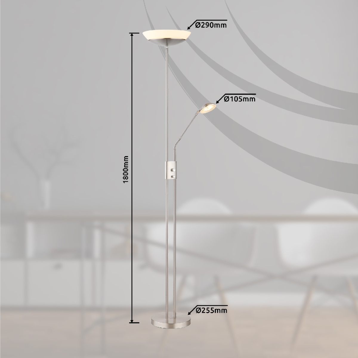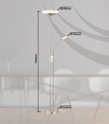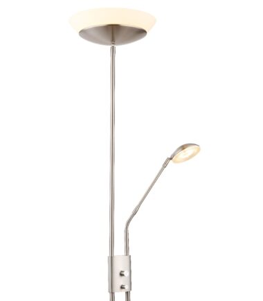 Podna lampa serije GANINA pružiće vašoj sobi toplu atmosferu. Reflektor je izrađen od nikl mat metala i opalnog stakla koje emituje meku svetlost. Plastika ima satiniranu završnu obradu i zaokružuje moderan izgled. Sa prečnikom od 290 mm i visinom od 1800 mm, ova lampa će privlačiti poglede u svakoj prostoriji. Svetlo se može prigušiti uz pompć dimera na didir. Lampa ima flekso granu pa se može rotirati i okretati. Svetlo za čitanje ima prečnik 10.5 cm. LED sijalica od 18.5W ima intezitet svetlosti od 1370lm izlazne svetlosti i temperaturu boje od 3000K. Svetlo za čitanje napaja LED sijalica od 4.5W i ima intezitet svetlosti od 210lm i temperaturu boje od 3000K.