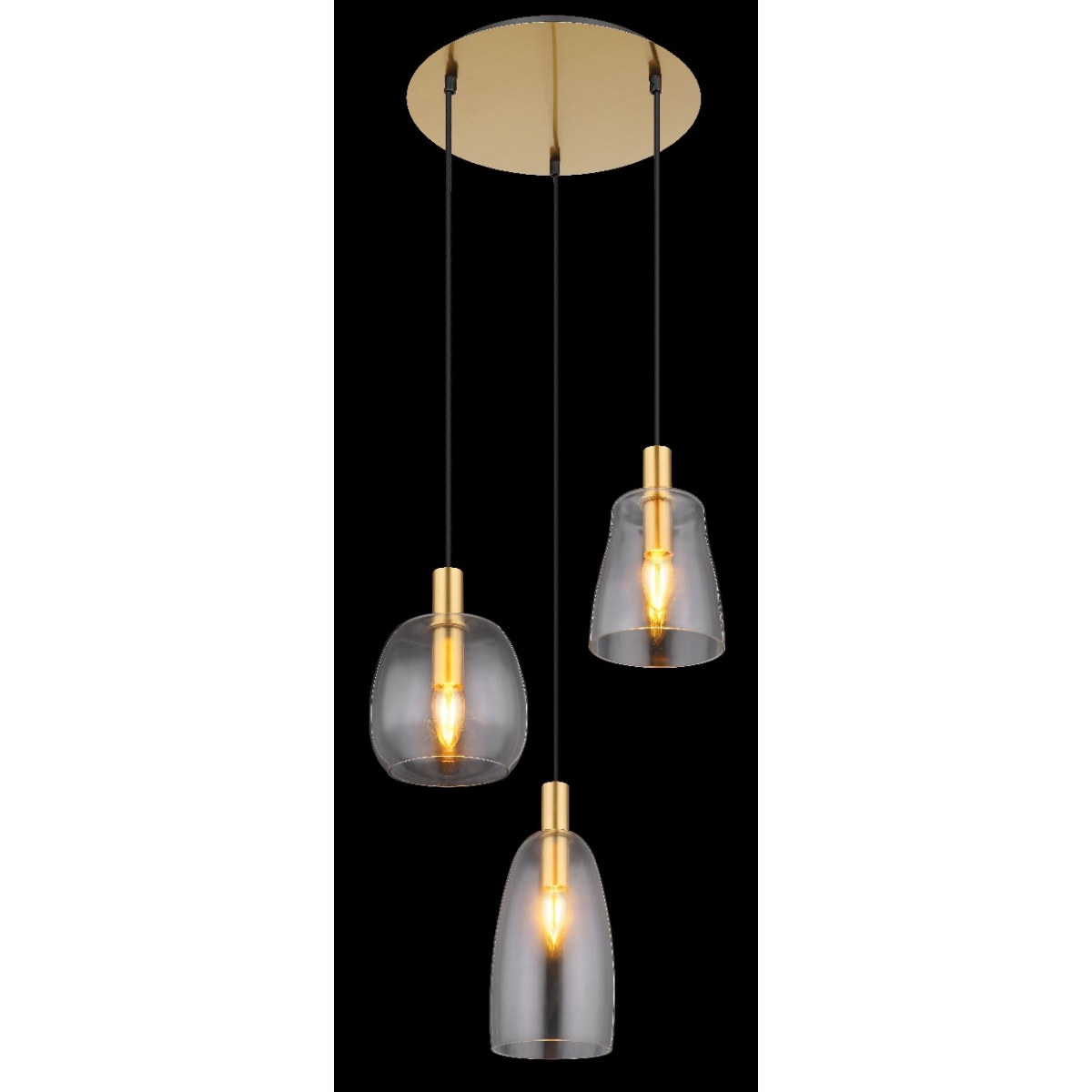 Ova elegantna visilica impresionira svojim prelepim dizajnom. Od okruglog plafonskog nosača (Ø 35 cm) u boji mesinga tri crna kabla u različitim dužinama do 1,5 m protežu se do E14 grla, koja su opremljena oblikovanim staklenim abažurima u raznim oblicima i ukrasima u mesingu. Grla E14 vam omogućavaju da sami odredite boju svetla i jačinu do maksimalnog izlaza od 40 vati. Zbog dugovečnosti i uštede energije preporučujemo LED sijalice.