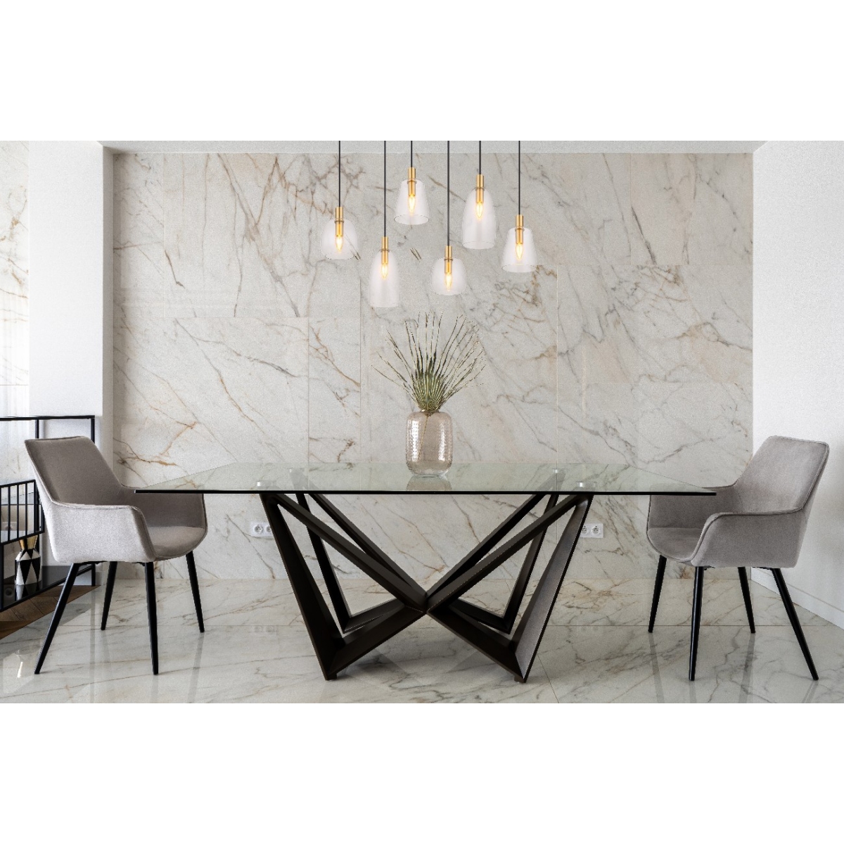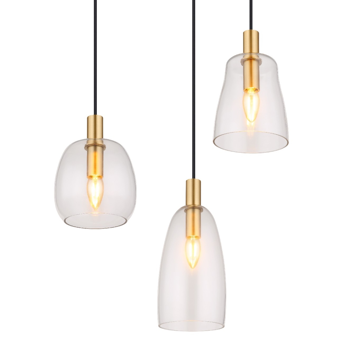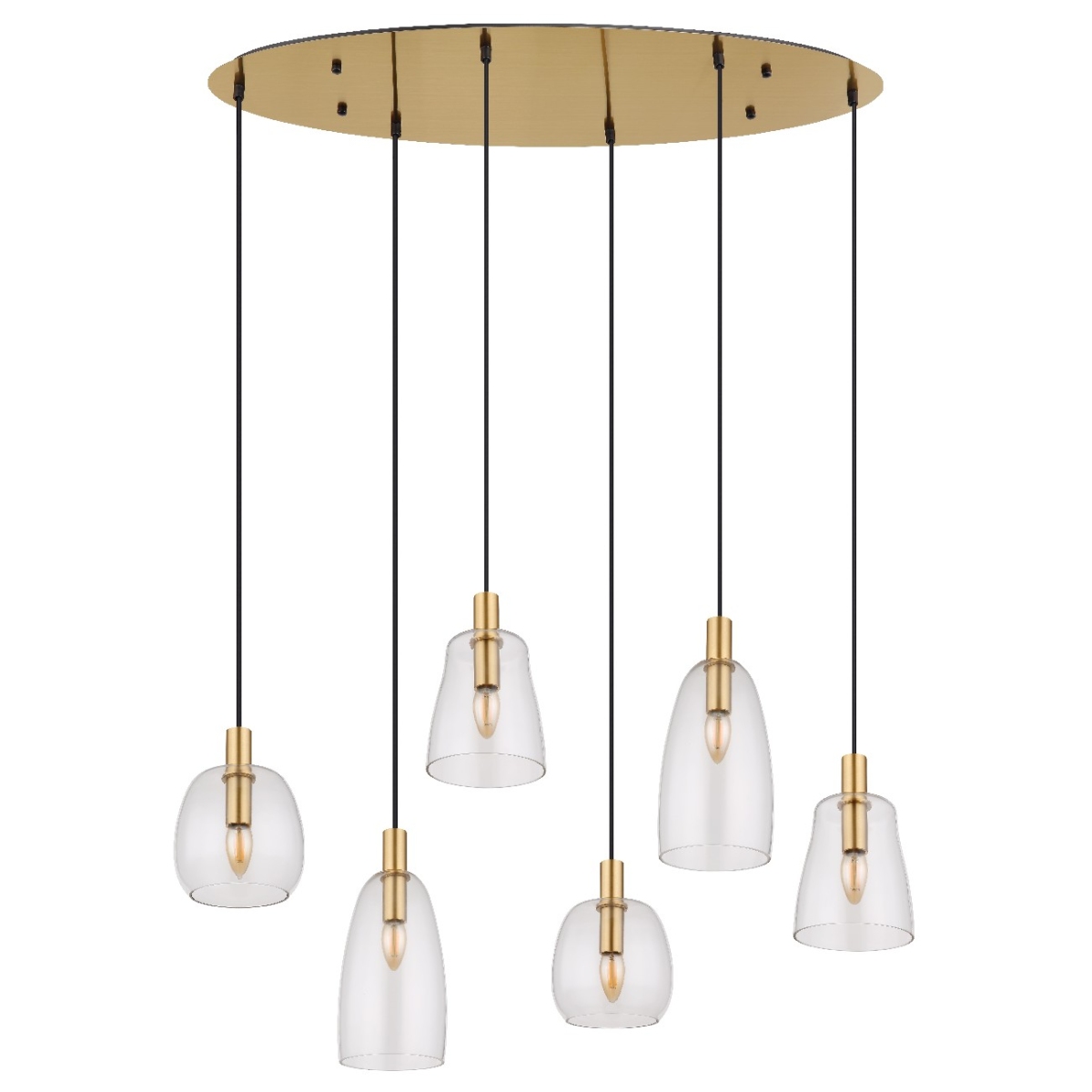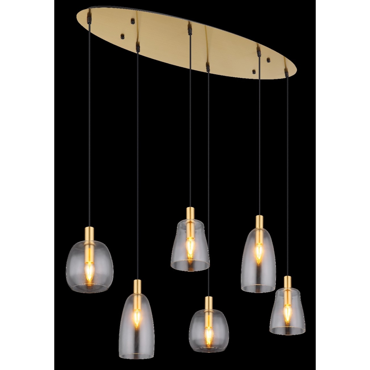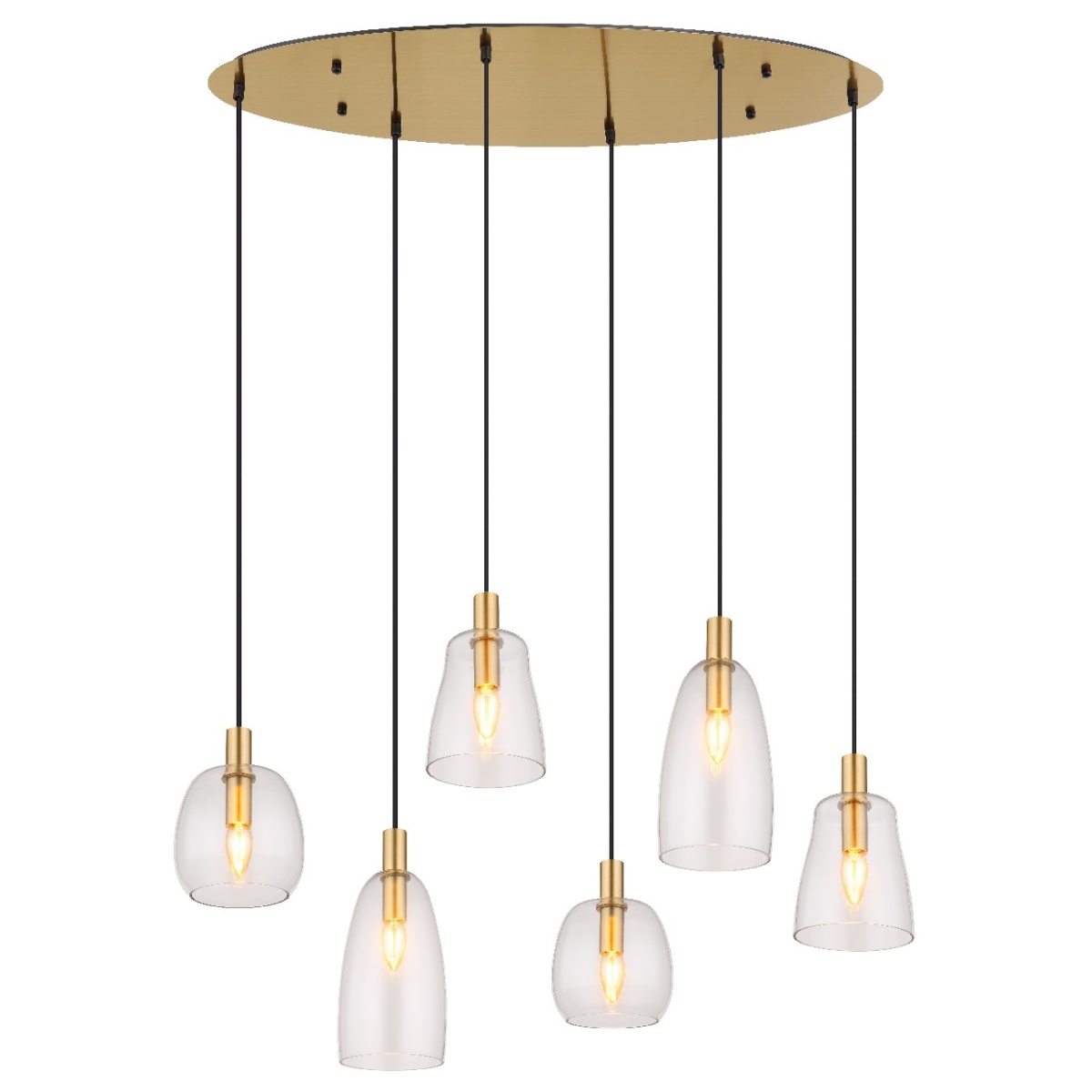 Ova prelepa visilica inspiriše sjajnim dizajnom i postaje centar vaših soba. Šest do 1,3 m dugačkih crnih kablova vise sa plafonskog nosača u zlatnoj boji i svaki kraju ima E14 grlo, koje je prekriveno prelepim providnim staklenim abažurima različitih oblika. Grla E14 vam omogućavaju da se odlučite za laganu boju i intenzitet do maksimalnog izlaza od 40 vati.