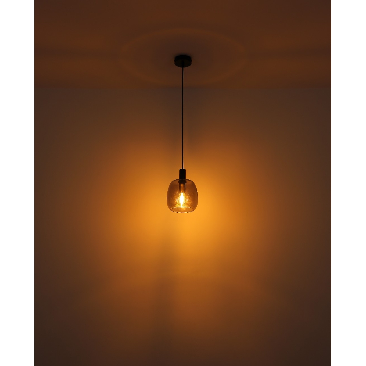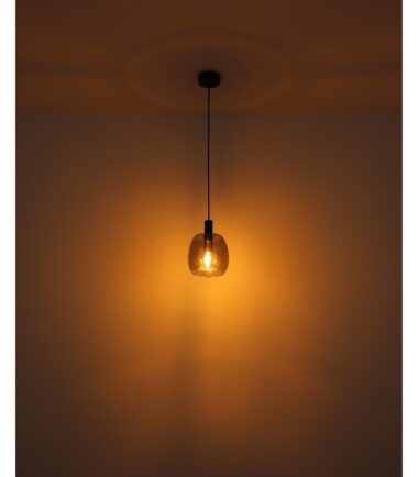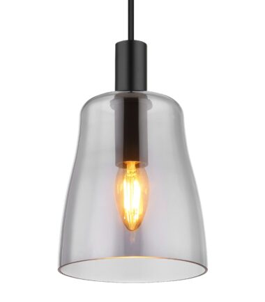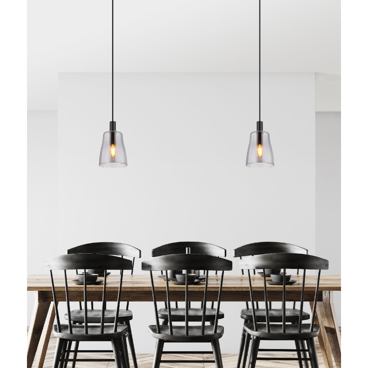 Ova elegantna viseća lampa inspiriše prelepim dizajnom. Iz okruglog plafonskog nosača, crni kabl dužine 1,2 m viri do grla E14, koje je opremljeno abažurom od dimljenog stakla (Ø 14,5 cm) i crnim dekoracijama. Grlo E14 vam omogućava da sami odredite boju svetlosti i osvetljenost do maksimalne snage od 40 vati. Zbog dugotrajnosti i uštede energije, preporučujemo LED sijalice.