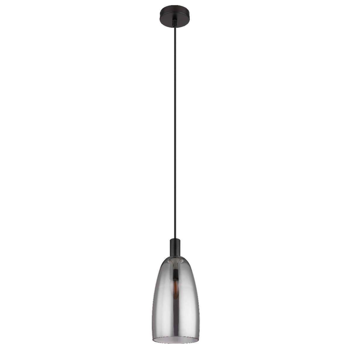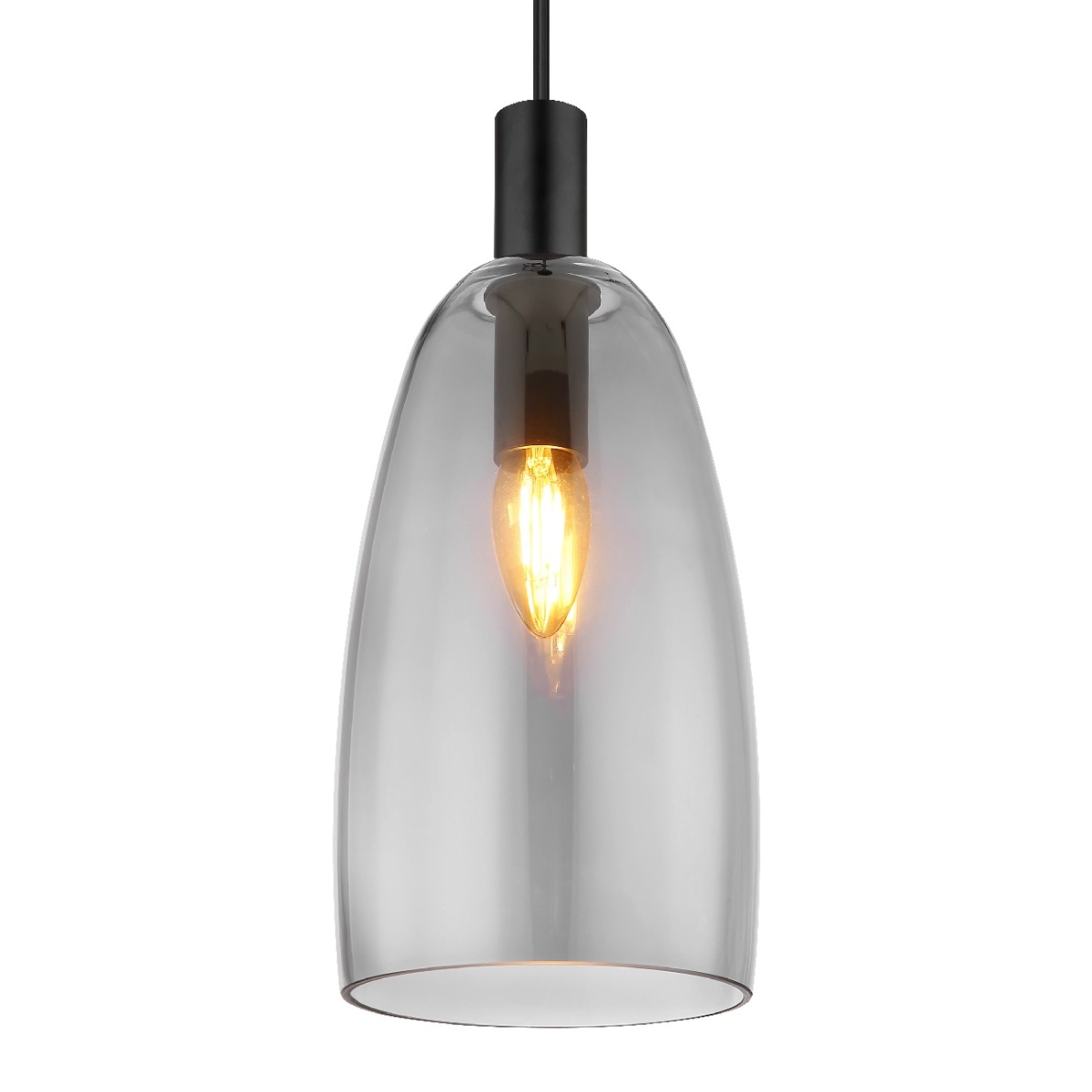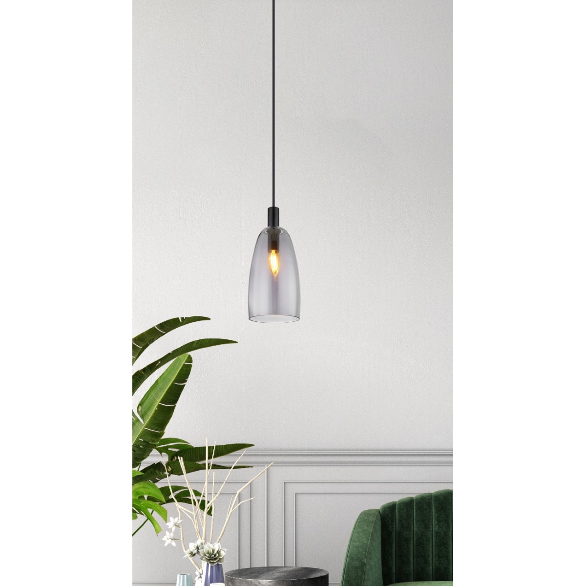Ova elegantna visilica impresionira svojim prelepim dizajnom. Od okruglog plafonskog nosača, crni kabl dugačak 1,2 m prodire do grla E14, koje je opremljeno staklenim abažurom u boji dima (Ø 14 cm) i detaljima u crnoj boji. Grlo E14 vam omogućava da sami odredite boju svetla i jačinu do maksimalne snage od 40 vati. Zbog dugovečnosti i uštede energije preporučujemo LED sijalice.