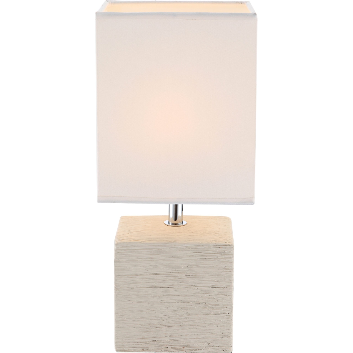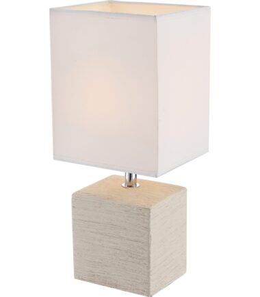 Uz elegantnu četvrtastu stonu lampu serije GERI, možete idealno ukrasiti svoj dnevni boravak. Bež keramička podloga u obliku kocke i beli tekstil savršeno upotpunjuju jedno drugo. Veličina od 13×11 cm omogućava integrisanje ove lampe u bilo koji deo vaše sobe. Pomoću prekidača za isključivanje možete kontrolisati svetlo, a postojeće E14 grlo (max. 40W) vam nudi slobodan izbor sijalica. Preporučujemo LED sijalice zbog njihove trajnosti i uštede energije.