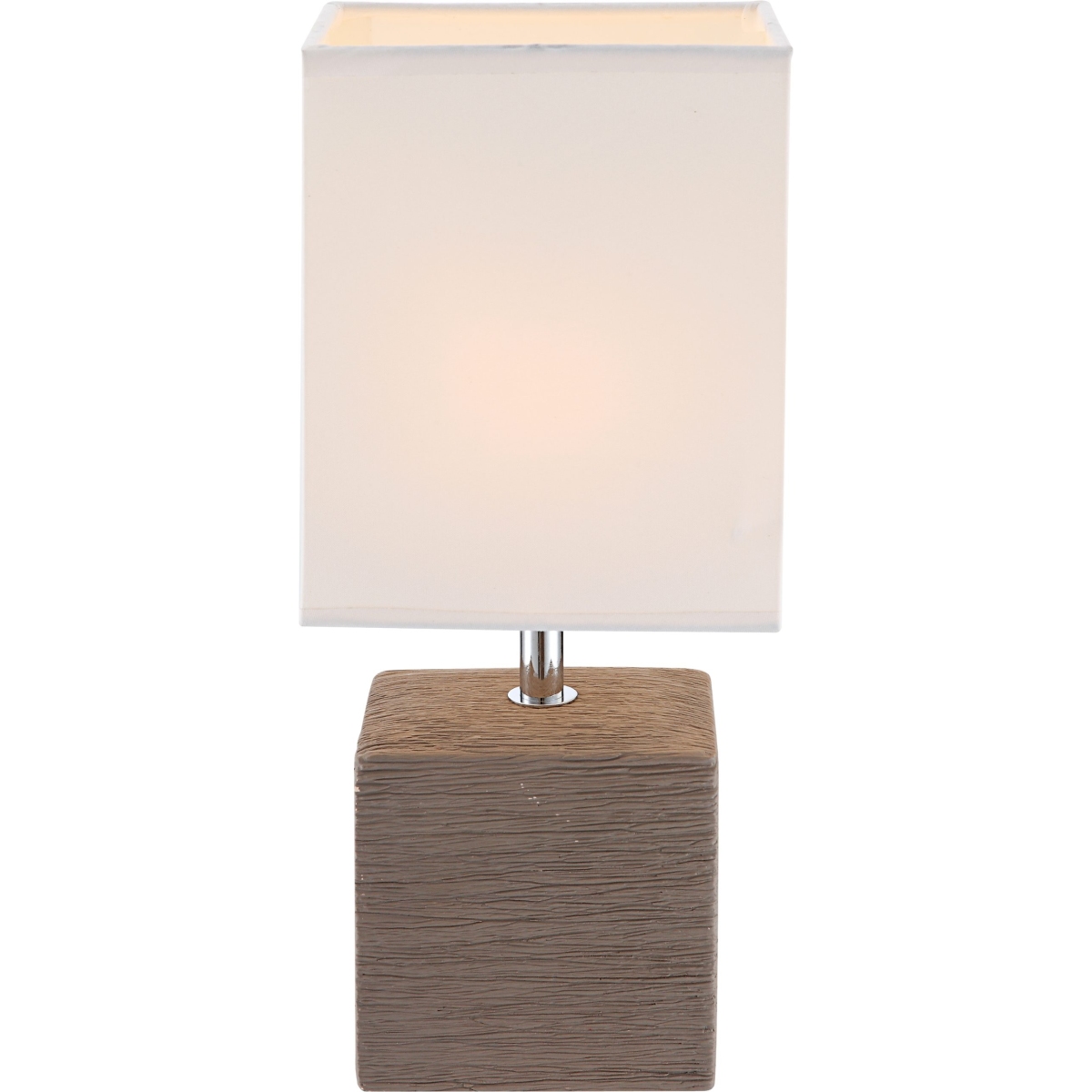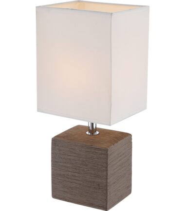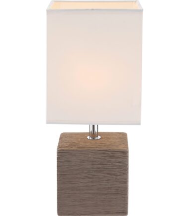 Uz elegantnu četvrtastu stonu lampu serije GERI, možete idealno ukrasiti svoj dnevni boravak. Braon keramička podloga u obliku kocke i beli tekstil savršeno upotpunjuju jedno drugo. Veličina od 13×11 cm omogućava integrisanje ove lampe u bilo koji deo vaše sobe. Pomoću prekidača za isključivanje možete kontrolisati svetlo, a postojeće E14 grlo (max. 40W) vam nudi slobodan izbor sijalica. Preporučujemo LED sijalice zbog njihove trajnosti i uštede energije.