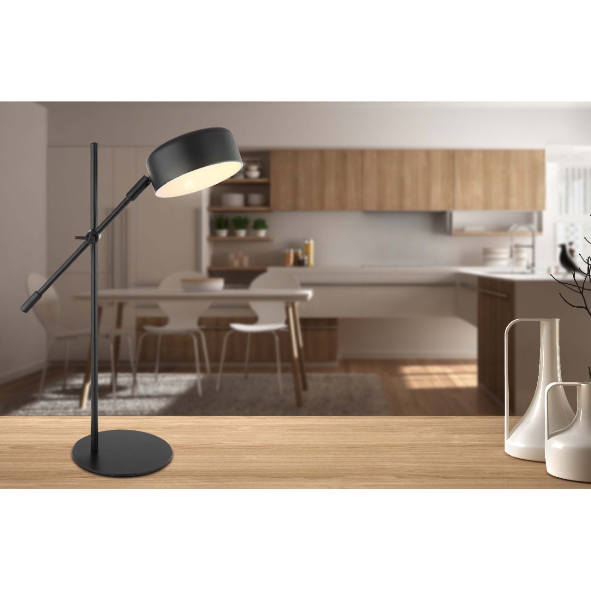 Ova stona lampa iz serije GIANNA ističe se svojim stilskim dizajnom napravljenim od crnog-mat metala. Stona lampa dužine 50 cm sastoji se od metalne podloge na koju je fiksirana šipka. Oketna šipka je pričvršćena pod uglom na nosač, koji je obezbeđen okruglim metalnim abažurom i grlom E14. Možete je opremiti odgovarajućim svetlosnim izvorom po vašem izboru, što vam daje mogućnost da pojedinačno odredite boju svetla i jačinu. Pored toga, svetiljka je opremljena uključenim prekidačem sa kojim se može zgodno uključiti i isključiti. Pomoću ostalih artikala iste serije možete da dovršite celokupnu sliku u svoja četiri zida.