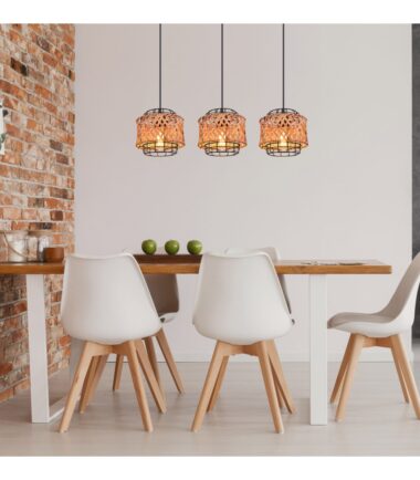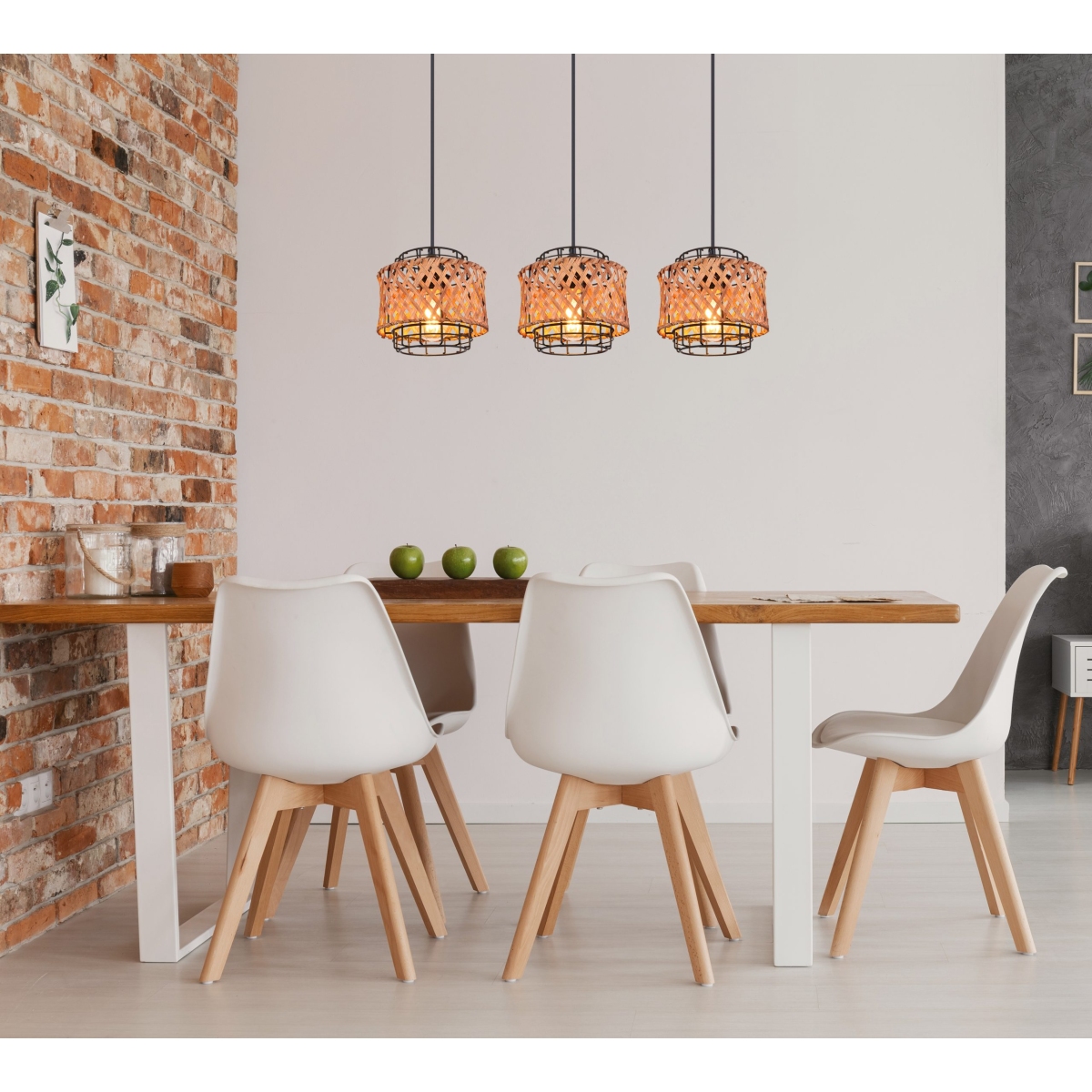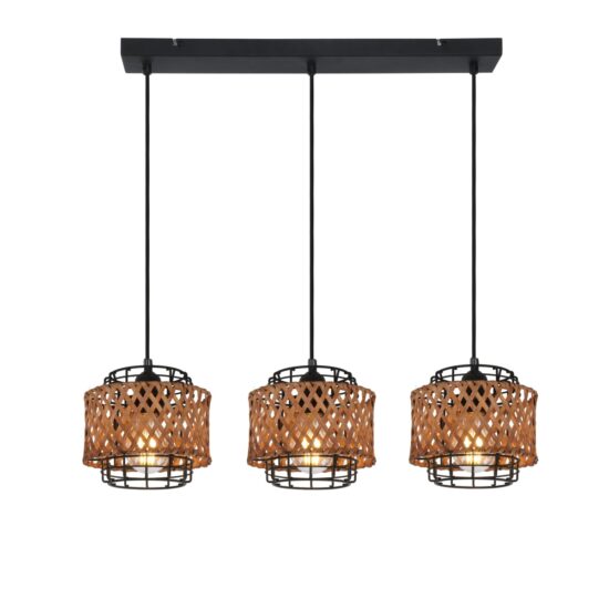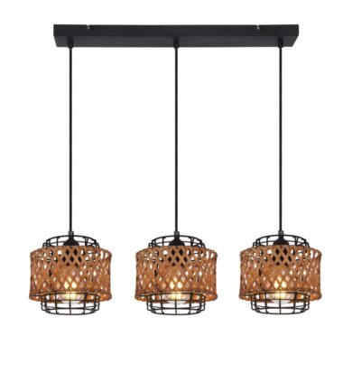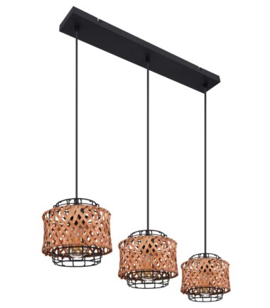 Ova visilica dugačka 65 cm iz serije GINA je elegantan dodatak vašem enterijeru. Zbog svog izduženog oblika, visilica se može divno montirati preko trpezarijskog stola, koji potom doživljava jednoobrazno osvetljenje. Sastoji se od crne metalne ploče na kojoj vise tri crna kabla sa metalnim abažurima. One su opremljene prstenom isprepletanog bambusa i mogu biti opremljene E27 sijalicama po vašem izboru, što vam pruža mogućnost da pojedinačno odredite laganu boju i jačinu. Pored toga, visina lampe može da se podesi i do 120 cm tokom instalacije. Sa drugim modelima iste serije možete da kreirate udoban ambijent u svoja četiri zida i upotpunite celokupnu sliku.