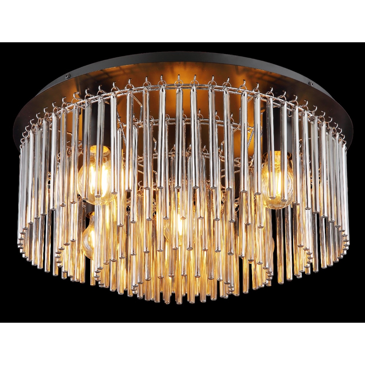 Plafonska lampa izrađena od crnog mat metala i staklenih šipki u boji dima raspoređenih u prečniku od 500mm. Za lampu je potrebno 5 sijalica E27, svaka snage do 60W i napona od 230W. lampa ima prečnik od 500mm i visinu od 250mm. Idealana je za sobe sa visokim plafonima ili kao centralni element u prostoriji.
