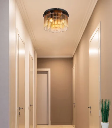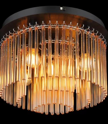 Plafonska lampa GORLEY ubeđuje modernim i elegantnim dizajnom. Njeno okruglo telo napravljeno od mat crnog i hromiranog metala nosi podjednako okrugli abažur napravljen od ćilibarnih i providnih staklenih šipki, koje su vešto i jasno raspoređene. Ovo stvara posebnu igru svetlosti i prijatnu atmosferu u prostoriji. Plafonska lampa GORLEY je savršena za različite koncepte prostorija i postavlja stilske akcente u dnevnim sobama, hodnicima ili spavaćim sobama. Zahvaljujući visokokvalitetnoj izradi i dobro osmišljenom dizajnu, ona nije samo funkcionalni izvor svetlosti, već i dekorativni element koji ulepšava prostoriju. Složnom kombinacijom metala i stakla, plafonska lampa GORLEY se besprekorno uklapa u moderne stilove enterijera i dodaje savremeni dodir svakoj prostoriji. Ona ne samo da pruža efikasno osvetljenje, već i estetski akcenat koji obogaćuje ambijent vašeg životnog prostora.