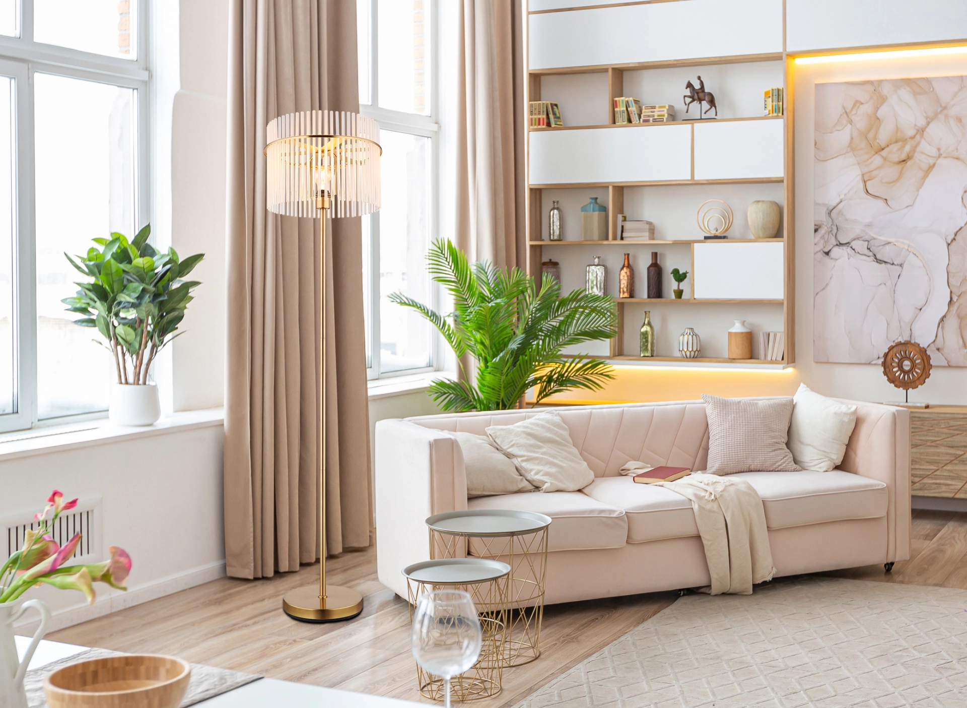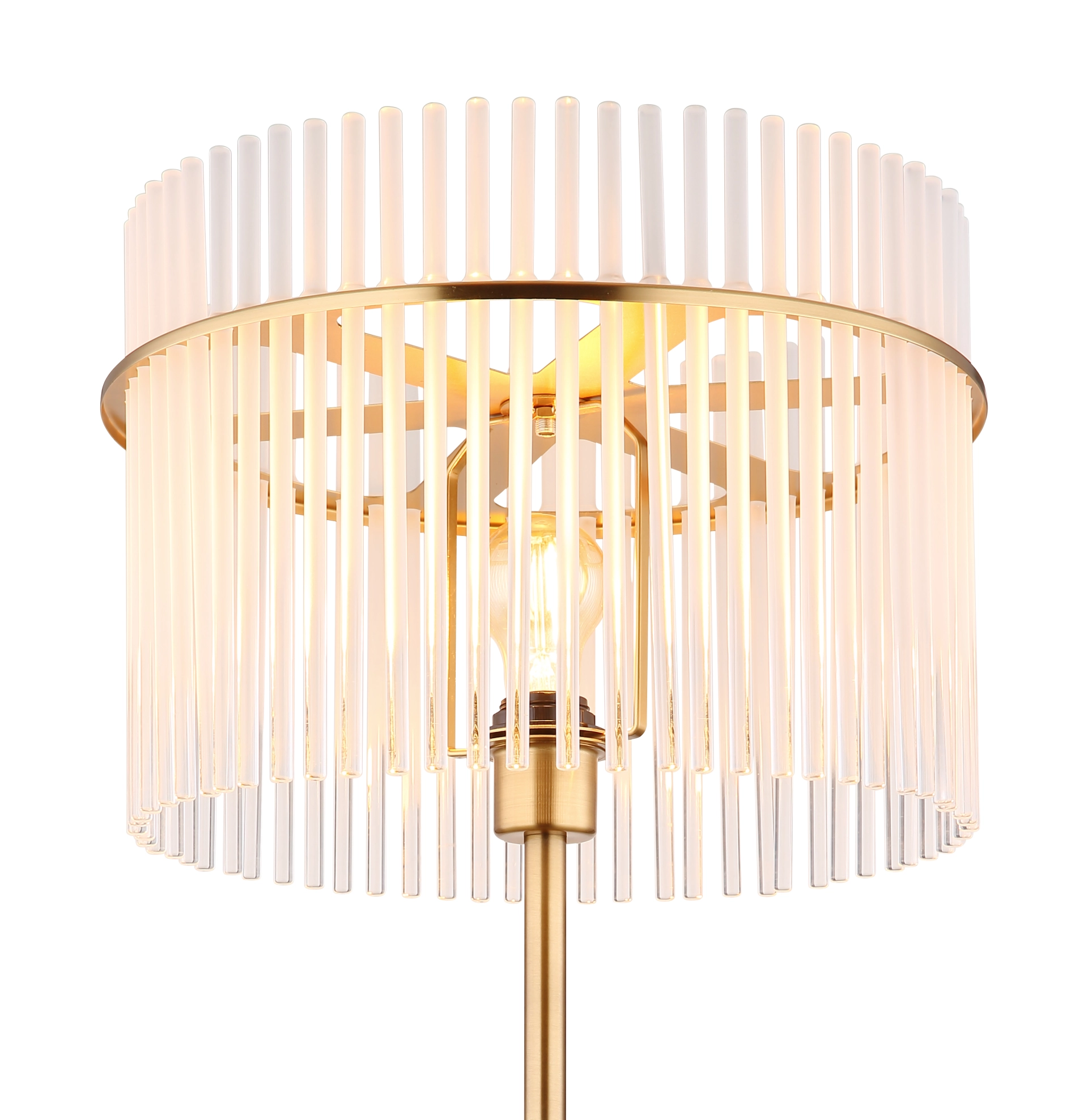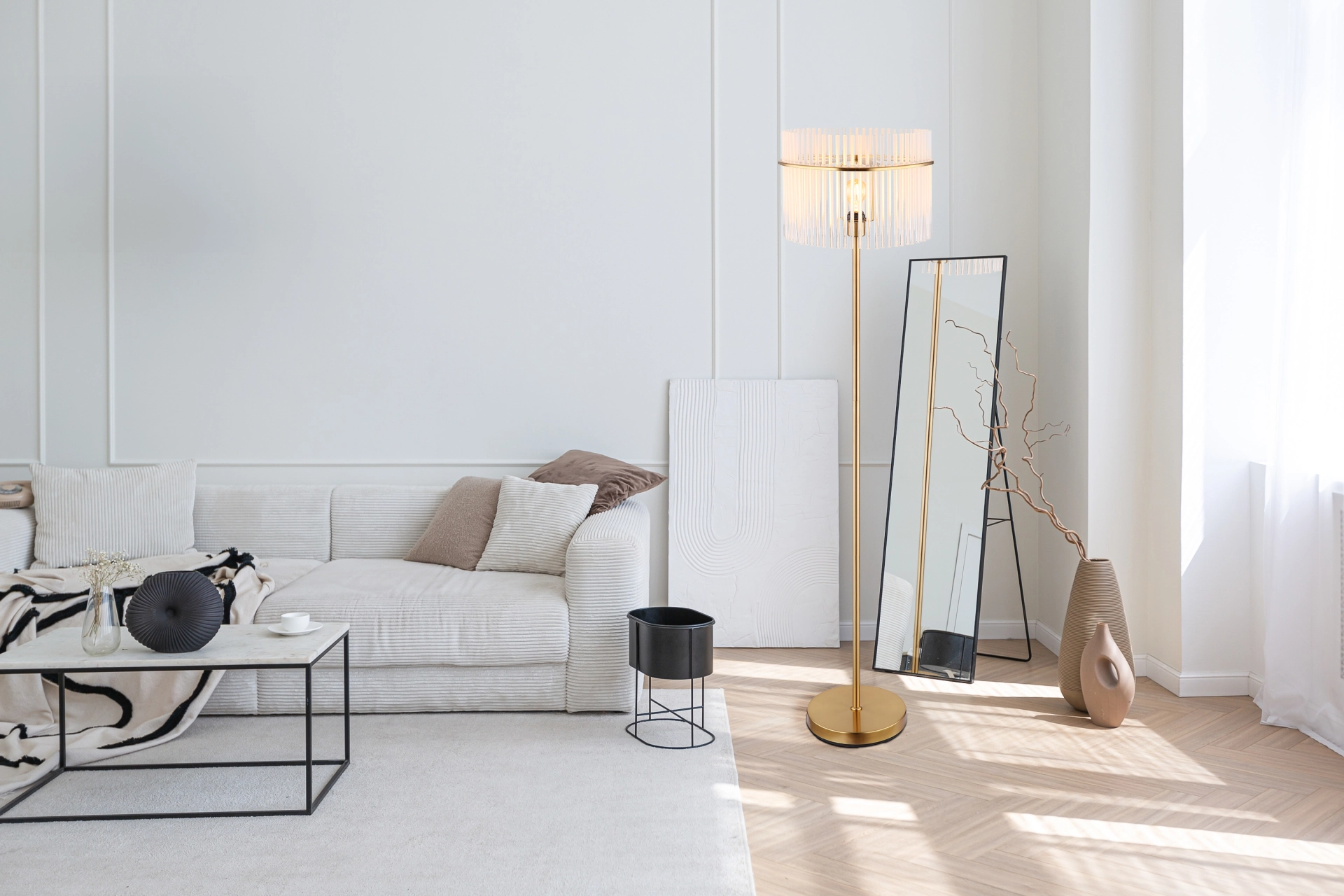 Podna lampa GORLEY je elegantan izvor svetlosti koji svojim jedinstvenim dizajnom uranja svaku prostoriju u prijatan ambijent. Abažur lampe je okrugao i sastoji se od opalnih, providnih staklenih šipki koje stvaraju blagi gradijent. Telo podne lampe GORLEY je napravljeno od mat, zlatnog metala i daje lampi stilski izgled. Zahvaljujući prekidaču na kablu, podna lampa GORLEY se lako uključuje i isključuje. Sa prečnikom od 380 mm, zauzima malo prostora, a i dalje pruža prijatno osvetljenje. Podna lampa GORLEY je savršena kao lampa za čitanje pored sofe ili kao dekorativni element u vašoj dnevnoj sobi. Visokokvalitetni materijal i pažljiva izrada obećavaju dug vek trajanja. Napravite stilski utisak u svom domu sa podnom lampom GORLEY i uživajte u prijatnoj atmosferi koju stvara.