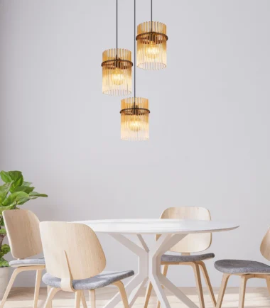 Viseća lampa GORLEY kombinuje moderan dizajn sa elegantnom funkcionalnošću. Ova stilska viseća lampa ima tri vešalice pričvršćene za okruglu šinu. Svaka vešalica je opremljena okruglim kišobranom napravljenim od staklenih štapića. Ove staklene štapiće su ćilibarne boje i providne, stvarajući fascinantnu igru svetlosti. Okrugli oblik lampe se harmonično uklapa u različite koncepte prostorija i postavlja stilske akcente iznad trpezarijskih stolova, u dnevnim boravcima ili iznad pultova. Telo viseće lampe je napravljeno od mat crnog metala, što joj daje moderan i istovremeno bezvremenski izgled. Viseća lampa GORLEY nije samo vizuelni vrhunac, već ubeđuje i svojom visokokvalitetnom izradom. Kombinacija metala i stakla čini ovu lampu posebnim detaljem koji ulepšava svaku prostoriju i pruža prijatno osvetljenje. Sa visećom lampom GORLEY možete uneti pravi dizajnerski vrhunac u svoj dom.