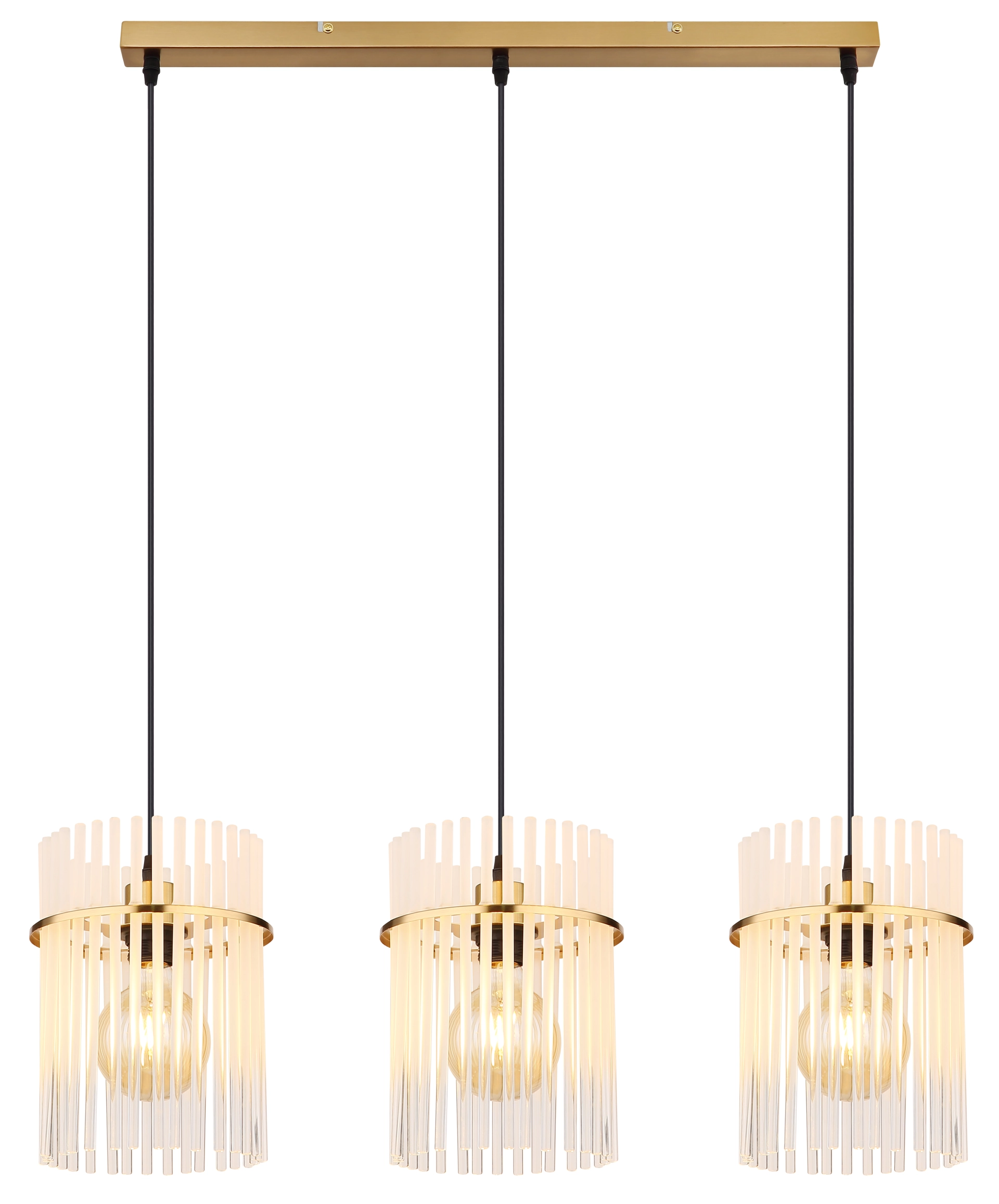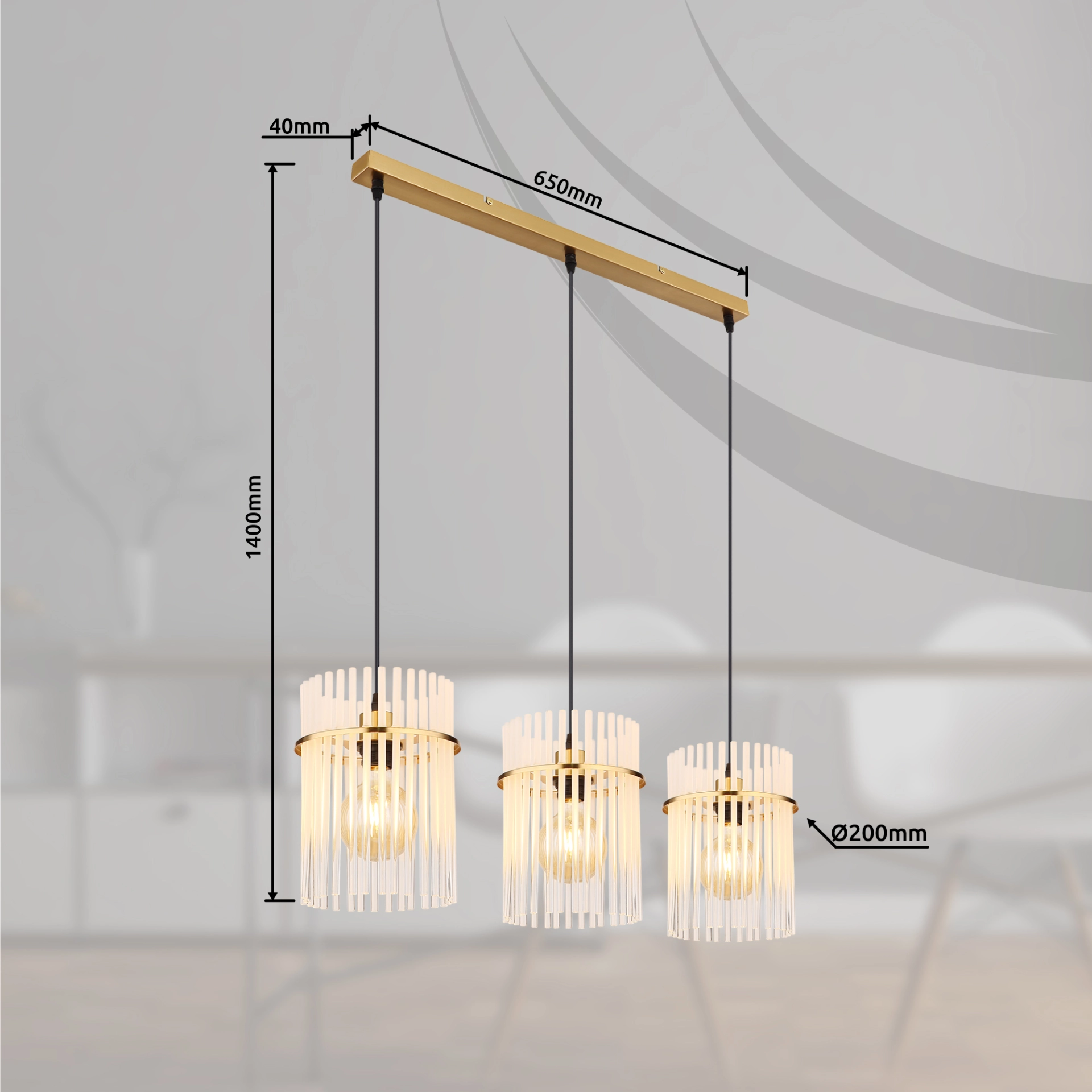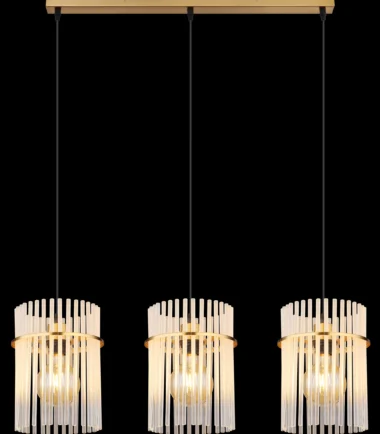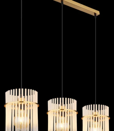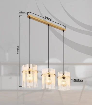 Viseća lampa GORLEY je luksuzan i elegantan dodatak vašem domu. Sa svojim izduženim dizajnom i tri viseće lampe, postavlja stilske akcente i pruža jedinstveno osvetljenje. Zlatna mat metalna kućišta viseće lampe GORLEY daje joj plemenit i topao šarm. Abažuri su napravljeni od ukrašenih staklenih šipki koje stvaraju opalni efekat. Čist i glatki dizajn omogućava fascinantnu igru svetlosti koja uranja vašu sobu u prijatnu atmosferu. Sa dužinom od 800 mm i širinom od 200 mm, viseća lampa GORLEY nudi dovoljno svetlosti i istovremeno izgleda filigranski i elegantno. Posebno je pogodna za moderne i stilske dnevne prostore i može se savršeno postaviti iznad trpezarijskog stola ili kuhinjskog ostrva. Dajte svom domu dodatnu porciju luksuza uz viseću lampu GORLEY i uživajte u posebnom svetlosnom ambijentu ove izvanredne viseće lampe.