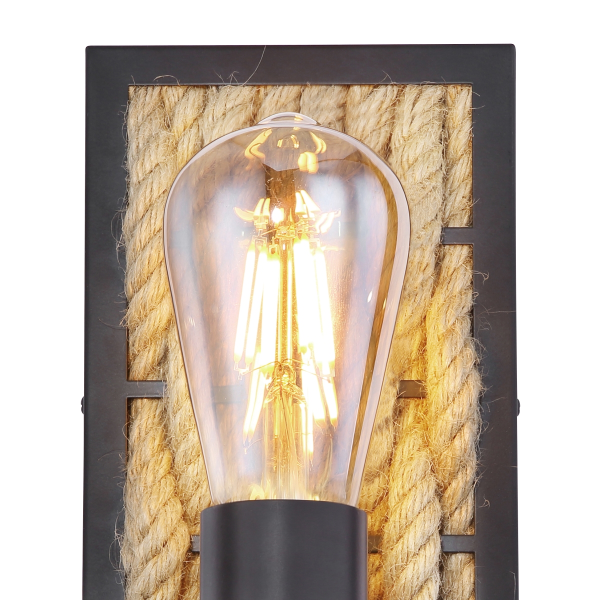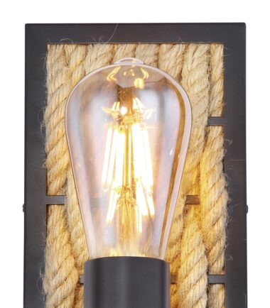 Ova zidna lampa iz serije HALIA je divan dodatak za vaš enterijer. Zidna lampa visine 28 cm sastoji se od drvenog kvadra širokog 12 cm, čija je površina prekrivena kanapom od konoplje. Na dnu kvadra nalazi se prednja savijena, crno-mat metalna šipka, na koju je fiksirano grlo E27. Možete ga opremiti odgovarajućim izvorom svetlosti po vašem izboru, što vam omogućava da u skladu sa svojim idejama odredite boju svetla i jačinu. Sa ostalim modelima iste serije možete upotpuniti celokupnu sliku u svoja četiri zida i obezbediti elegantan ambijent.