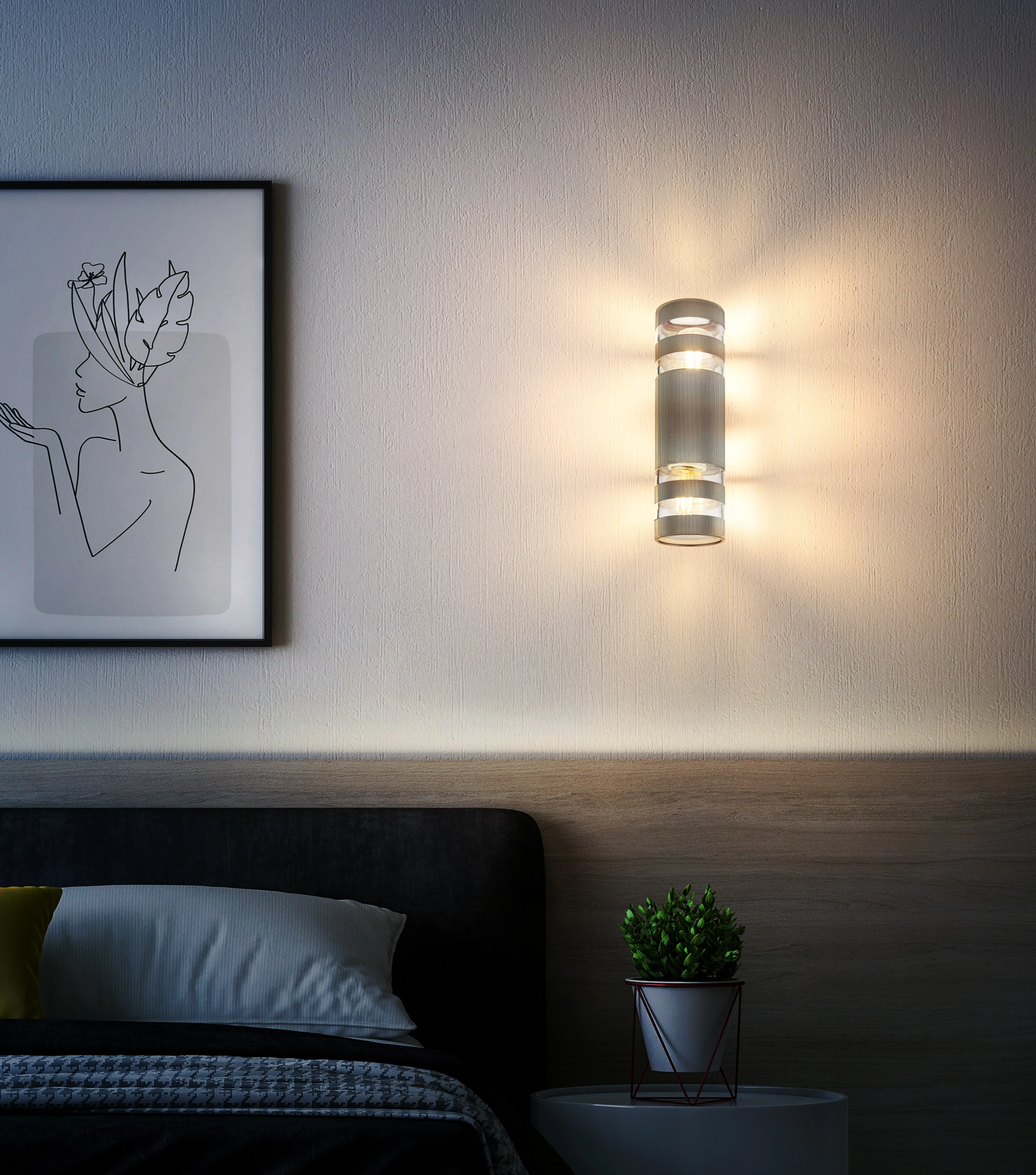 Antracit plastična zidna lampa impresionira svojim modernim, cilindričnim dizajnom i funkcionalnim osvetljenjem. Sa svojim providnim staklom i plastičnim abažurom, obezbeđuje ravnomernu raspodelu svetlosti i svetli i nagore i nadole, stvarajući prijatnu atmosferu. Telo napravljeno od mat antracit plastike daje lampi elegantan, nenametljiv izgled koji se savršeno uklapa u različite stilove života. Lampa je opremljena sa dva E27 grla (abažuri nisu uključeni), tako da možete izabrati izvor svetlosti prema vašim željama. ANTRACIT PLASTIČNA ZIDNA LAMPA je idealna za zidno osvetljenje u dnevnim sobama, hodnicima ili čak spavaćim sobama. Ne samo da stvara funkcionalno osvetljenje, već i postavlja stilske akcente na svaki zid. Idealna za moderan, ali udoban dizajn enterijera.