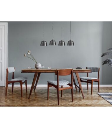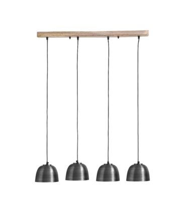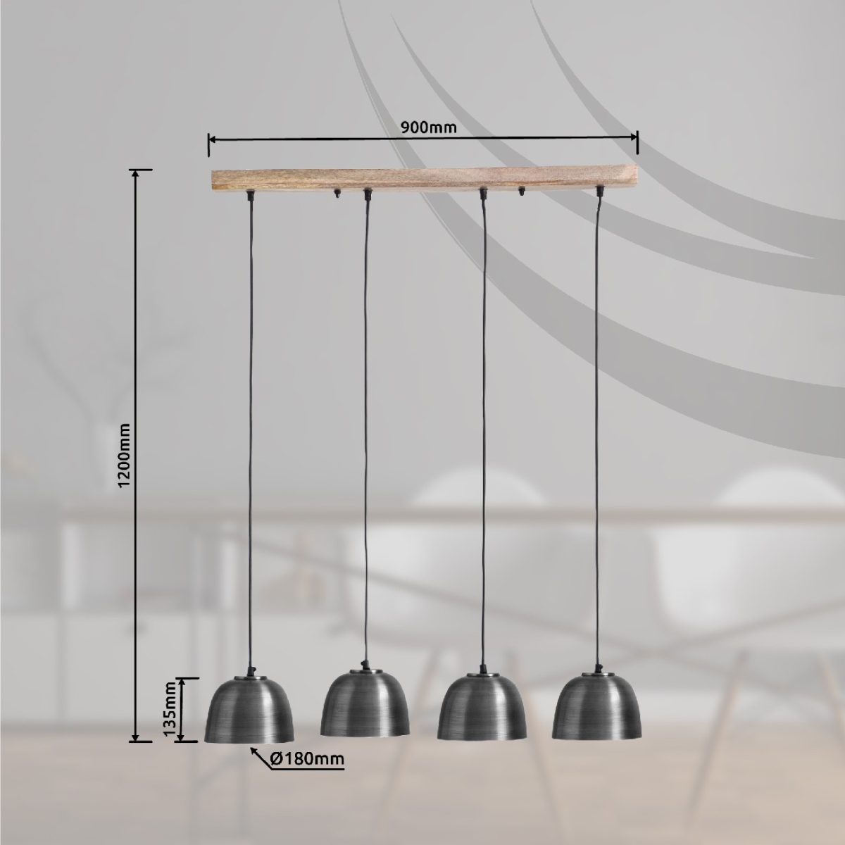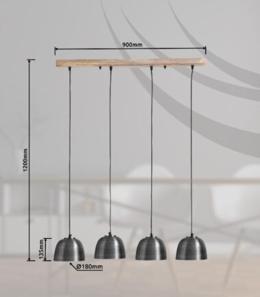 Ova jednostavna visilica inspiriše svojim prelepim dizajnom. Od drvenog plafonskog nosača dužine 90 cm, četiri kabla do 1,2 m, pružaju se do E27 grla sa oblikovanim metalnim abažurima (Ø 18 cm) u sivoj u boji. E27 grla vam omogućavaju da odredite boju svetla i jačinu do maksimalnog izlaza od 25 vati. Zbog dugovečnosti i uštede energije preporučujemo LED sijalice.