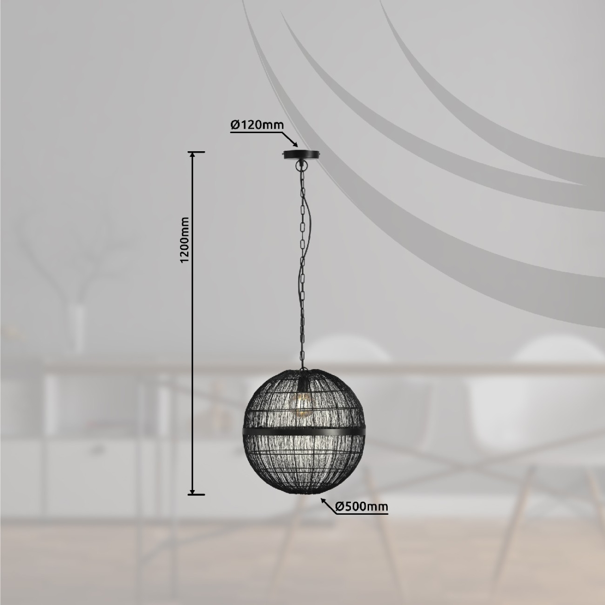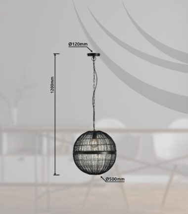 Ova visilica (ø 50 cm) je divan dodatak vašem enterijeru. Sastoji se od okruglog metalnog abažura u crnoj boji, koji visi 1,2 m od plafona na okruglom plafonskom nosaču. Možete je opremiti E27 sijalicom po vašem izboru, koja vam omogućava da pojedinačno odredite boju svetla i jačinu. Zbog dugovečnosti i uštede energije preporučujemo LED sijalice.