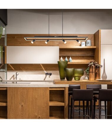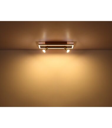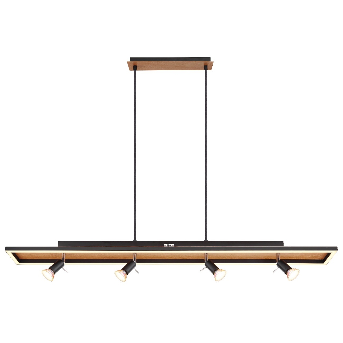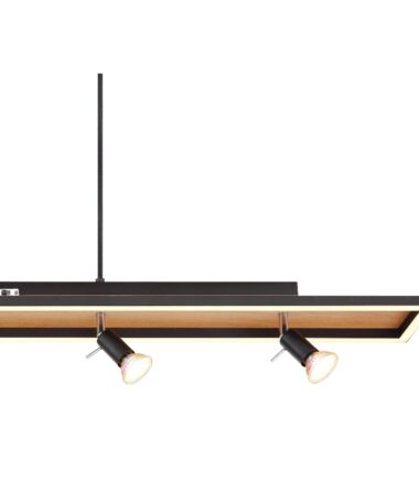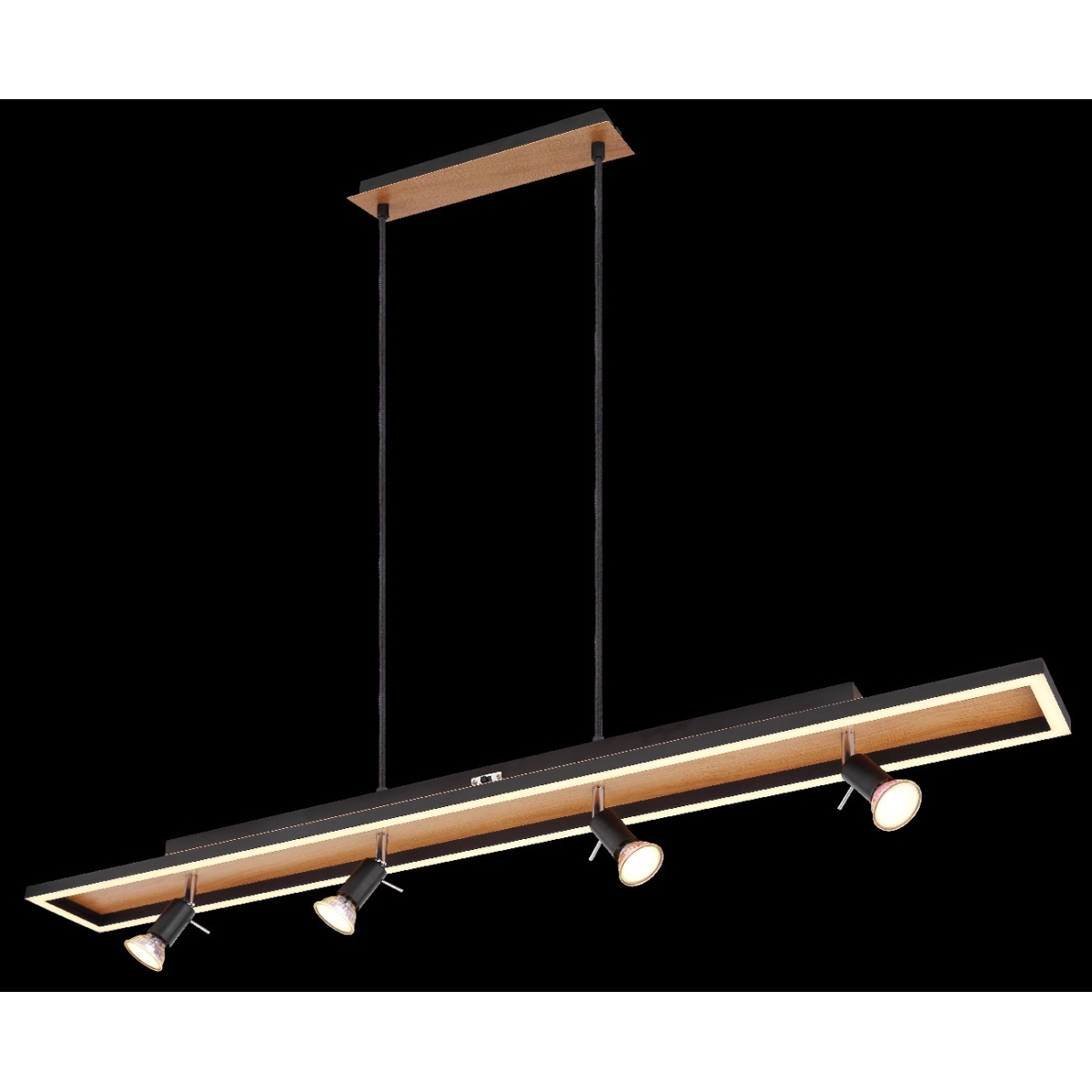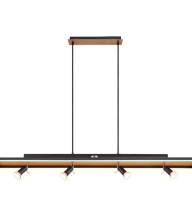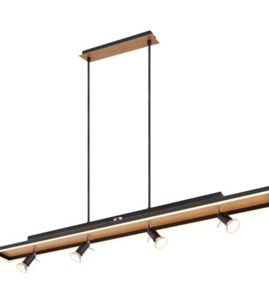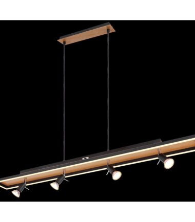 Ova moderna plafonska lampa impresionira svojim sjajnim izgledom. Iz drvenog bloka isturena su četiri GU10 grla sa dodatnim pravougaonim LED panelom (116x12cm) koji visi na dva crna kabla 1,2m od plafona. Uz pomoć funkcije memorije čuvaju se poslednje korišćene postavke.