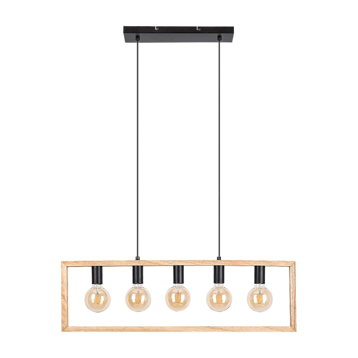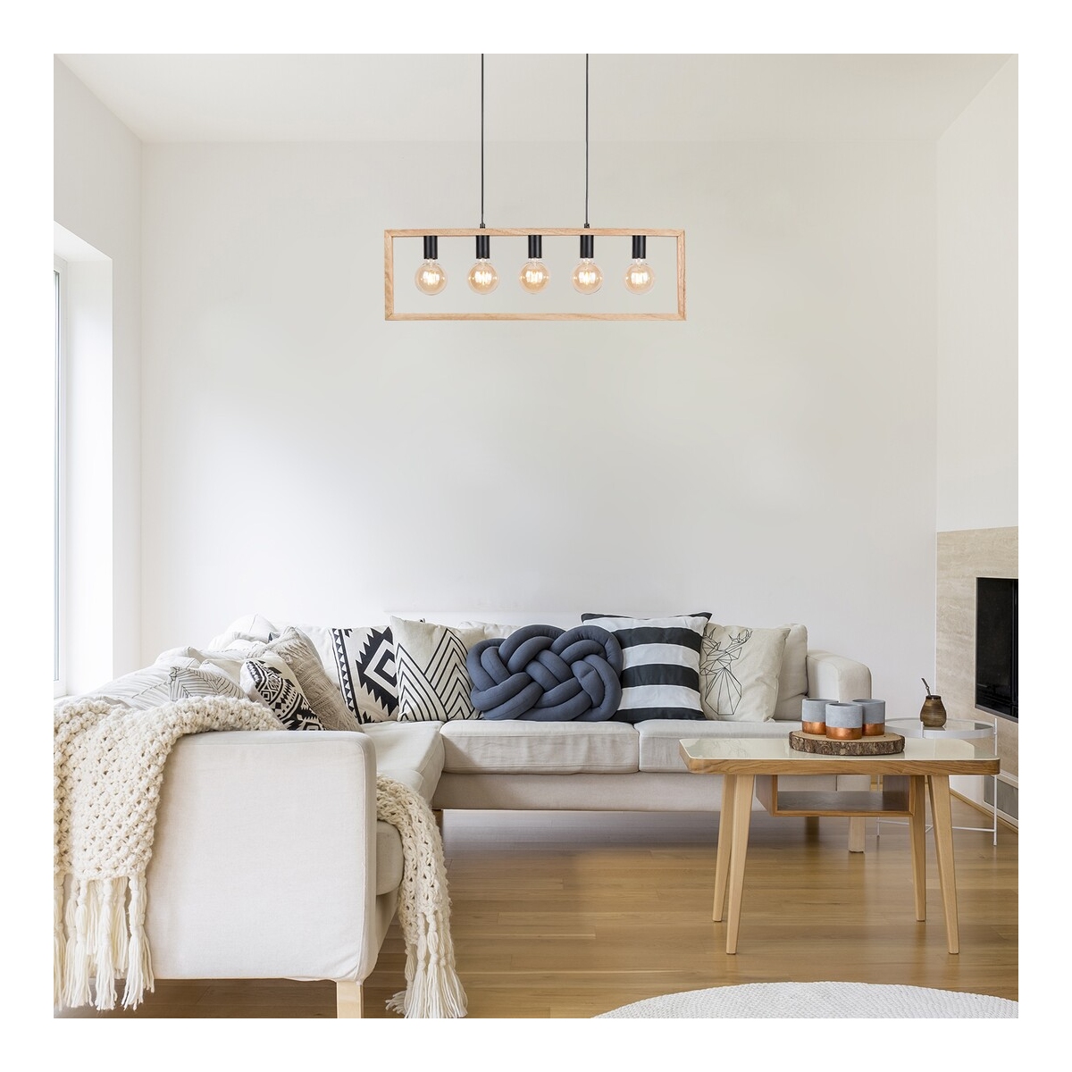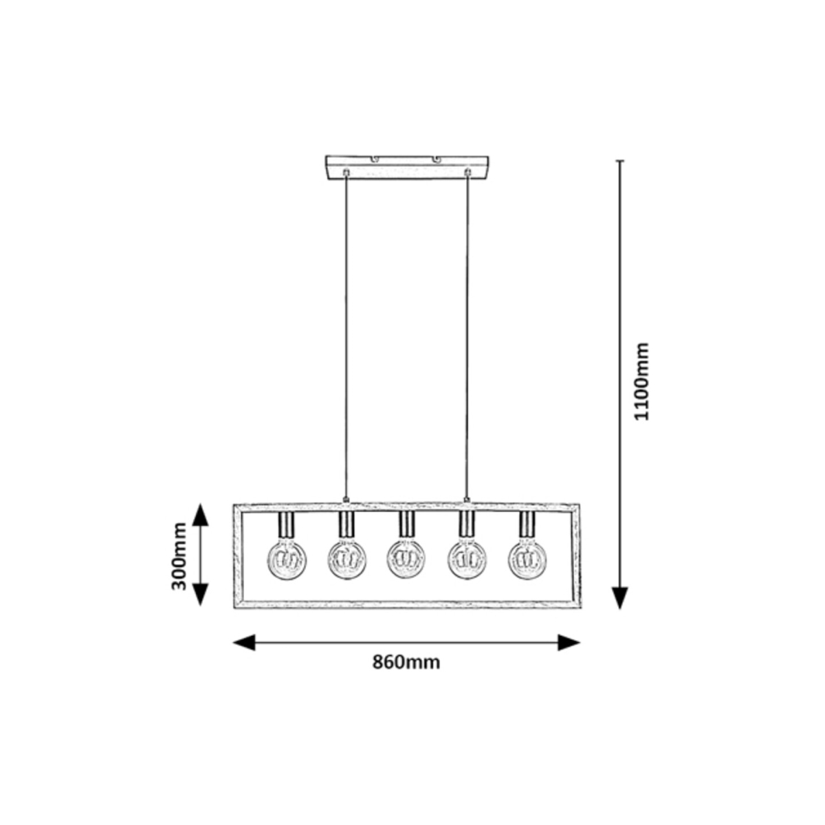 Visilicu INDIGO sa 5 sijalica preporučujemo ljubiteljima nordijskog stila, pre svega u dnevnoj ili spavaćoj sobi. Crne metalne glave lampe su pričvršćene za veliki drveni abažur koji u stvari ne funkcioniše kao abažur, već je to kvadratni drveni element koji podseća na okvir za fotografije. Ovo svetlo se može pričvrstiti na plafon uz pomoć kablova i izdužene kvadratne dekorativne osnove. INDIGO može da se koristi sa pet sijalica, od kojih svaka ima snagu do 40W. Tip grla je E27. Zbog samostojećih sijalica, dobro je koristiti ovo viseće svetlo sa sijalicama nekonvencionalnog, izuzetnog oblika. U zavisnosti od vaših zelja, možete odabrati izvore svetlosti koji zrače toplo ili prirodno belo svetlo. Širina INDIGO visilice je 860 mm, rastojanje od plafona je 1.100 mm. Ovaj model se isporučuje bez izvora svetlosti.