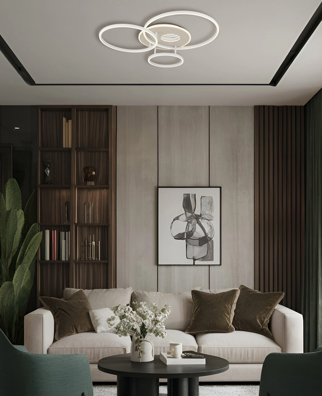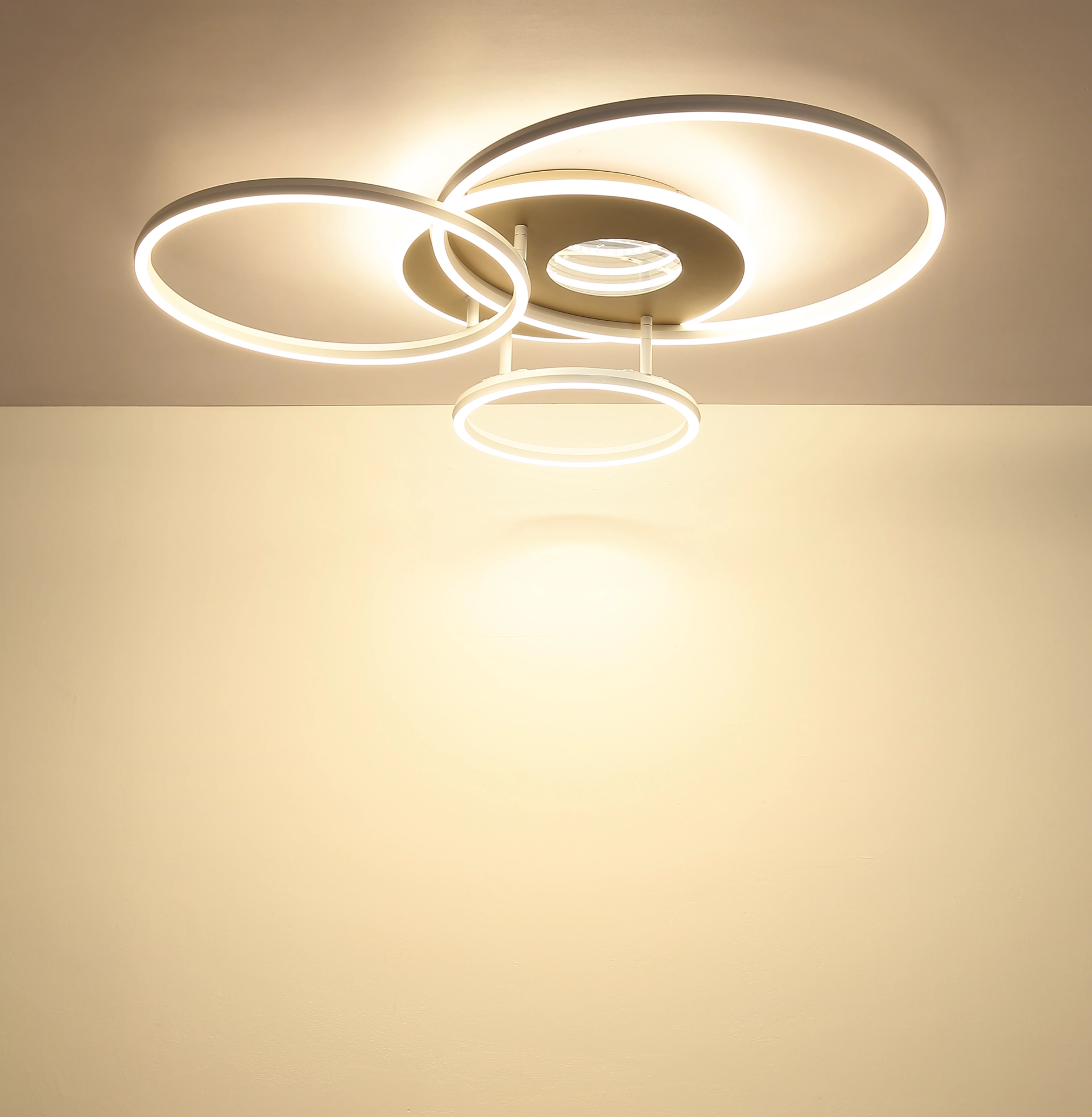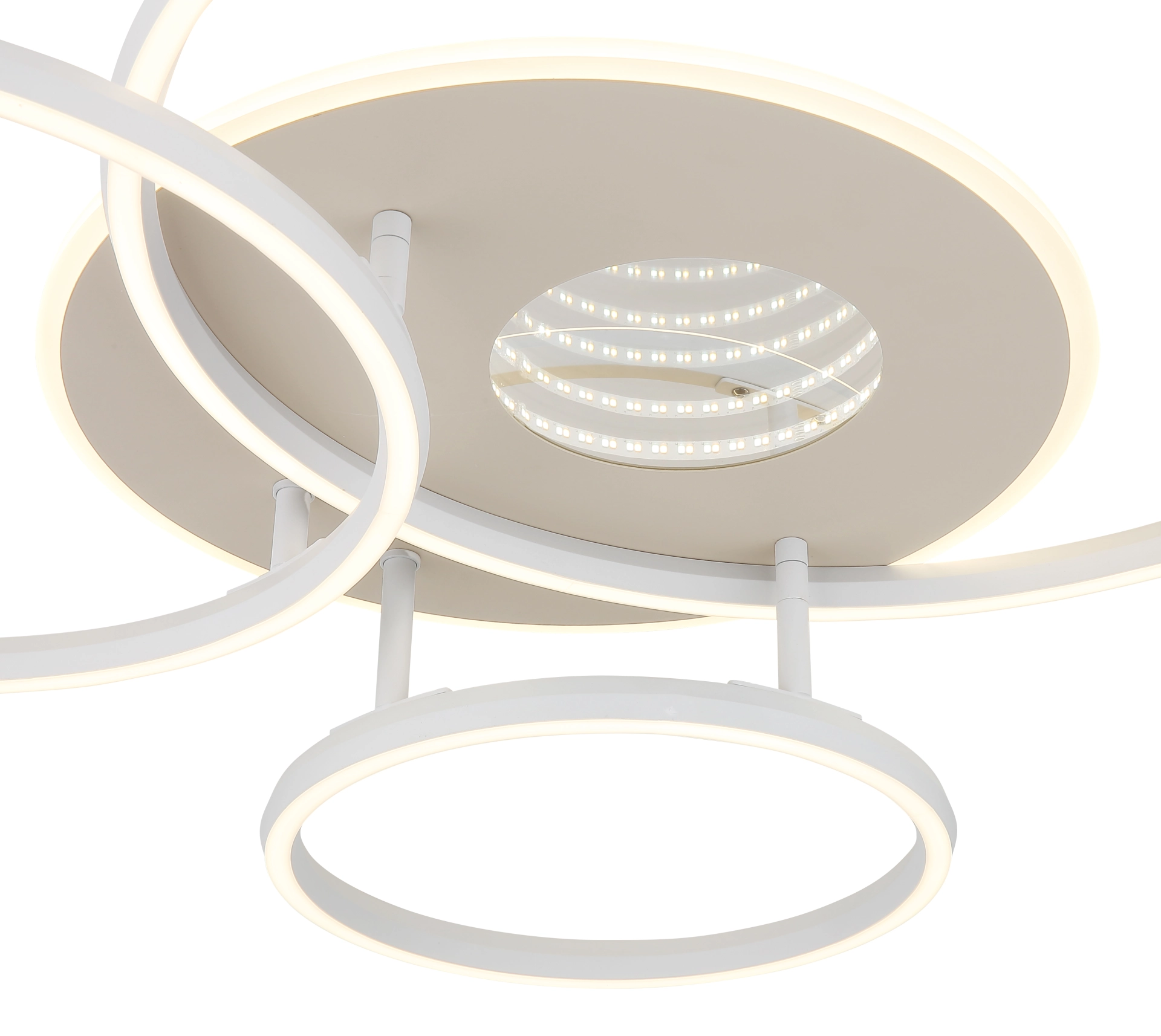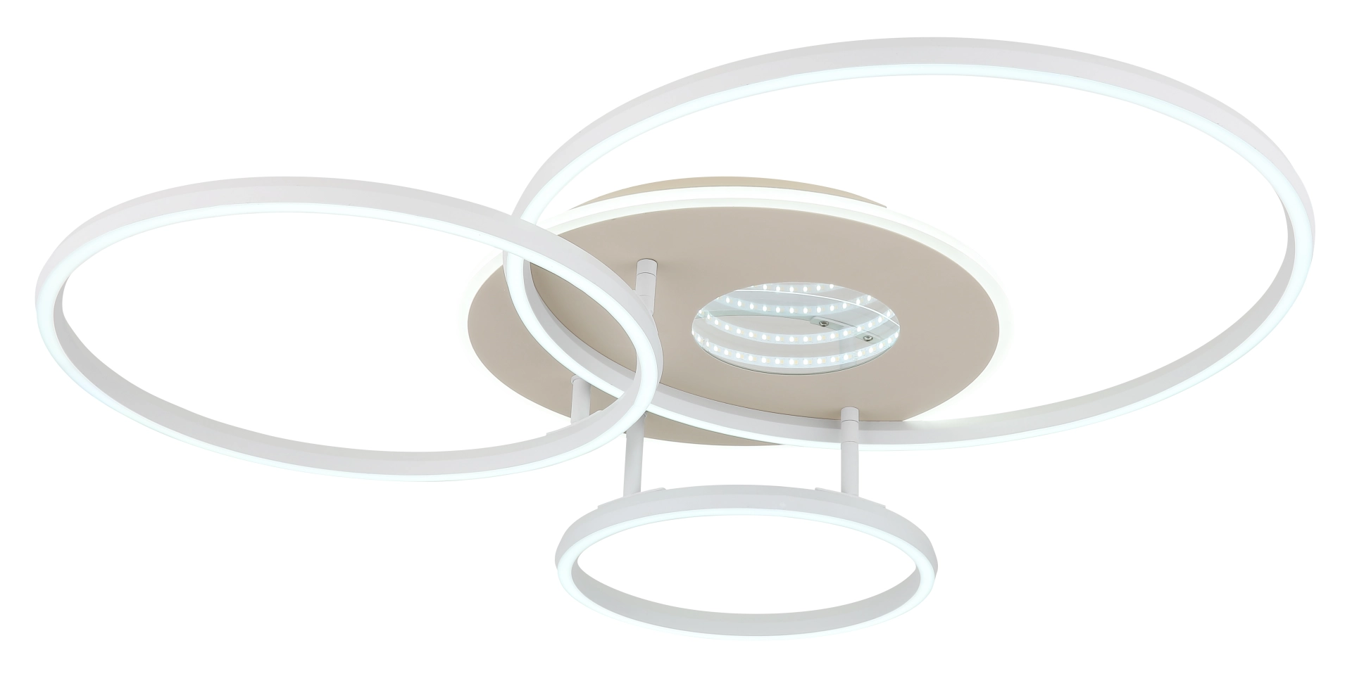 Plafonska lampa INVERTINA impresionira svojim modernim, pravougaonim dizajnom sa četiri pomerana prstena poređana jedan pored drugog, stvarajući zadivljujući 3D efekat. Mat metalno kućište boje peska elegantno dopunjuje abažure od belog mat aluminijuma i opal plastike. Pored toga, abažur od ogledalskog akrila dodaje jedinstvenu dubinu i stilske refleksije svetlosti. Sa velikodušnim dimenzijama od 807 x 700 mm i svetlosnim snagama od 1646 lumena, INVERTINA pruža svetlo, ali prijatno osvetljenje za život i radne prostore. Integrisana LED tehnologija je energetski efikasna i izdržljiva. Uključeni daljinski upravljač omogućava besprekorno podešavanje osvetljenosti i temperature boje od 2700 K (toplo bela) do 6500 K (dnevna svetlost). Fiksne boje, funkcija memorije i praktično noćno svetlo nude maksimalnu udobnost i fleksibilan dizajn osvetljenja. INVERTINA kombinuje inovativni dizajn sa pametnom tehnologijom – idealno za sofisticirane enterijere.