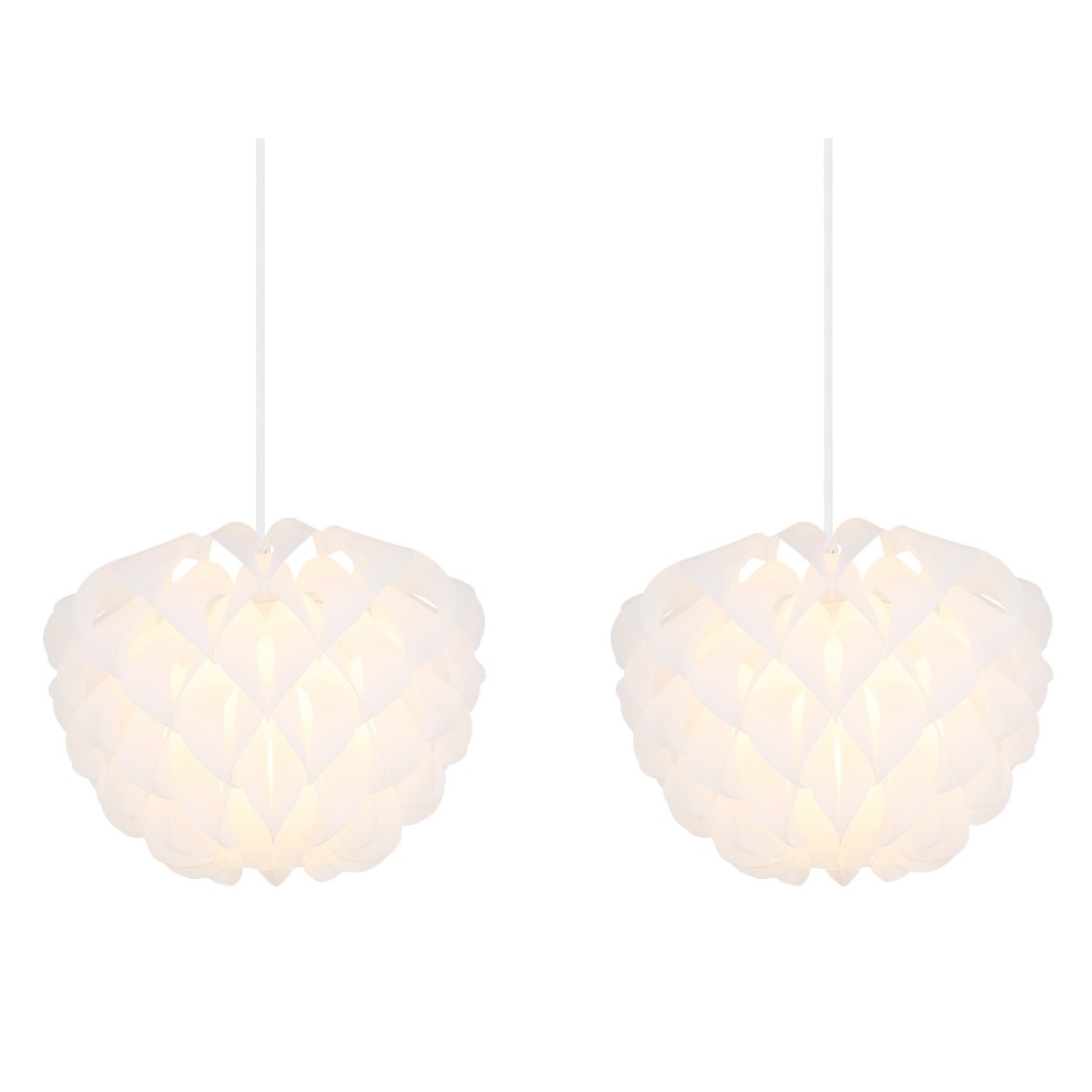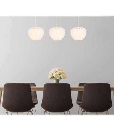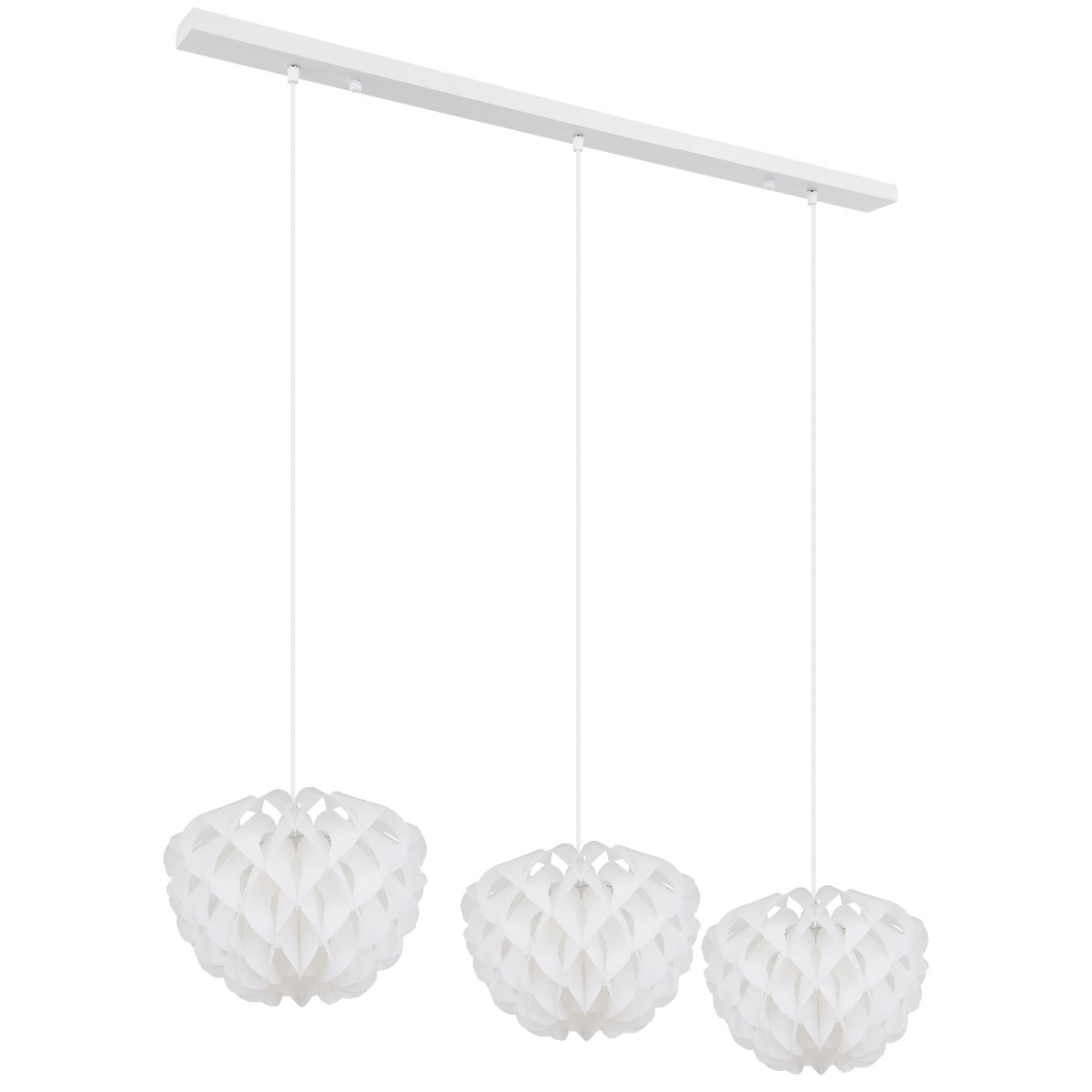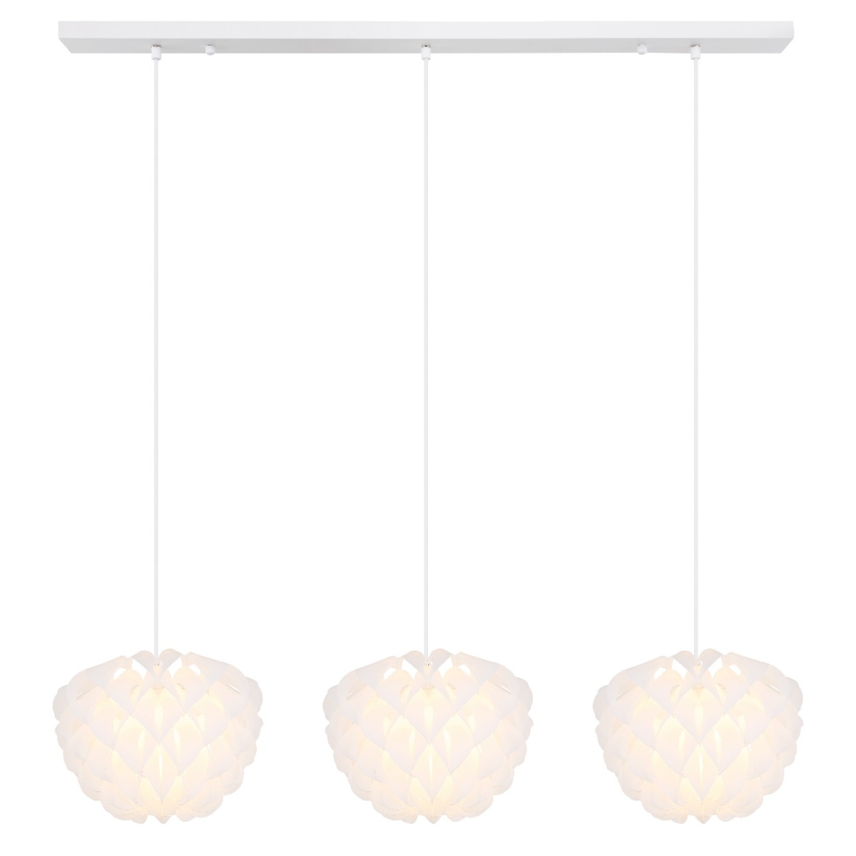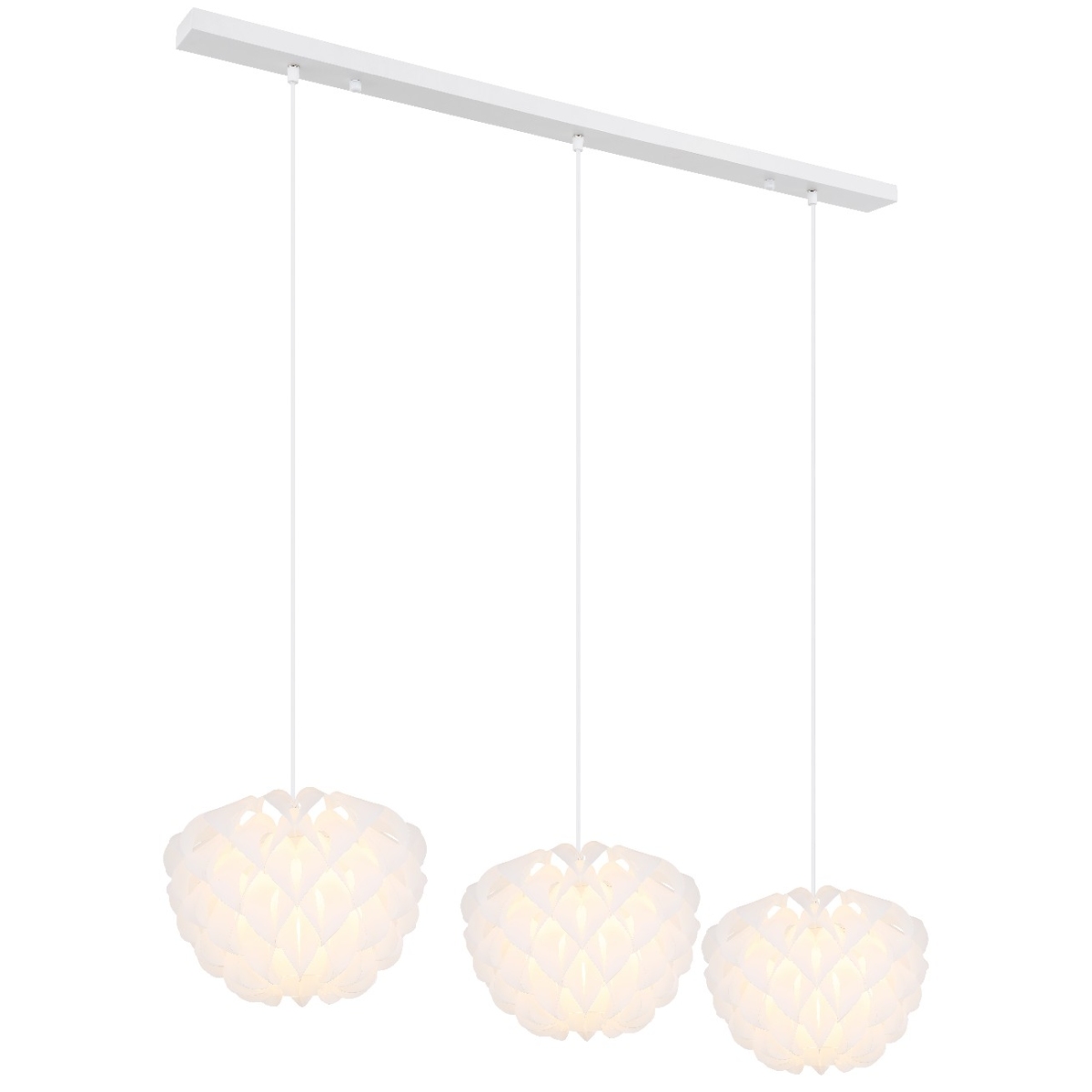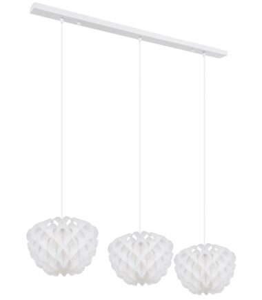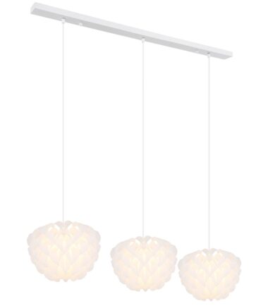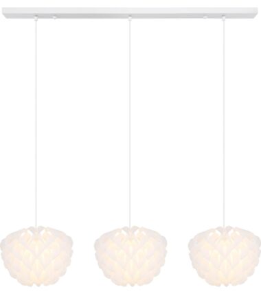 Ova dekorativna visilica inspiriše svojim prelepim dizajnom. Lampa se sastoji od 3 ukrasna lista koja sami sastavljate u abažur (Ø26cm) kako biste održali zabavu u izradi. Tri grla E27 vise na plafonu dužine 101cm pomoću belih kablova 1,2m od plafona i ostavljaju vam mogućnost da odredite boju svetla i jačinu do maksimalne snage od 25 vati.