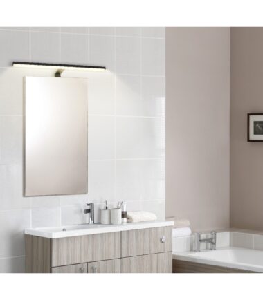 Ova moderna zidna lampa je idealna za bilo koju od vaših soba. LED panel dugačak 60 cm prodire iz crnog metalnog zidnog nosačasa sa prepustom od 12 cm, koji emituje neutralno svetlo od 4000 Kelvina. IP44 stepen zaštite se koristi za zaštitu od prskanja vode.