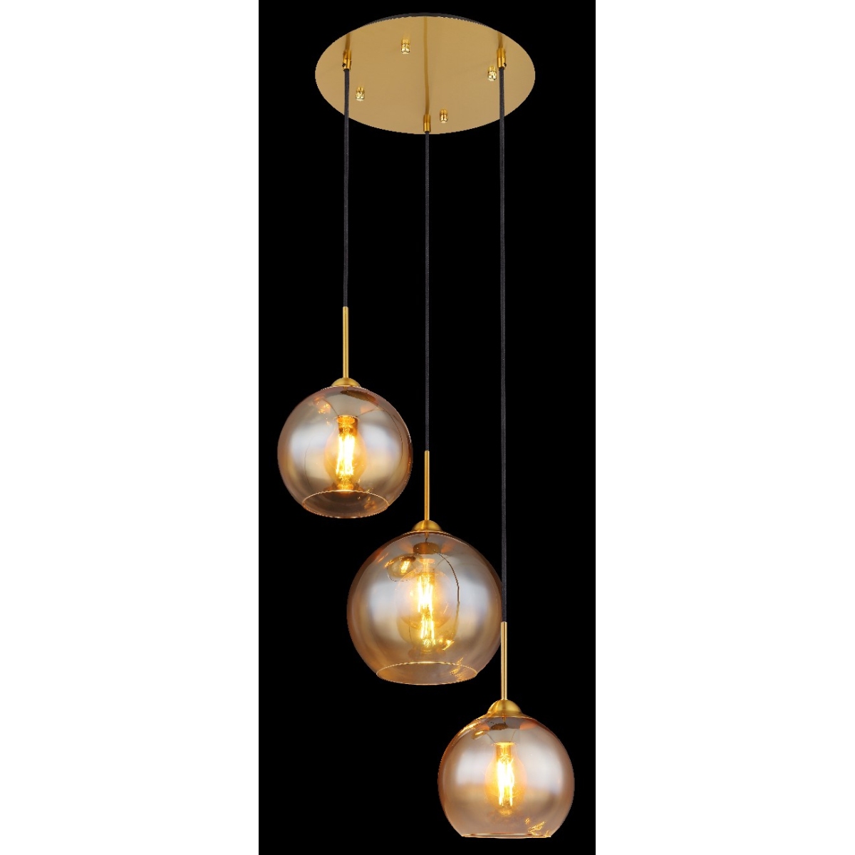 Ova sjajna visilica ističe se jednostavnim dizajnom. Tri kabla do 1,5 m dužine, svaki sa E27 grlom, nastavljaju se na okruglu mesinganu plafonsku osnovu. Stakleni abažuri u boji ćilibara u dve različite veličine pospešuju celokupan izgled lampe. E27 grla vam omogućavaju da sami odredite boju svetla i jačinu do maksimalnog izlaza od 60 vati. Zbog dugovečnosti i uštede energije preporučujemo LED sijalice.