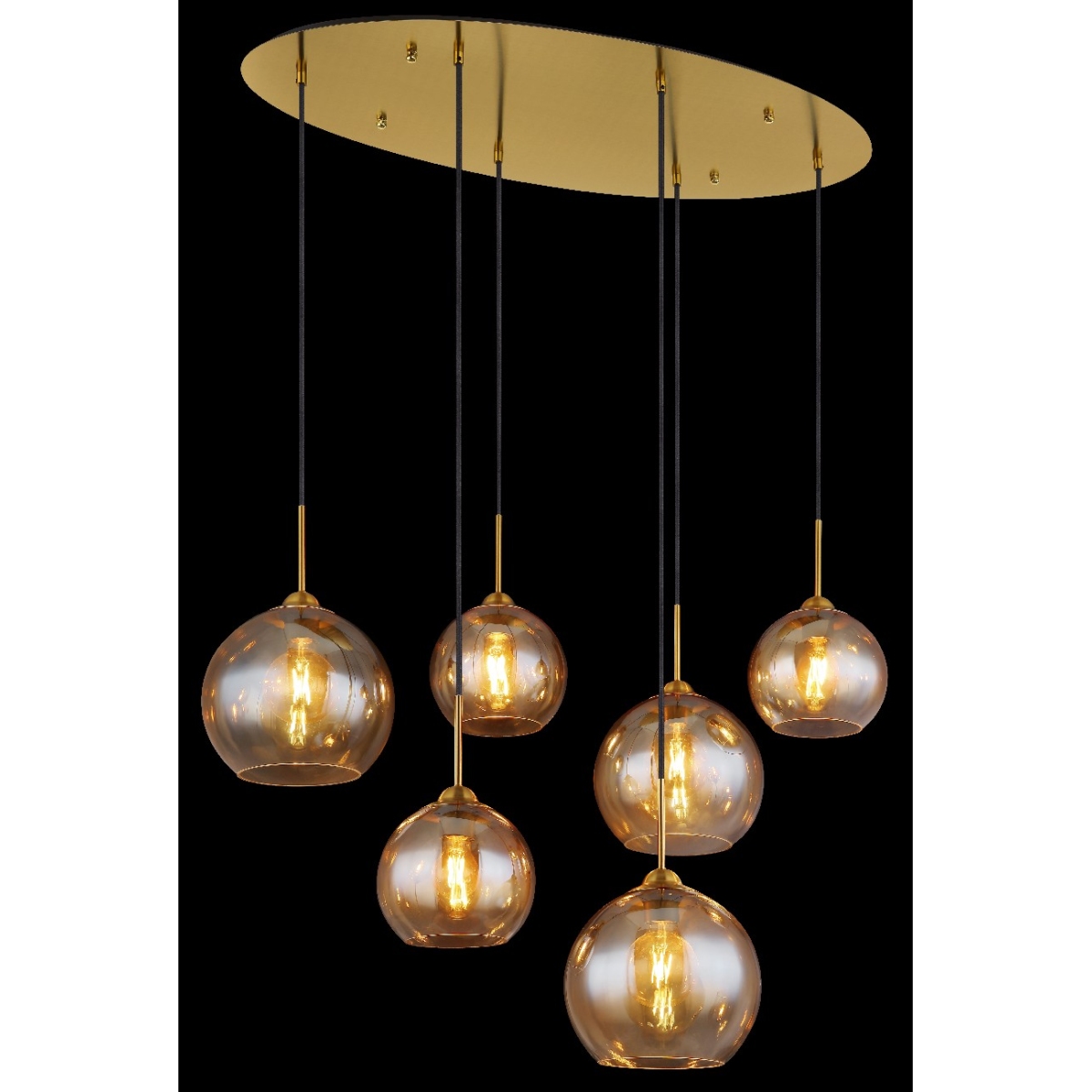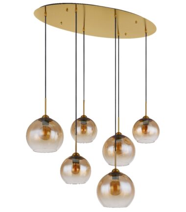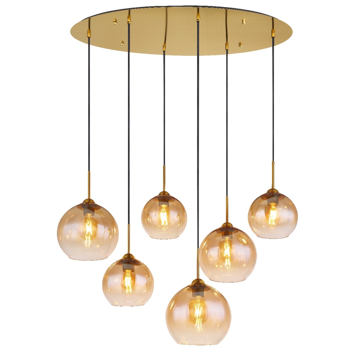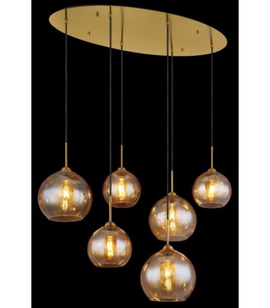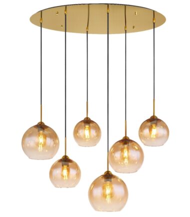 Ova sjajna visilica ističe se jednostavnim dizajnom. Šest kablova do 1,5 m dužine, svaki sa E27 grlom, nastavljaju se na okruglu mesinganu plafonsku osnovu. Stakleni abažuri u boji ćilibara u dve različite veličine pospešuju celokupan izgled lampe. E27 grla vam omogućavaju da sami odredite boju svetla i jačinu do maksimalnog izlaza od 60 vati. Zbog dugovečnosti i uštede energije preporučujemo LED sijalice.