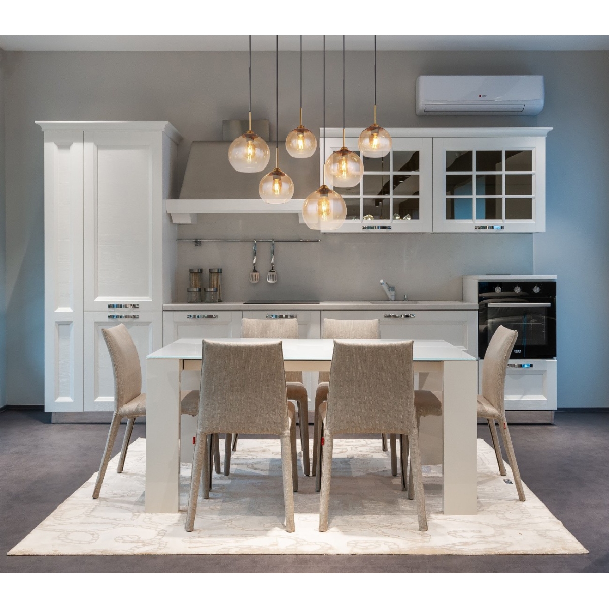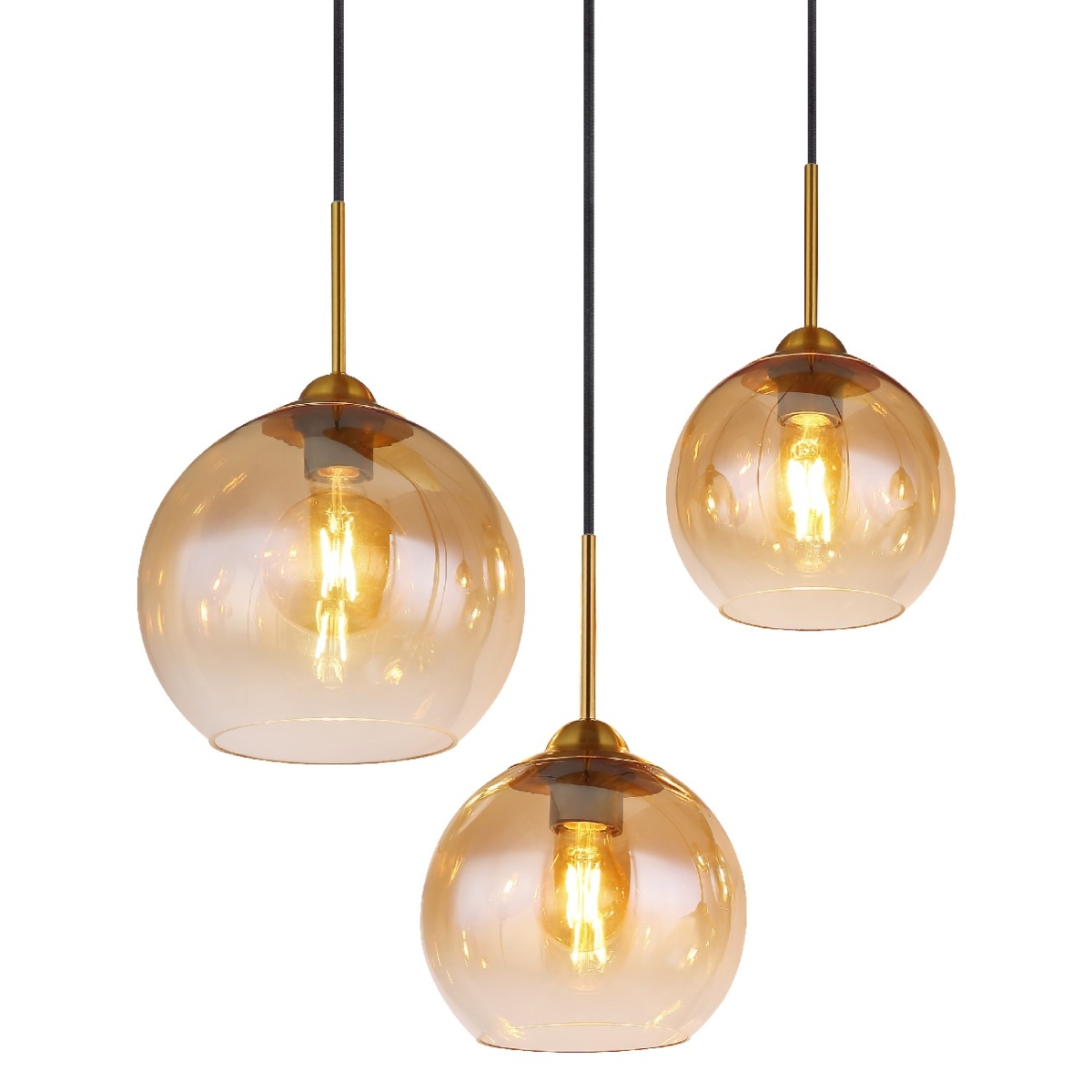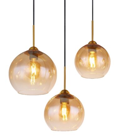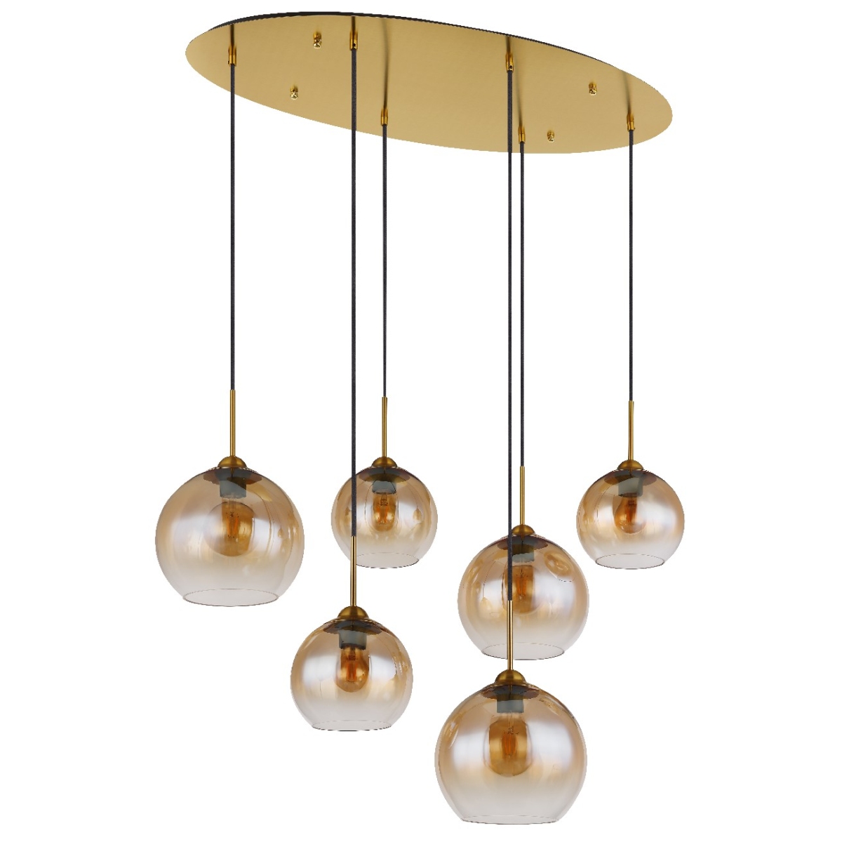 Ova sjajna visilica ističe se jednostavnim dizajnom. Šest kablova do 1,5 m dužine, svaki sa E27 grlom, nastavljaju se na okruglu mesinganu plafonsku osnovu. Stakleni abažuri u boji ćilibara u dve različite veličine pospešuju celokupan izgled lampe. E27 grla vam omogućavaju da sami odredite boju svetla i jačinu do maksimalnog izlaza od 60 vati. Zbog dugovečnosti i uštede energije preporučujemo LED sijalice.