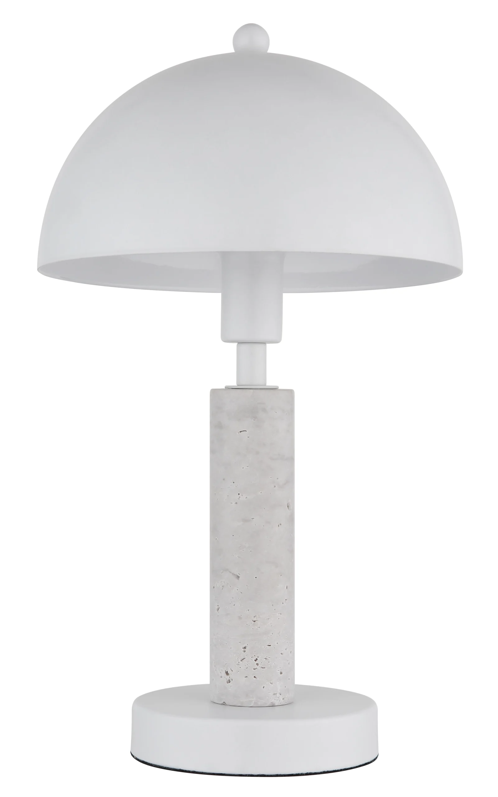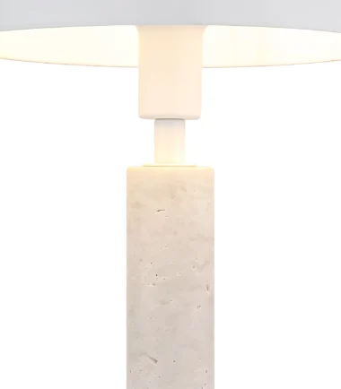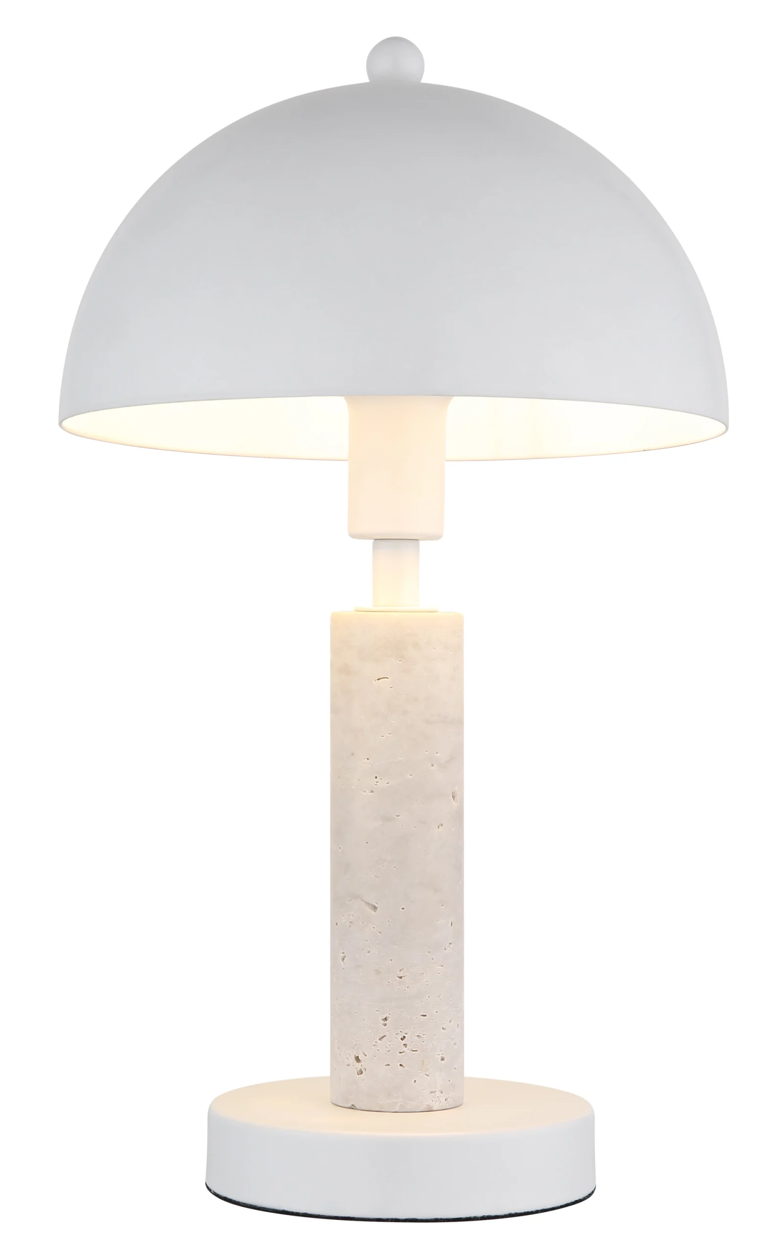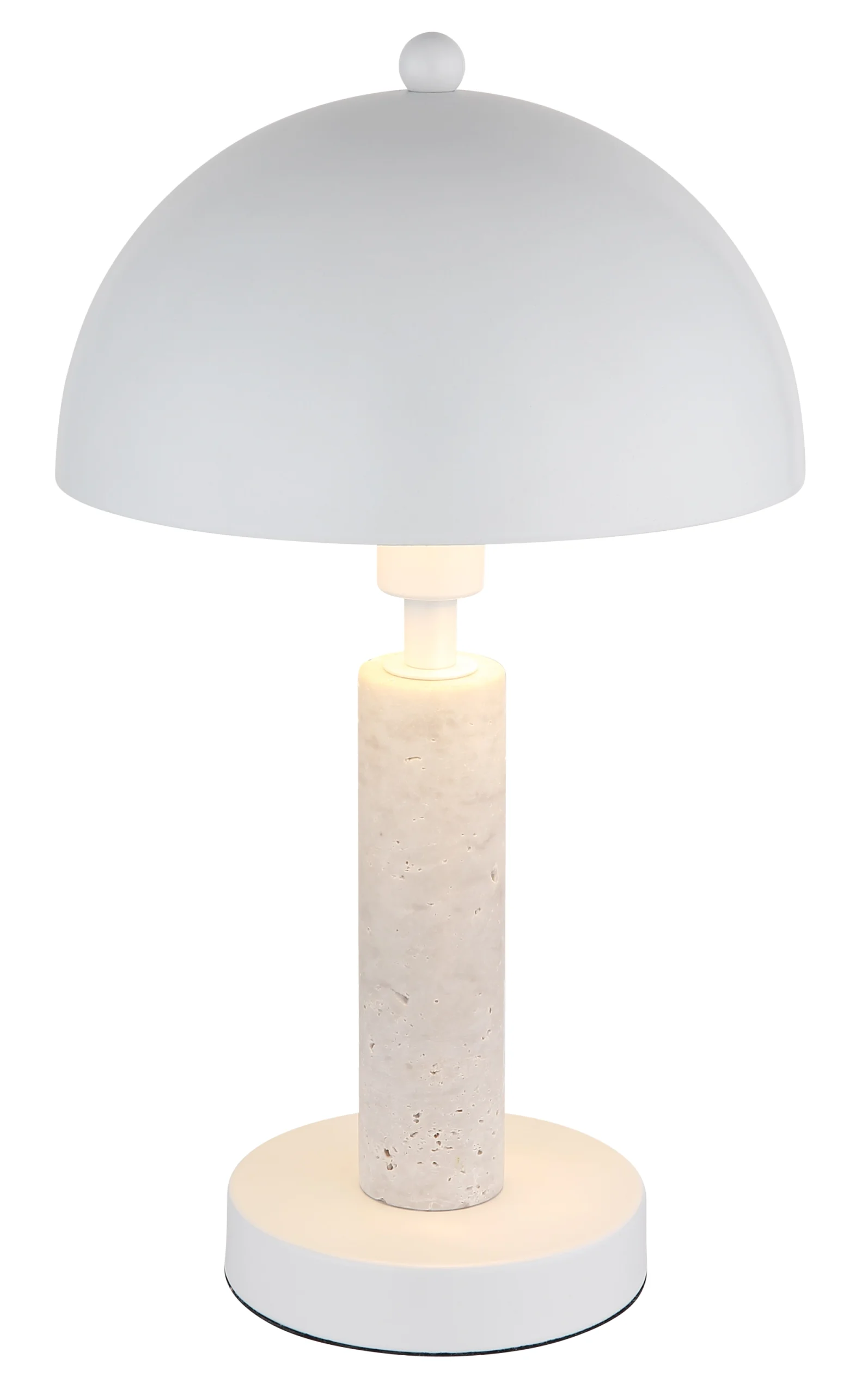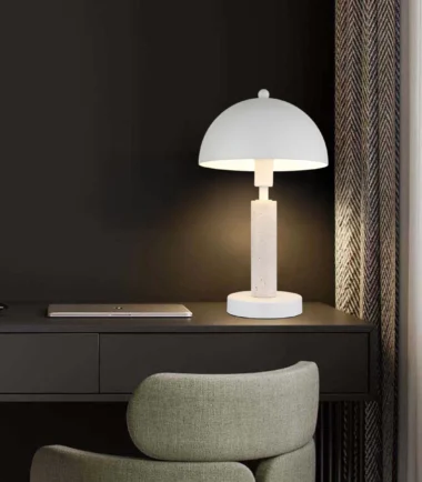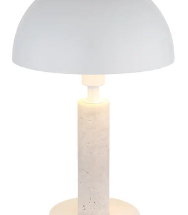 Stona lampa JANIE impresionira svojim okruglim dizajnom u obliku pečurke, kombinujući eleganciju sa funkcionalnošću. Telo je napravljeno od mat belog metala, lepo upotpunjeno belim travertinom koji lampi daje svetao i prijatan izgled. Okrugli abažur, takođe od mat belog metala, stvara skladan celokupni izgled i besprekorno se uklapa u različite stilove enterijera. Sa prečnikom od 200 mm, lampa je kompaktna i idealna za upotrebu na noćnim stočićima, stolovima ili bočnim stočićima. Prekidač na kablu omogućava praktično i jednostavno rukovanje. Snaga lumena je navedena bez sijalice E14, tako da možete pojedinačno odabrati izvor svetlosti. JANIE kombinuje klasičan dizajn sa modernom estetikom i savršen je izbor za one koji traže stilsko i praktično rešenje za osvetljenje.