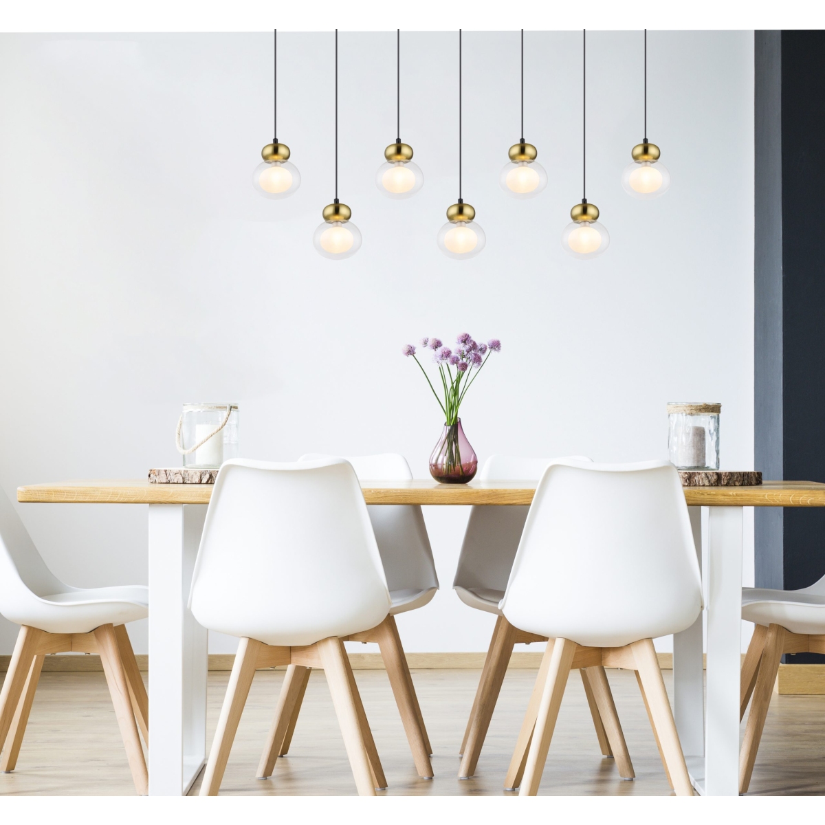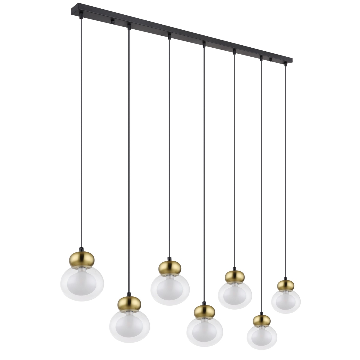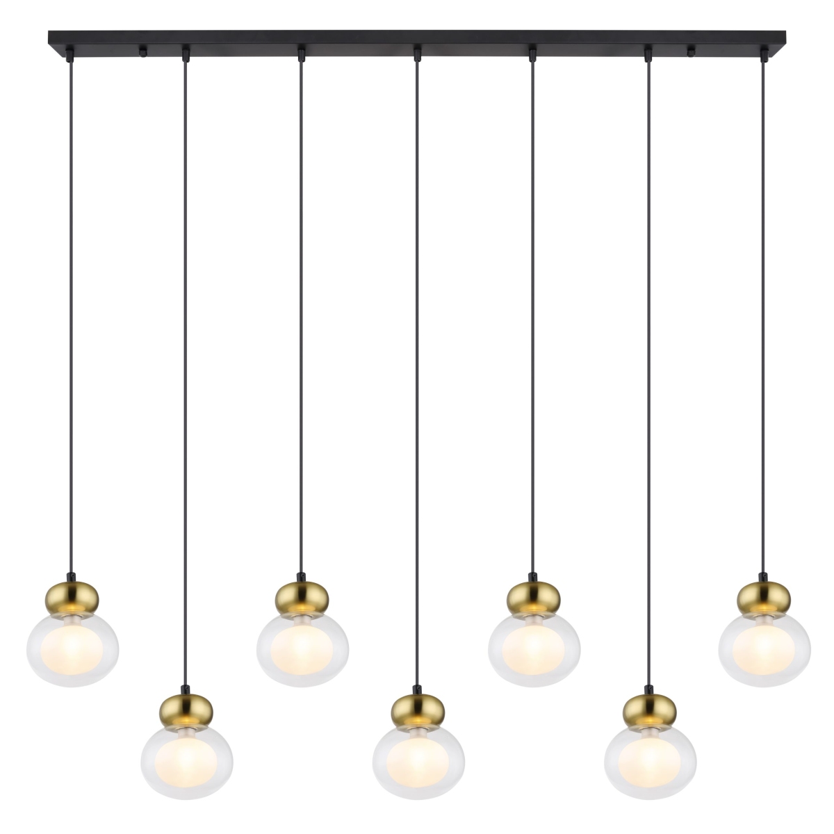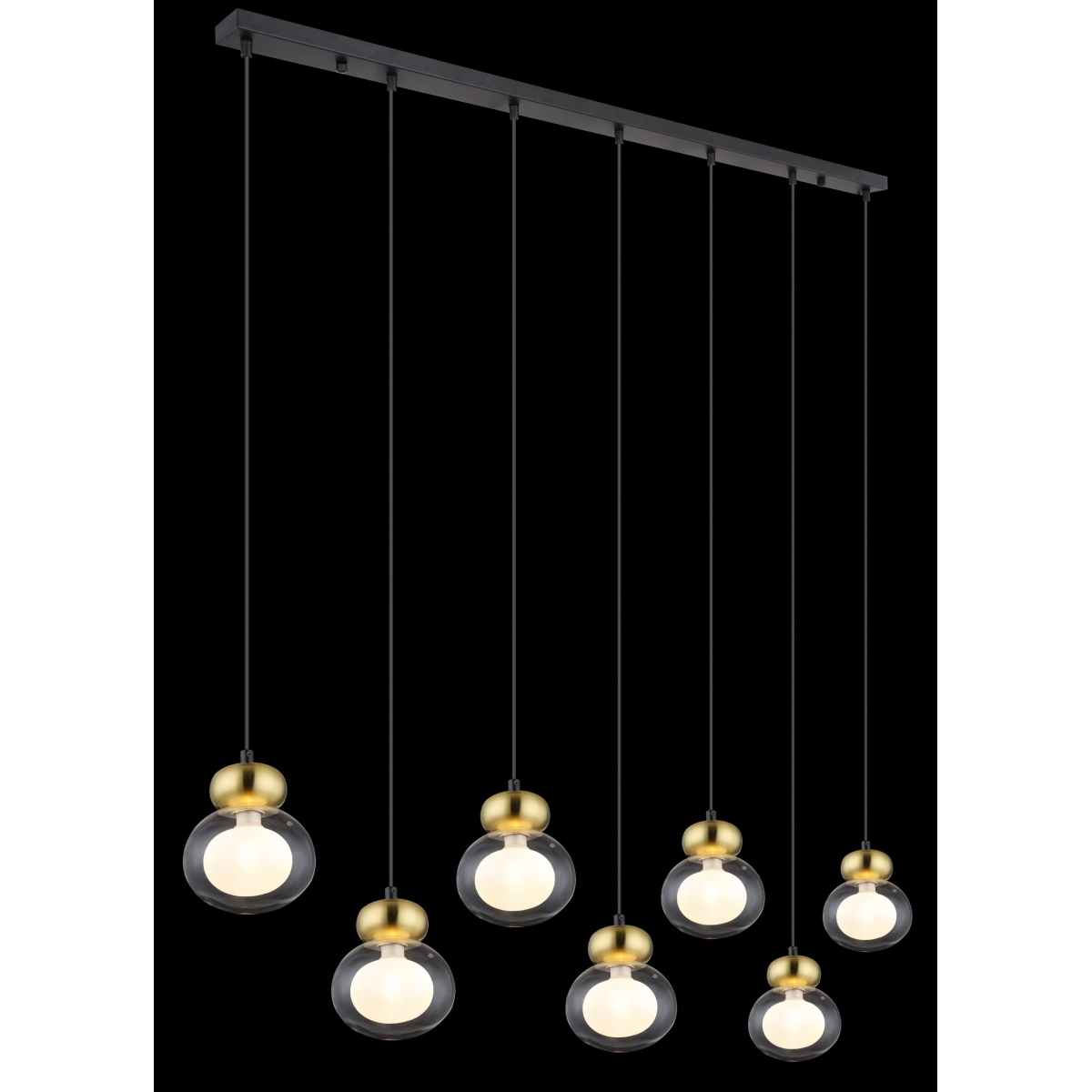 Ova visilica iz serije JAUCY je divna za vaš enterijer. Zahvaljujući svom izduženom obliku, može se idealno montirati preko trpezarijskog stola, koji zatim doživljava jednoobrazno osvetljenje. Osim toga, visilica dugačka 133 cm sastoji se od crne metalne ploče na koju je fiksirano sedam crnih kablova. Imaju G9 grla uokvirena metalnim kupolama bronzane boje sa providnim abažurima i mogu biti opremljena odgovarajućim sijalicama po vašem izboru. To vam pruža mogućnost da pojedinačno odredite boju svetla i jačinu. Pored toga, visina lampe može da se podesi i do 120 cm tokom instalacije. Pomoću ostalih artikala iste serije možete da dovršite celokupnu sliku u svoja četiri zida.