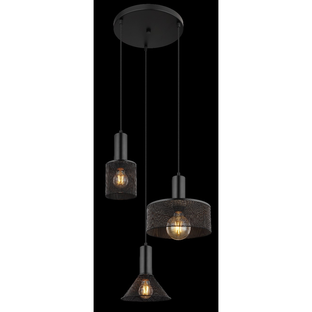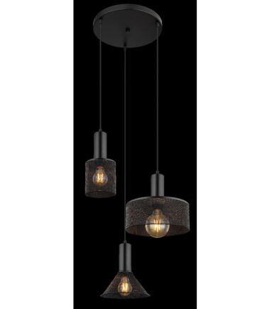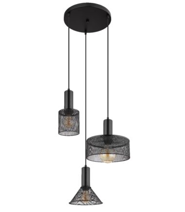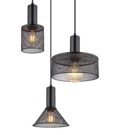Ova sjajna visilica JEDD serije inspiriše elegantnim dizajnom. Od okruglog plafonskog nosača (Ø 40 cm) natavljaju se tri crna kabla različitih dužina, do 1,2 m, od kojih svaki do E27 grla, koja su opremljena oblikovanim različitim abažurima od crne metalne mreža. E27 grla vam omogućavaju da sami odredite boju svetla i jačinu do maksimalnog izlaza od 60 vati. Zbog dugovečnosti i uštede energije preporučujemo LED sijalice.
