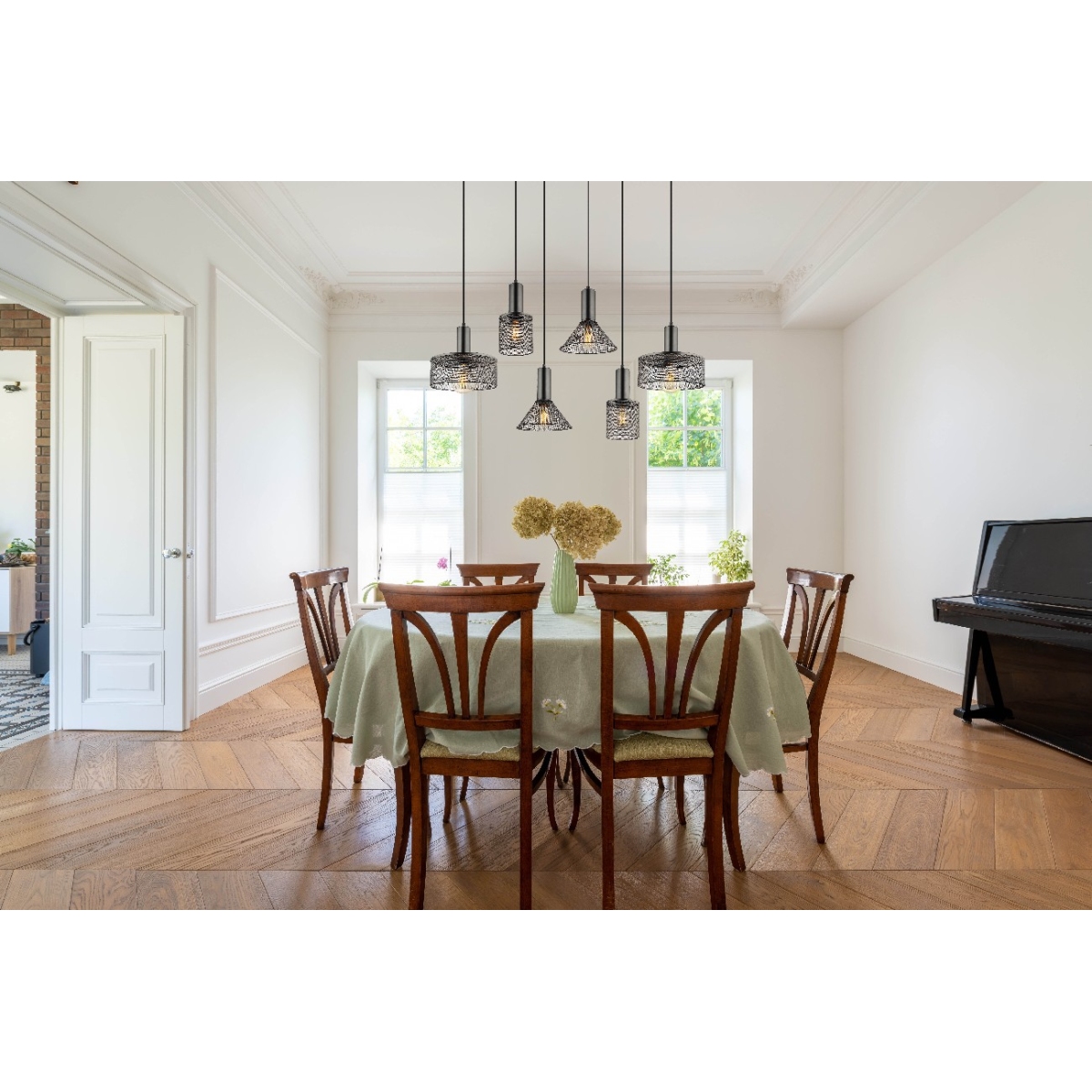 Ova prelepa visilica JEDD serije inspiriše sjajnim dizajnom. Od crne mat ovalne plafonske osnove (107 x 38,5 cm) nastavlja se šest kablova različite dužine, do 1,2 m, svaki do E27 grla. Opremljena su različitim abažurima napravljenim od crne metalne mreže. E27 grla vam omogućavaju da sami odredite boju svetla i jačinu do maksimalnog izlaza od 60 vati. Zbog dugovečnosti i uštede energije preporučujemo LED sijalice.