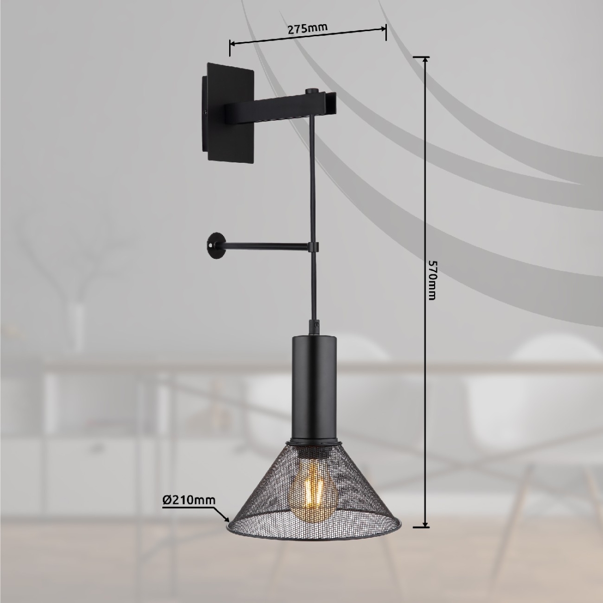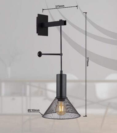 Ova zidna lampa iz JEDD serije je napravljena od crnog mat metala i crne metalne pletenice i ima prekidač na kablu, emituje svetlost nadole. Kabl za povezivanje je uključen u pakovanje i lampa se može povezati direktno ili pomoću kabla za utičnice. Dimenzije su 210 x 570 mm (širina x visina) sa suspenzijom od 275 mm i dužinom kabla od 1500 mm. Grlo E27 vam omogućava da sami odredite boju svetla i jačinu do maksimalne snage od 60 vati. Zbog dugovečnosti i uštede energije preporučujemo LED sijalice.