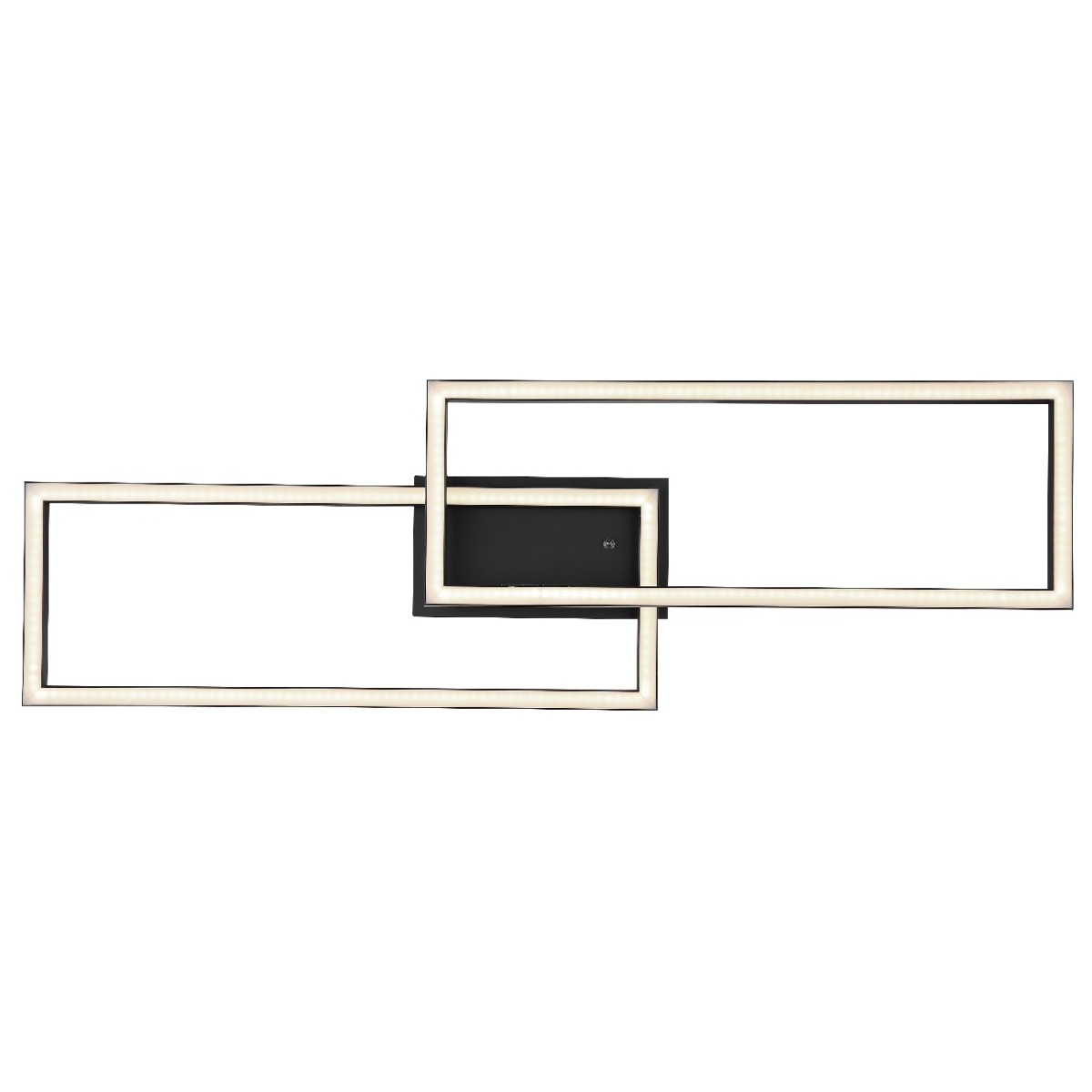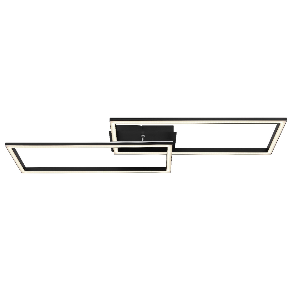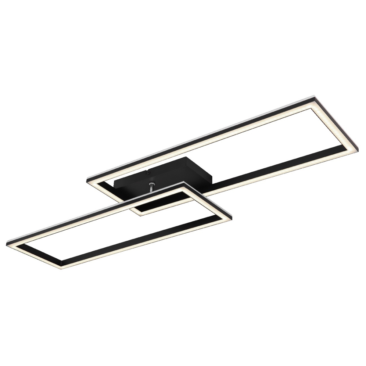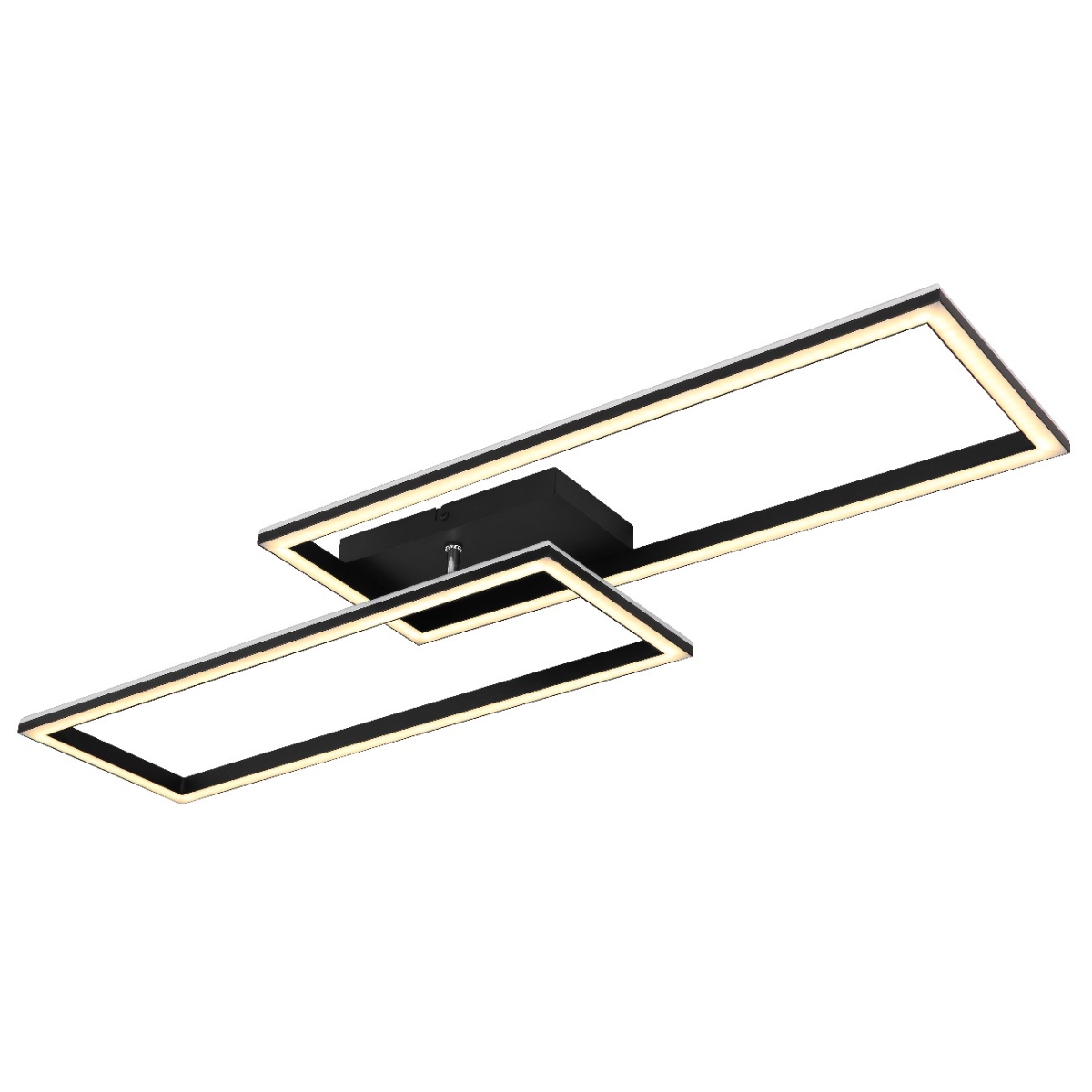 Ova moderna plafonska lampa impresionira sjajnim funkcijama. Na crnoj plafonskoj osnovi postoje dva kvadratna LED panela, koji emituju od 2700 Kelvina toplo belu do 6500 Kelvina hladno belu svetlost. RGB funkcija vam omogućava promenu boje svetla koja se može fiksirati i zatamniti. Pomoću uključenog daljinskog upravljača lampu možete prebaciti u režim noćnog svetla, radi prijatne atmosfere ili upravljati tajmerom i funkcijom memorije.