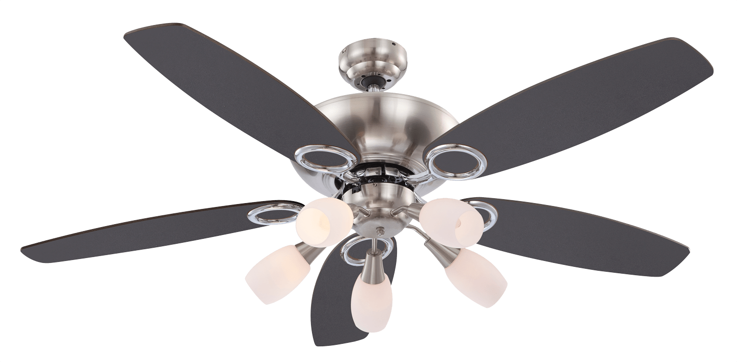 Ovaj model kombinuje prelepu lampu sa plafonskim ventilatorom. Ram je napravljen od metala u mat nikl izgledu, a nosači lopatica rotora su hromirani. Pet belih satenskih stakala lampe okrenuto je u svim pravcima. Lopatice rotora se mogu okretati: jedna strana je u bukovom drvetu, a druga u grafitu. Ovaj model je takođe opremljen prekidačem na povlačenje, koji omogućava regulaciju u 3 stepena. Prečnik ovog modela je 130 cm i stoga je pogodan za velike prostorije do 30 m2. Njegova maksimalna snaga motora je 60 W.