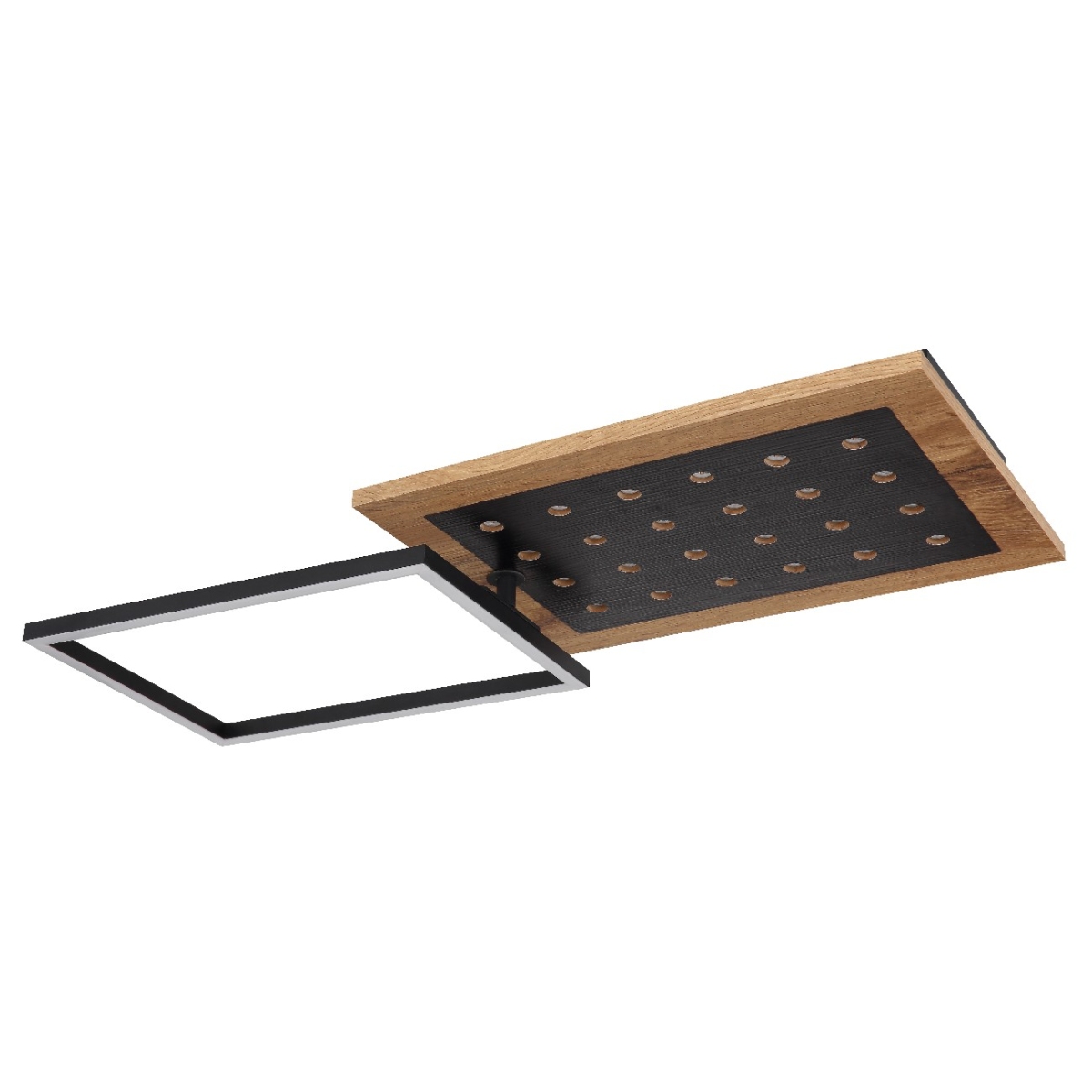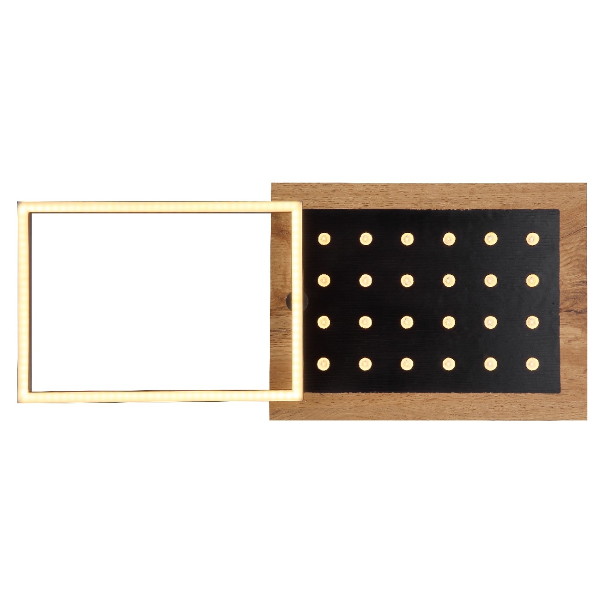 Ova moderna plafonska lampa impresionira svojim sjajnim izgledom. Ona se sastoji od rotirajućeg LED rama i fiksne MDF table drvenog izgleda sa dodatnim LED svetlima maksimalne dužine i širine 63x27cm. Emituje prijatno 3000 Kelvina toplo belo svetlo sa 3 nivoa preko zidnog prekidača i imaju funkciju memorije, u kojoj se pamti poslednja iskorišćena postavka.
