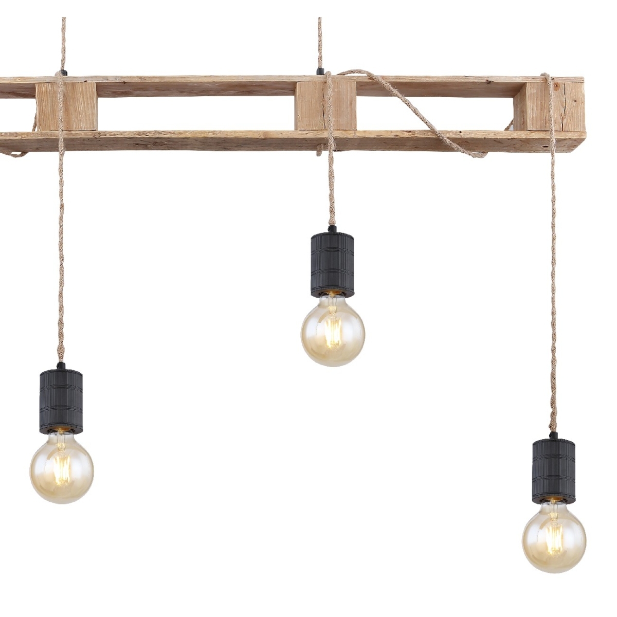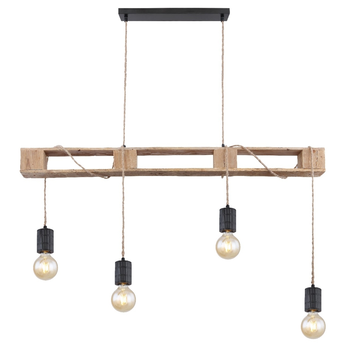 Ova viseća lampa iz serije Joelle impresionira svojim neobičnim dizajnom elementa drvene palete i crnog mat metala. Zbog svog izduženog oblika, viseća lampa dužine 1,21 m može se divno montirati iznad trpezarijskog stola, koji tada dobija ravnomerno osvetljenje. Četiri grla E27 uokvirena crnim mat metalom vise maksimalno 1,2 m od plafona sa konopcem od konoplje obmotanim oko drveta, ali se mogu podesiti i po visini. Grla možete opremiti odgovarajućom sijalicom E27 po vašem izboru, što vam omogućava da odredite boju svetlosti i osvetljenost prema vašim idejama. Sa visećom lampom Joelle možete stvoriti stilski ambijent u svom enterijeru.