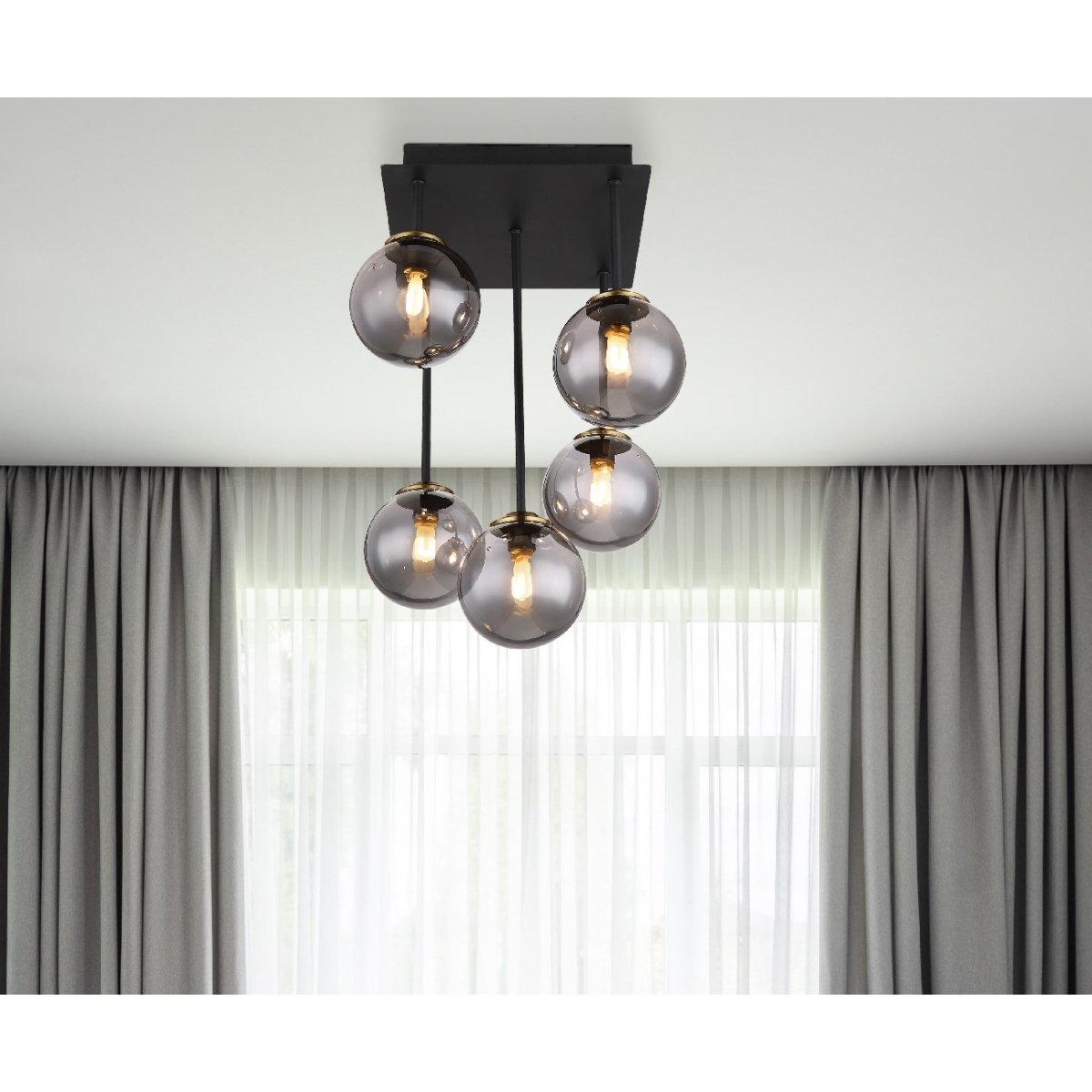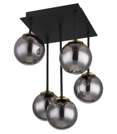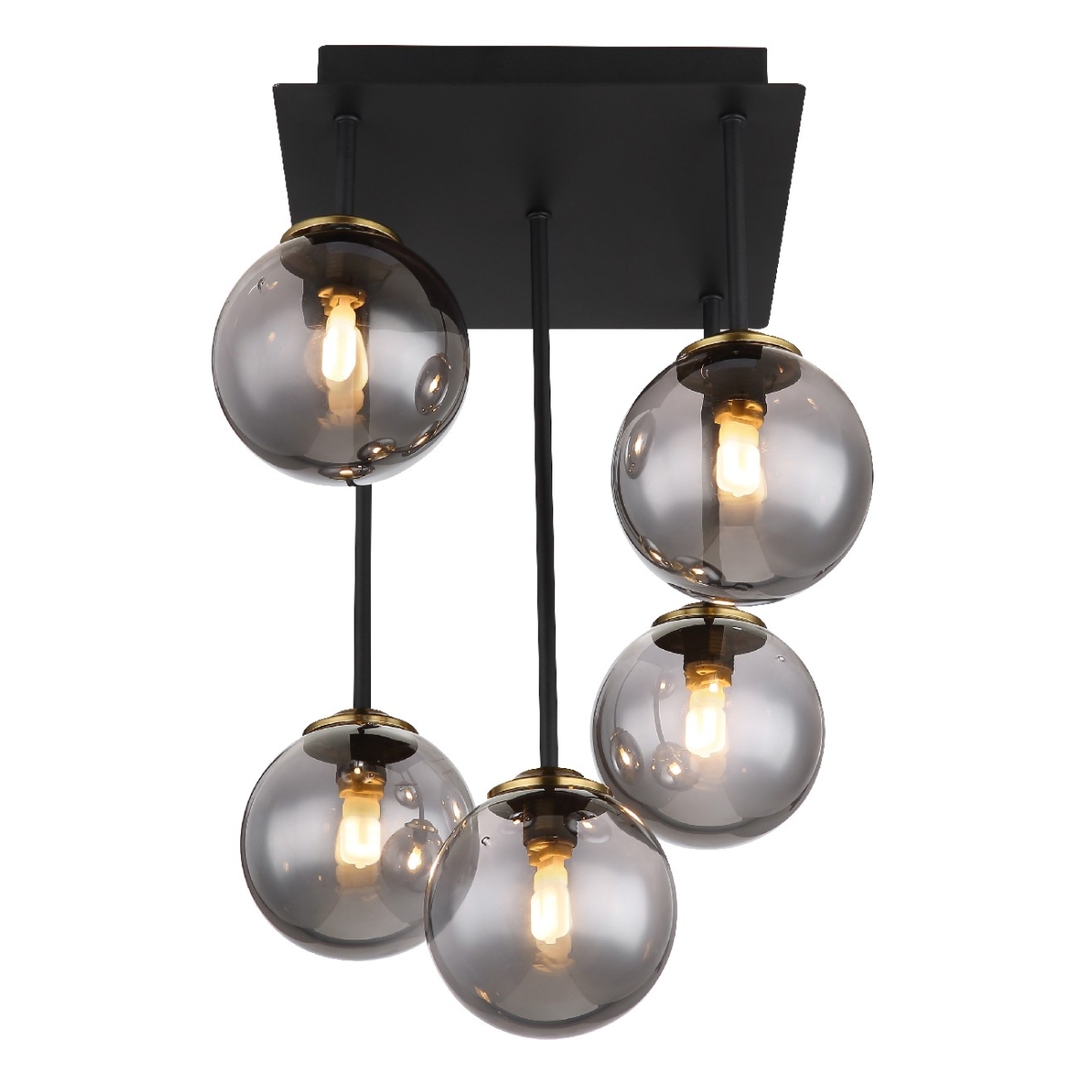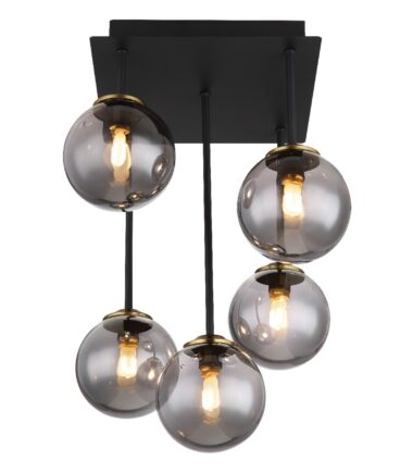 Ova sjajna plafonska lampa inspiriše prelepim dizajnom. Pet prelepih staklenih kugli u boji dima (Ø10cm) visi na crnim mat metalnim šipkama različitih dužina (do 38cm), sa pravougaone plafonske osnove (25x25cm). Grla G9 vam omogućavaju da se odlučite za laganu boju i jačinu do maksimalnog izlaza od 25 vati.