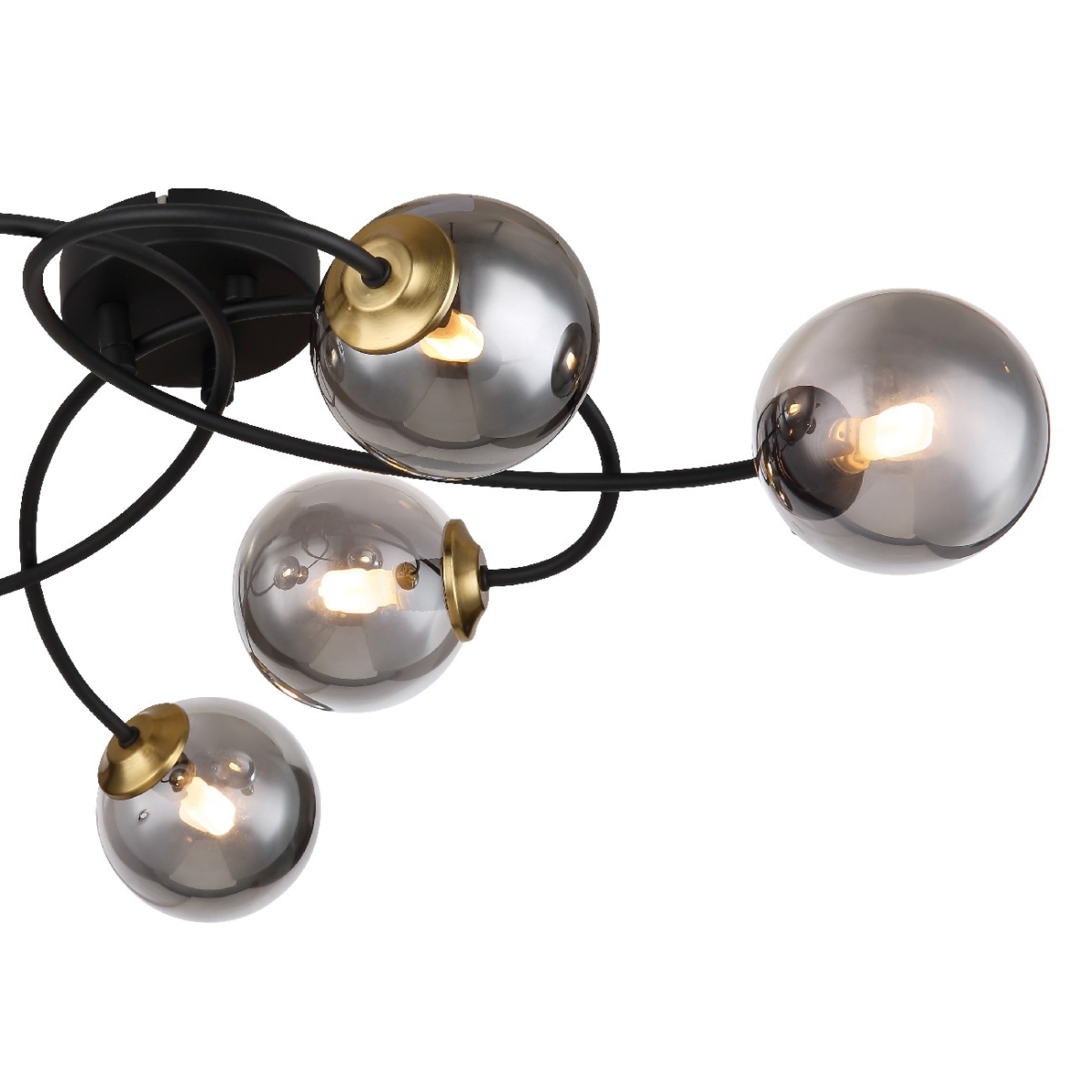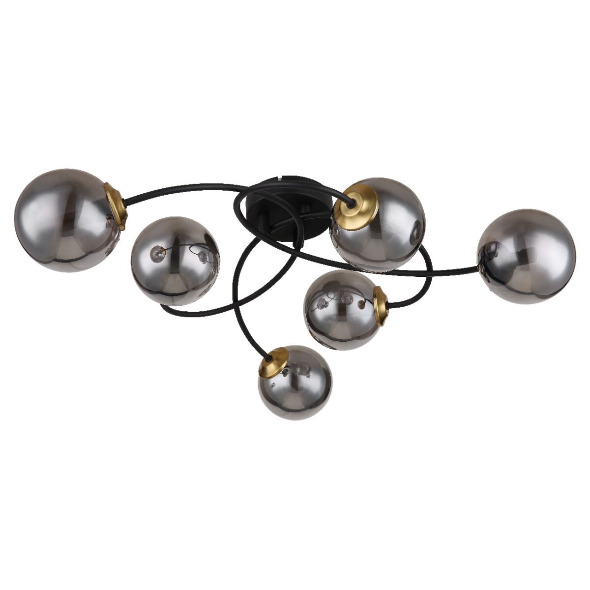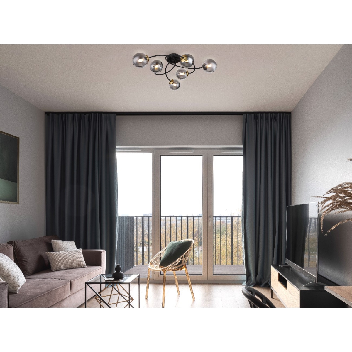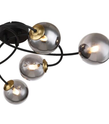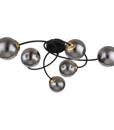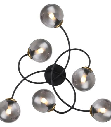 Ova sjajna plafonska lampa inspiriše prelepim dizajnom. Šest prelepih staklenih kugli u boji dima (Ø9cm) sa G9 grlima nalaze se na tri crne mat zakrivljene metalne šipke koje su pričvršćene za okrugli plafonski nosač. Grla G9 vam omogućavaju da se odlučite za laganu boju i jačinu do maksimalnog izlaza od 25 vati.