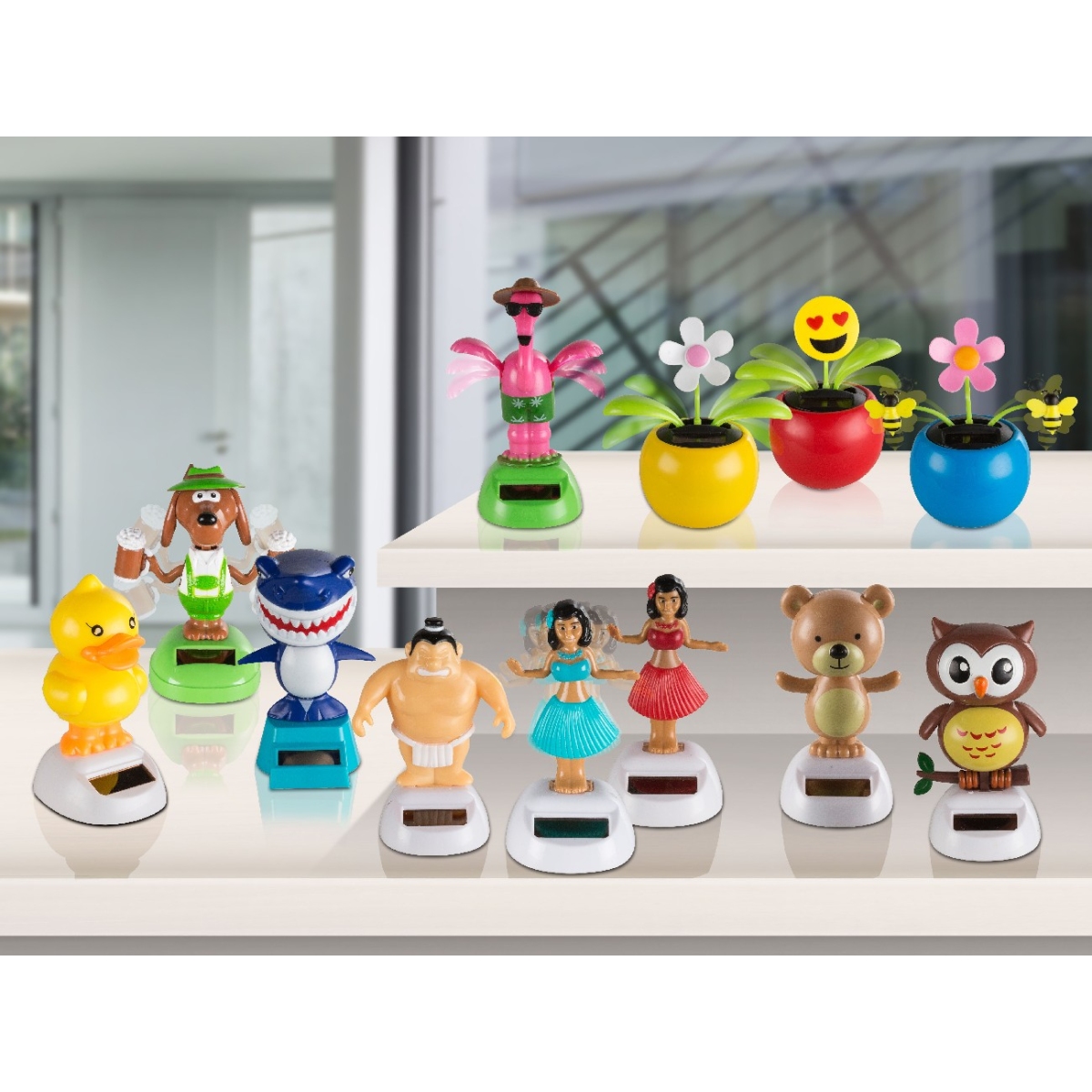 Prizor ovih solarnih svetala zahteva malo reči, ove neodoljive lampe vibriraju pomoću solarne funkcije. One su vrhunac svake bašte ili dečije zabave. U njemu se nalazi 12 različitih likova: hula plesači, sumo rvači, cveće, medvedi, patke, sove, ajkule, psi i flamingosi. Sa po 6 delova različitih motiva, ovaj displej unosi radost u vaš životni prostor sa 72 komada.