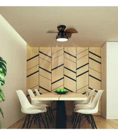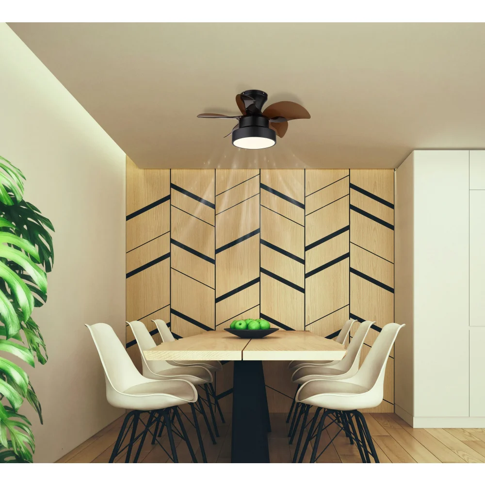 Okrugli plafonski ventilator KARI kombinuje moderan dizajn sa visokom funkcionalnošću. Sa svojih pet zakrivljenih krila napravljenih od smeđe plastike i kućištem od mat crnog metala, svakoj prostoriji daje stilski akcenat. Abažur od crnog metala i opal bele plastike obezbeđuje ravnomernu raspodelu svetlosti bez odsjaja. Integrisano LED osvetljenje nudi snažno osvetljenje sa svetlosnim izlazom od 2570 lumena. Zahvaljujući CCT tehnologiji, temperatura boje se može fleksibilno podesiti od 3000 K do 6000 K – savršeno za bilo koje doba dana i raspoloženje. Sa fiksnim bojama i praktičnom funkcijom memorije, vaše lično podešavanje se uvek čuva. Daljinski upravljač koji je uključen u isporuku omogućava praktično upravljanje svetlom i ventilatorom. KARI impresionira kao funkcionalan ventilator sa snažnim performansama i estetskim prisustvom – idealan za moderne životne i radne prostore.