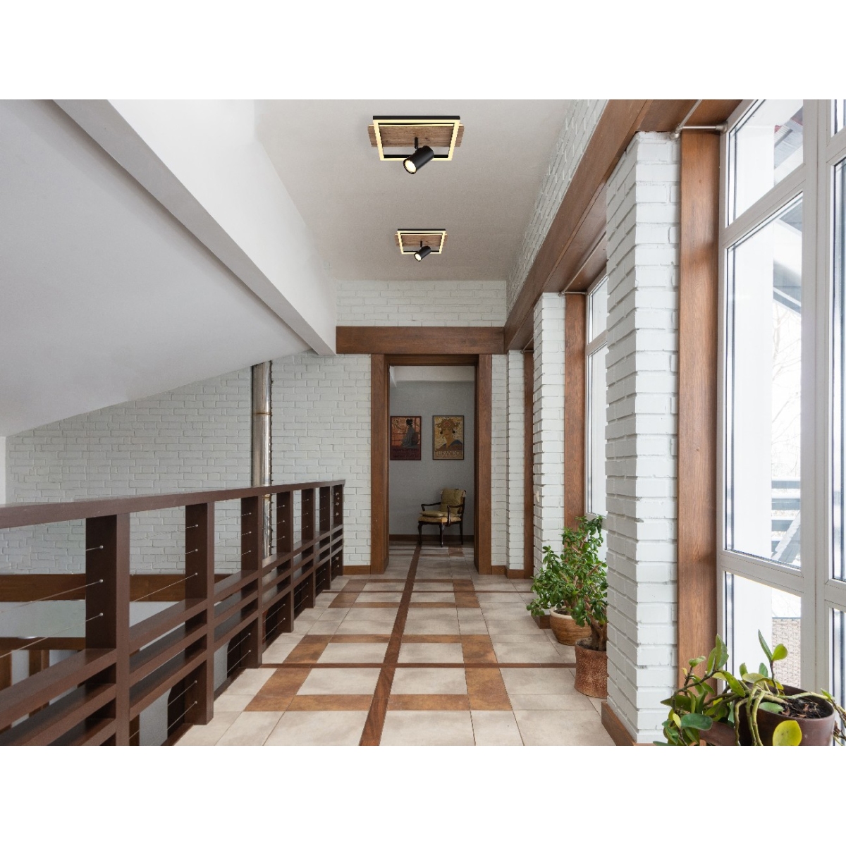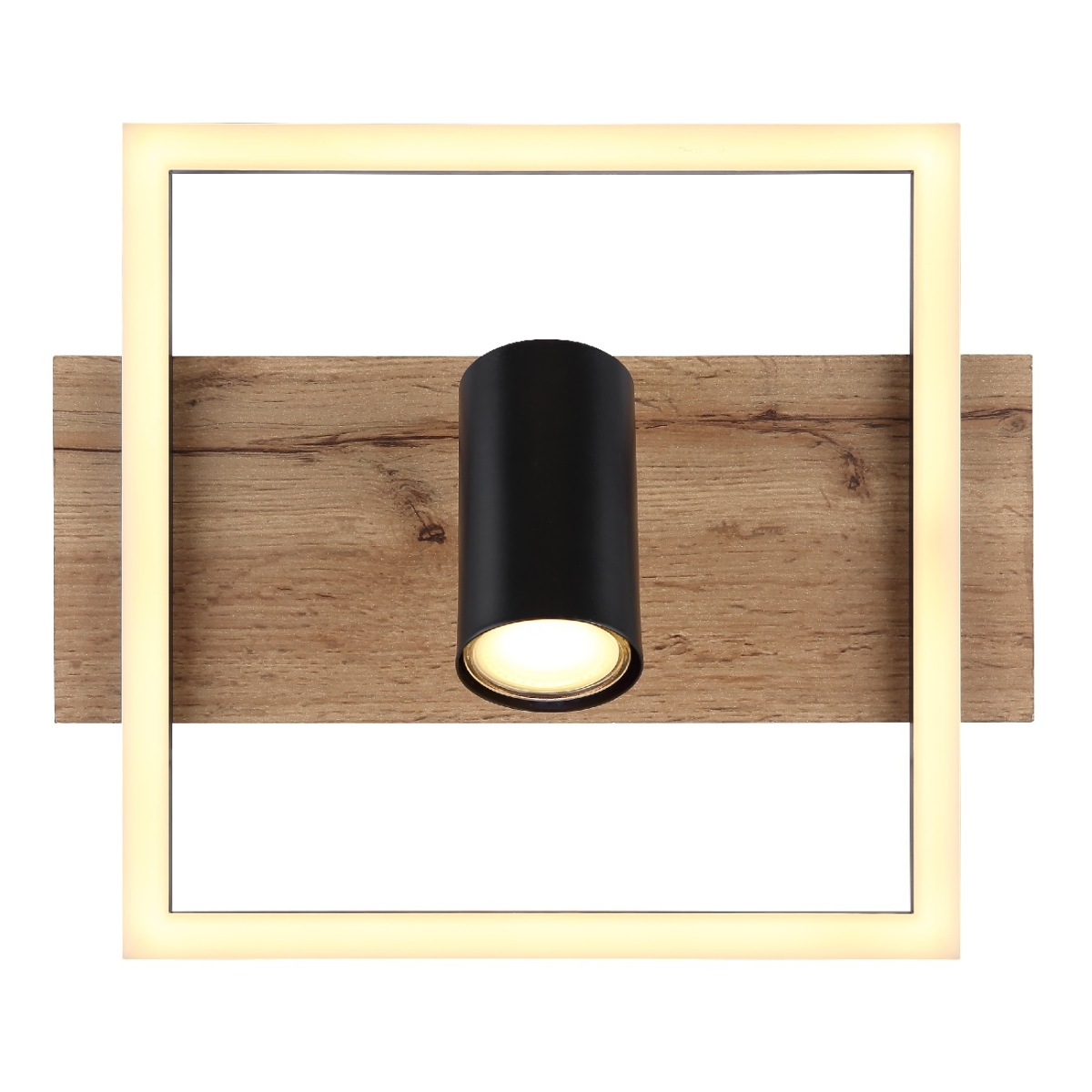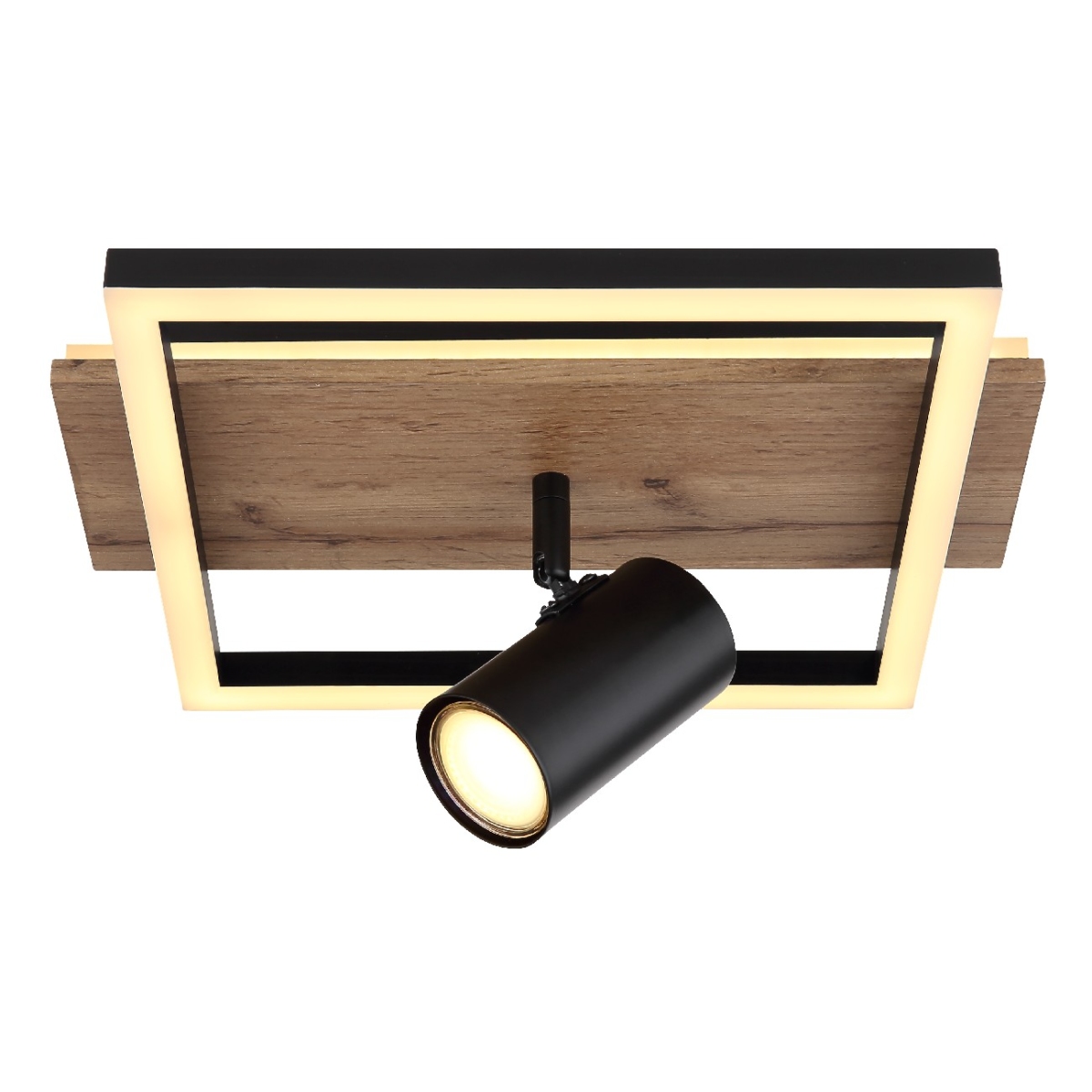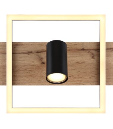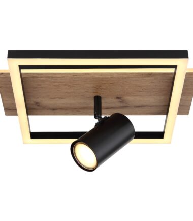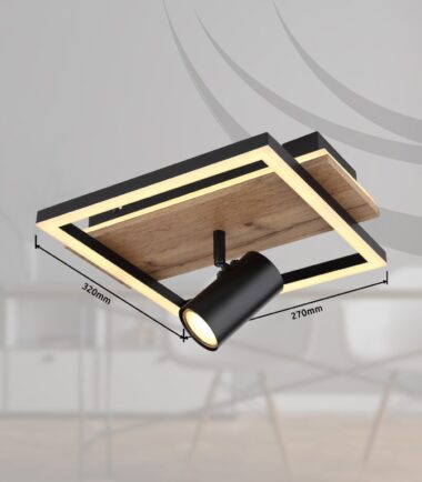Ova divna plafonska lampa inspiriše prelepim dizajnom. Od pravougaonog plafonskog nosača (32x27cm) sa ukrasima drvenog izgleda i dva LED panela, prodire rotirajuće grlo GU10. Ono emituje 3000 Kelvina toplo belo svetlo i tako obezbeđuju prijatnu atmosferu. Pored toga, lampa ima funkciju memorije preko zidnog prekidača i može da se menja u 3 faze. U prvoj fazi zasvetli okrugli LED panel, druga etapa se koristi za rotirajuću sijalicu i treća etapa za celokupno plafonsko svetlo.