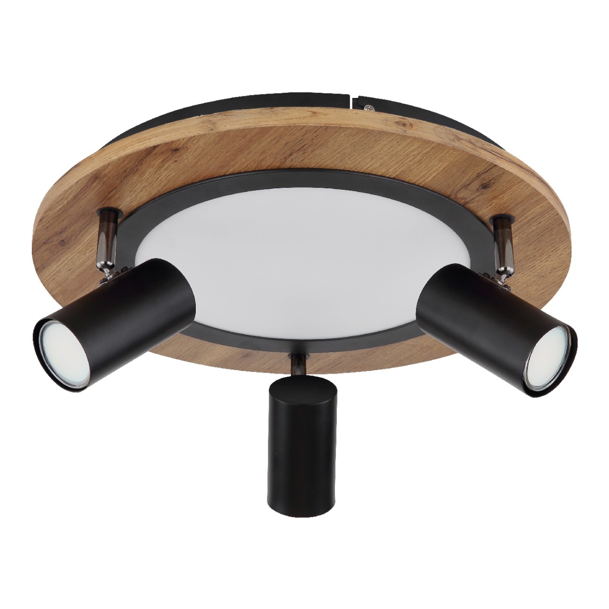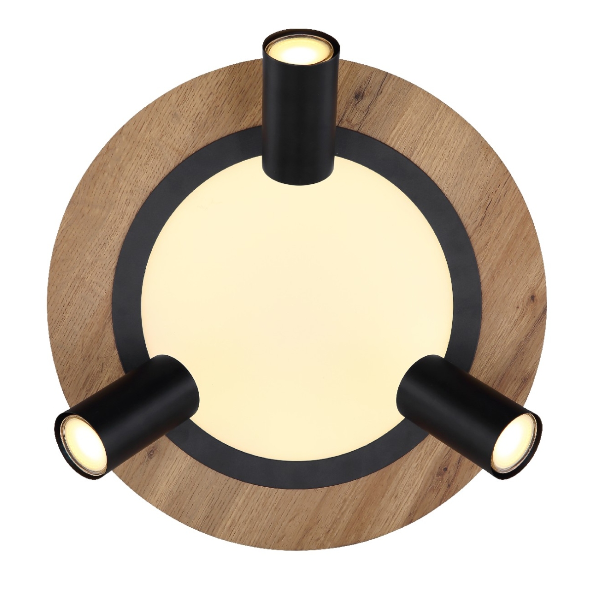 Ova sjajna plafonska lampa inspiriše svojim sjajnim dizajnom. LED panel se nalazi na sredini okrugle drvene ploče (Ø40cm) sa tri dodatne sijalice. LED panel obezbeđuje prijatno 3000 Kelvina toplo belo svetlo i ima snagu od 15W. Funkcija memorije vam omogućava da zadržite poslednje korišćene postavke.