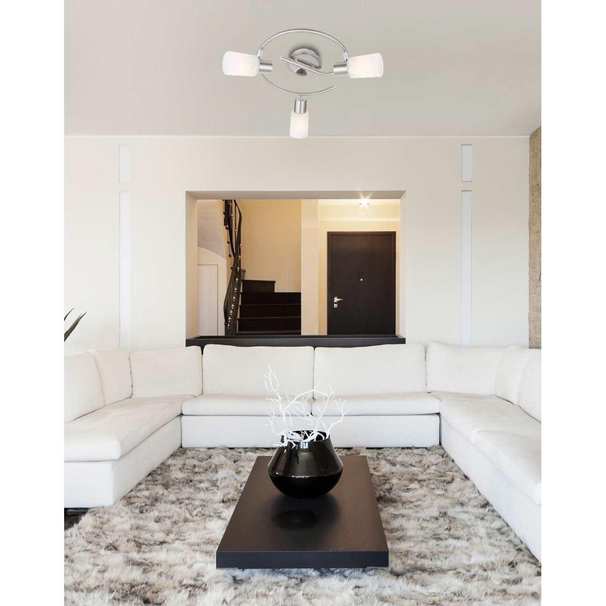 Moderni nikl mat i u isto vreme hromirani plafonski reflektor pogađa svojim dizajnom i belim staklom u alabaster izgledu. Tri prelepa spota, prikačena na granu u obliku slova e, svaki ima E14 grlo. Tako sijalice, a samim tim i boju svetla i svetli intenzitet možete odrediti vi (max.40W). Zbog uštede energije i trajnosti preporučujemo LED sijalice. Uz ostale lampe iste serije, sliku možete upotpuniti u svom dnevnim boravku.